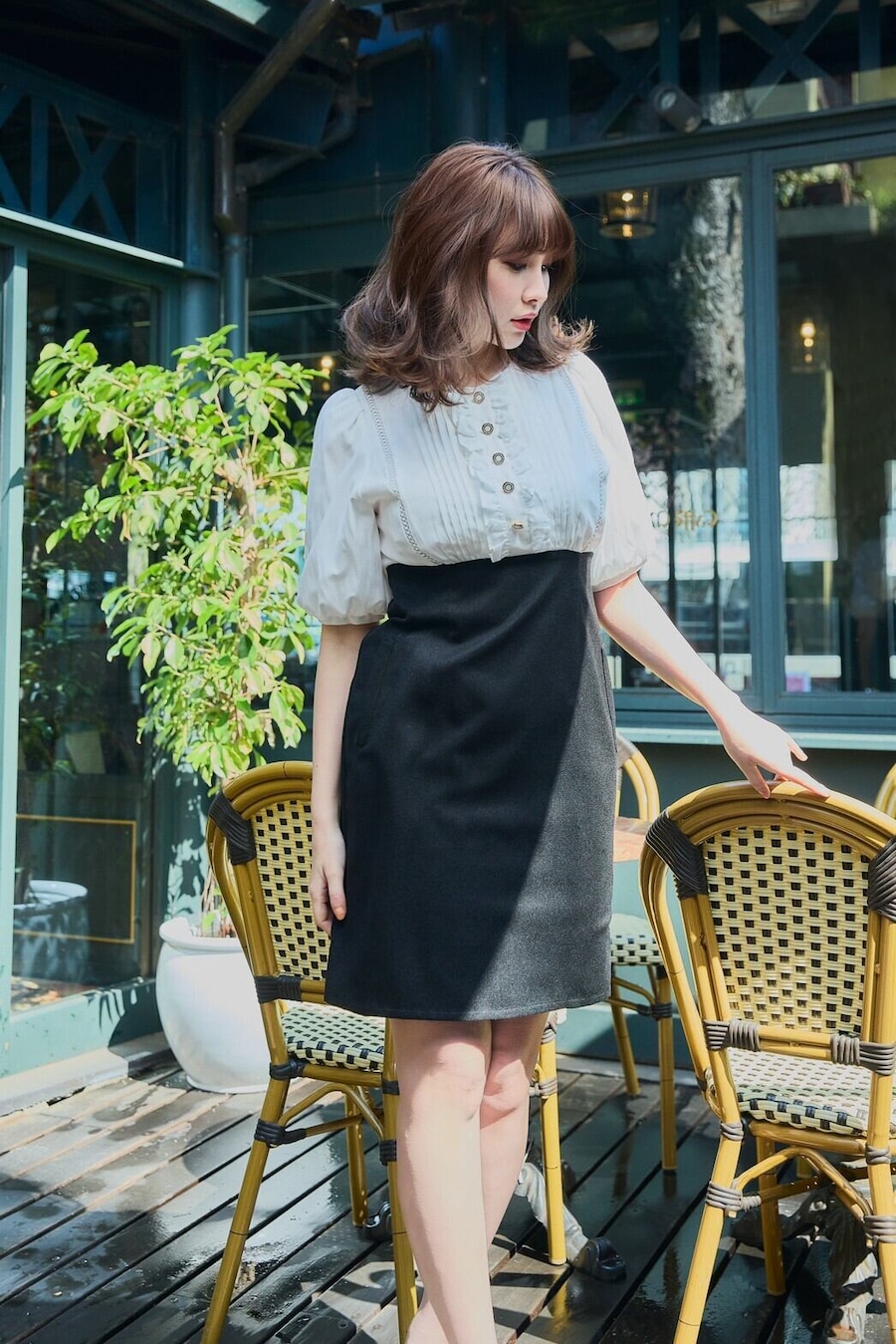 コーディネートしてるかのように高めの位置に設定されたウエストにはギャザーを配しています。