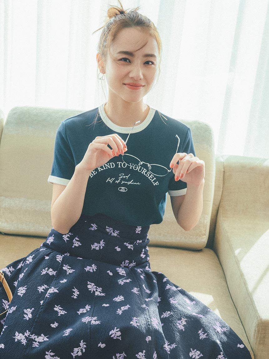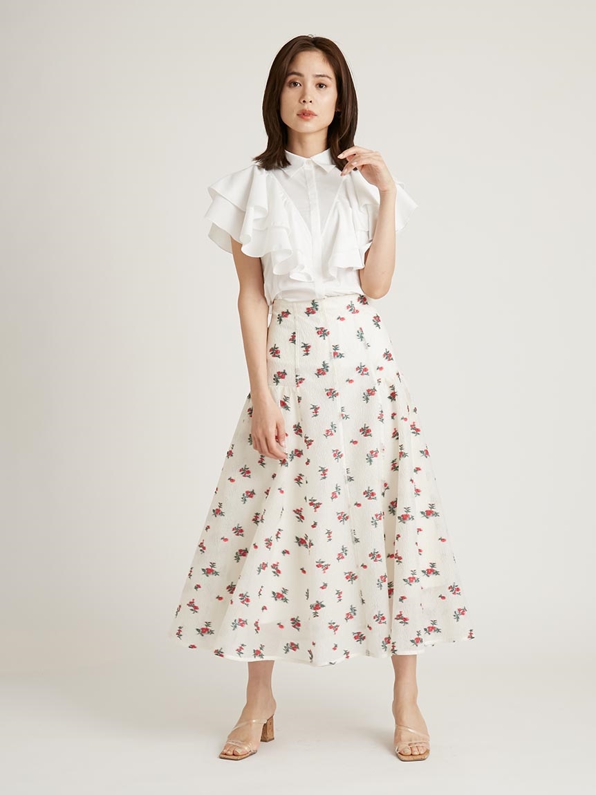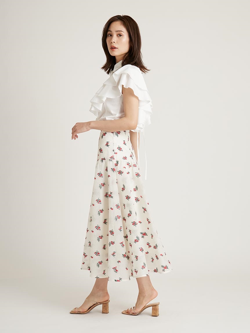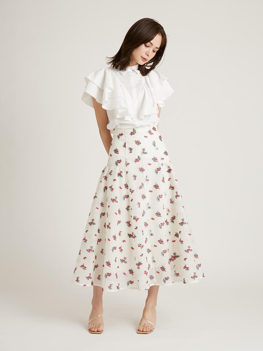 オリジナルのジャカード模様で華やかに仕上げたロングスカート。すっきりとした腰回りからサイドにボリュームを持たせたフレアラインで、女性らしさは一気に加速。1枚で主役級の存在感を放つデザインなので、シンプルなトップスと合わせてもお洒落に決まります。同素材を用いたブラウスとセットアップでワンピースライクに着こなすのもオススメ。