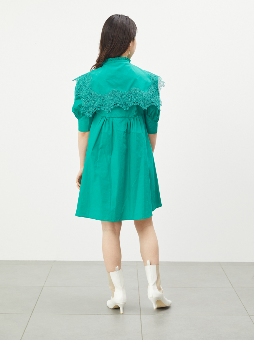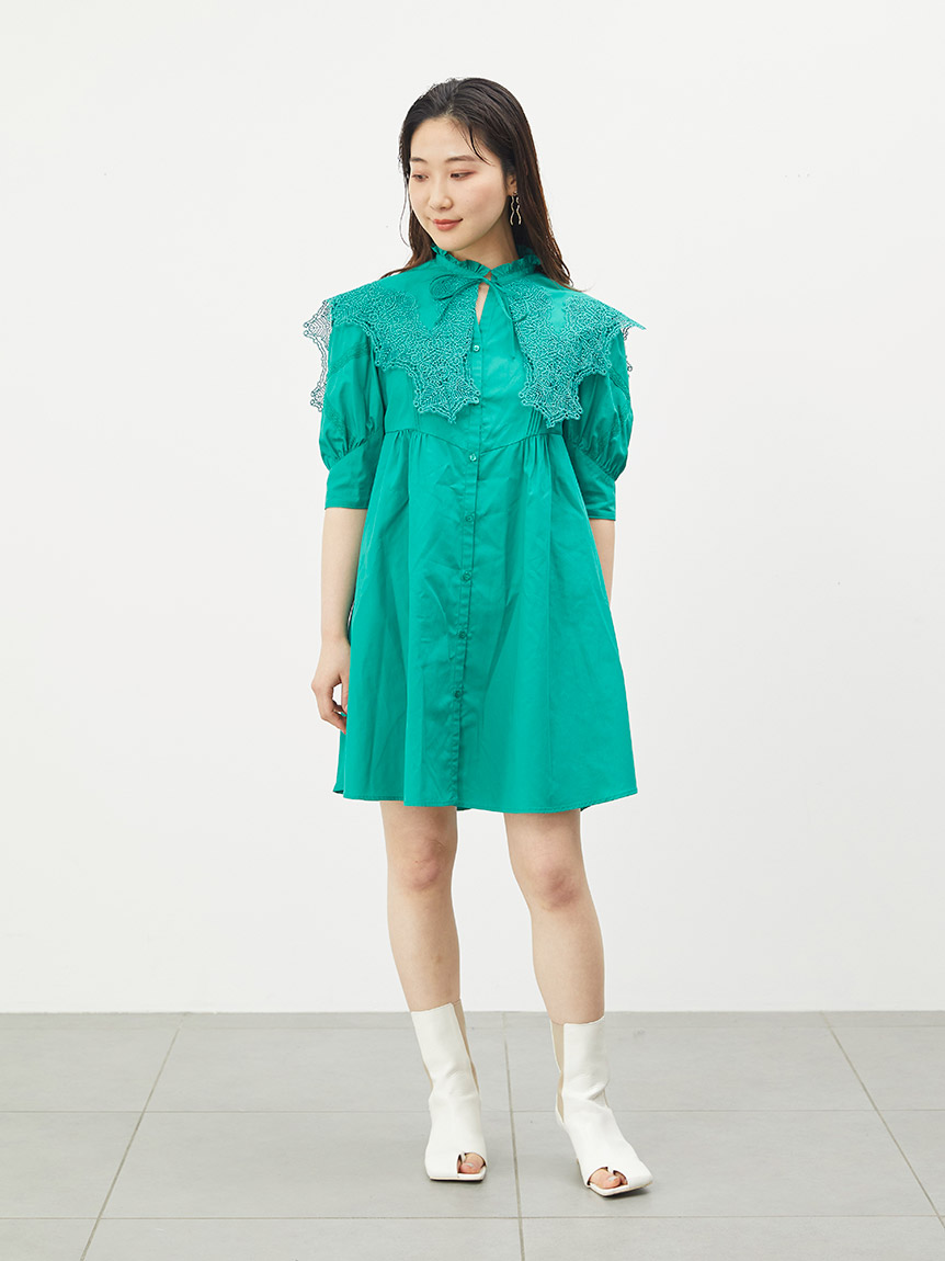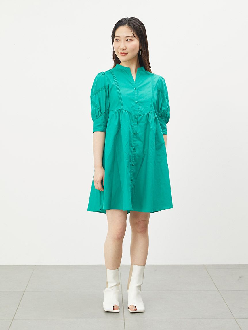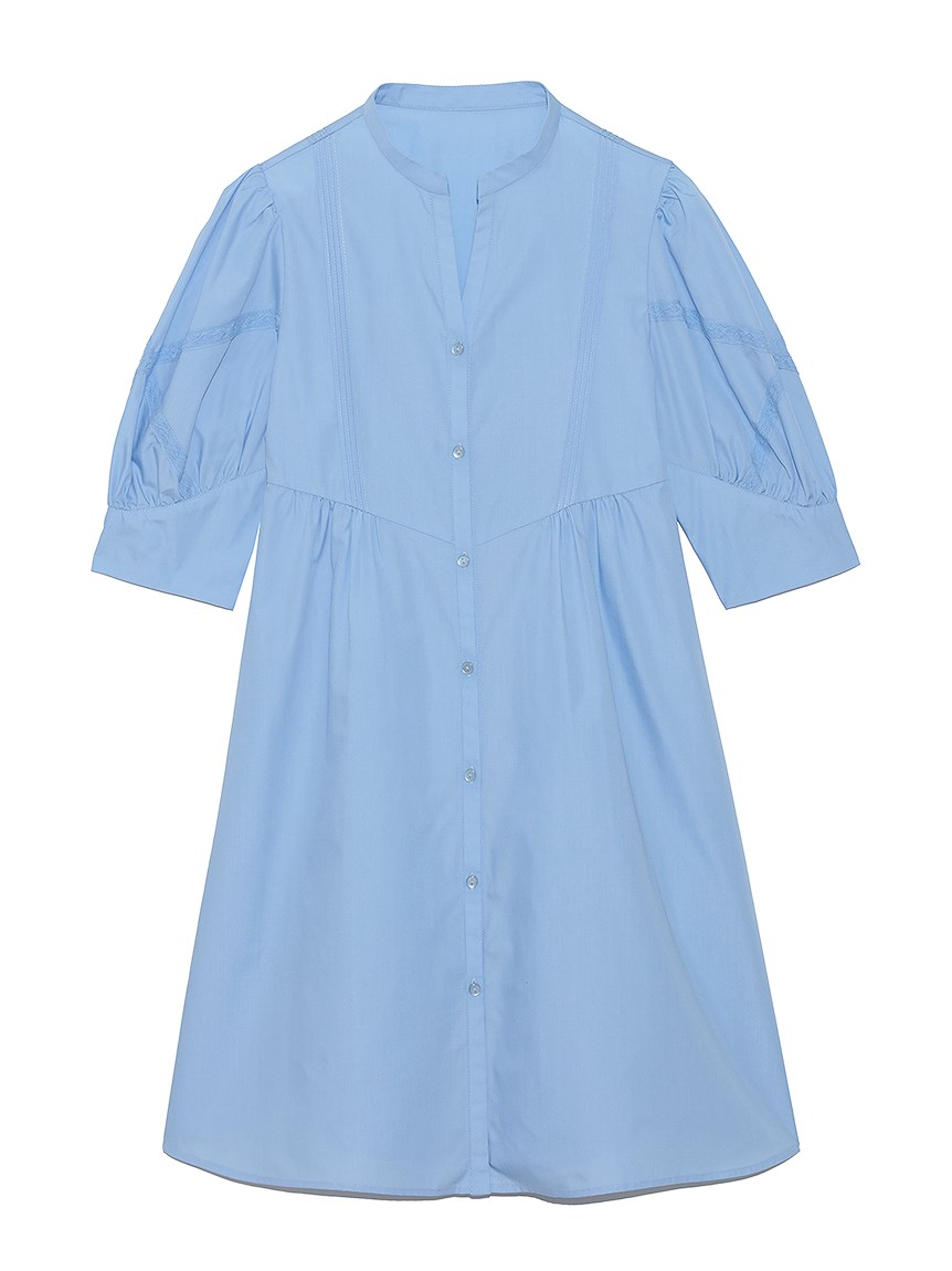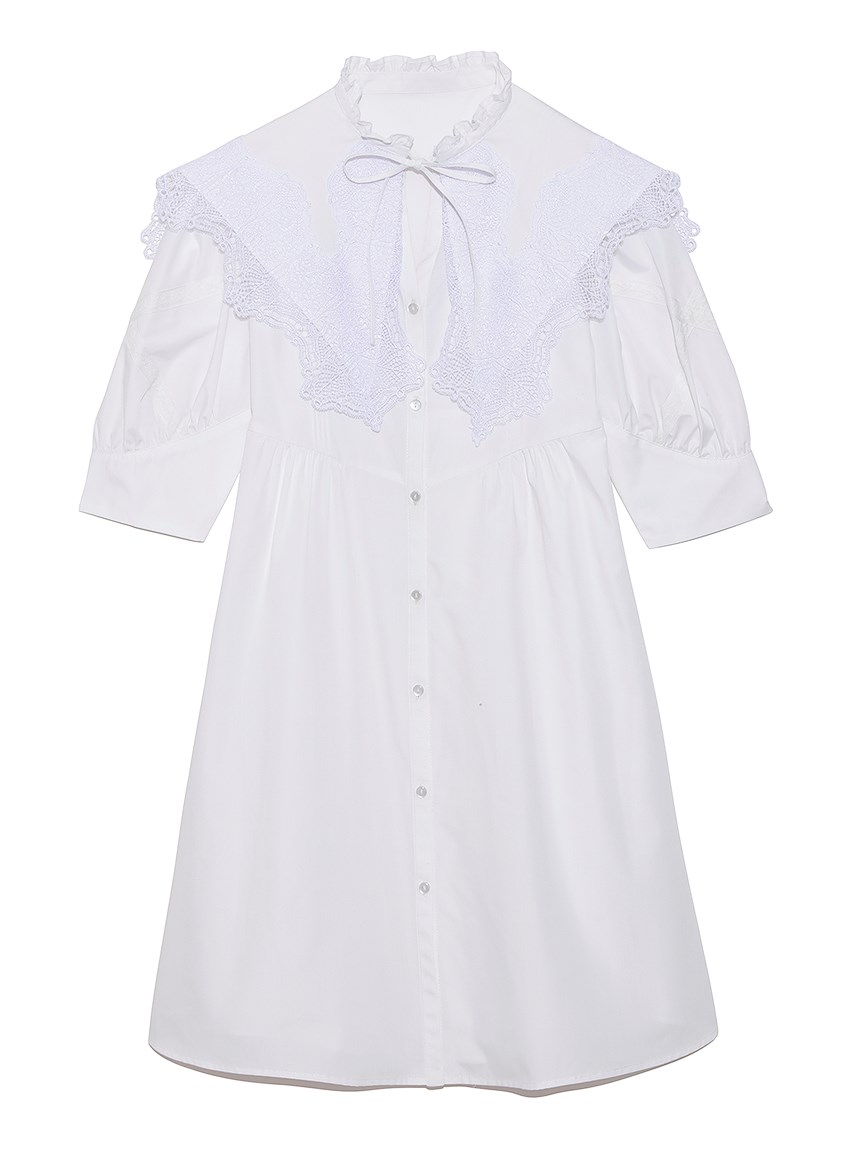 襟つきのレイヤードデザインが特徴的な、クラシカルでトレンド感が香るシャツワンピース。襟を外しても、袖にあしらわれたテープレースや切り替えなど抜かりのないディティールで単体としても着用していただきやすいデザインに仕上げました。袖の程よいパフ感と裾にかけて広がるフレアシルエットで春らしい着こなしが楽しめるアイテムです。