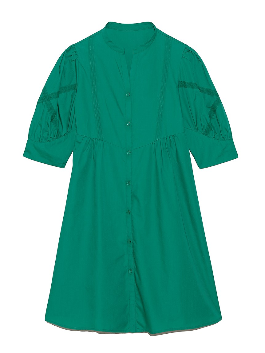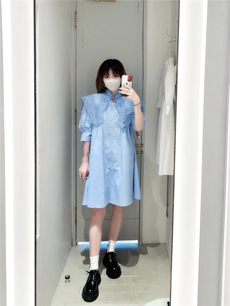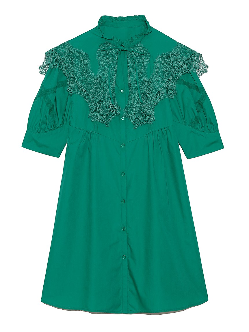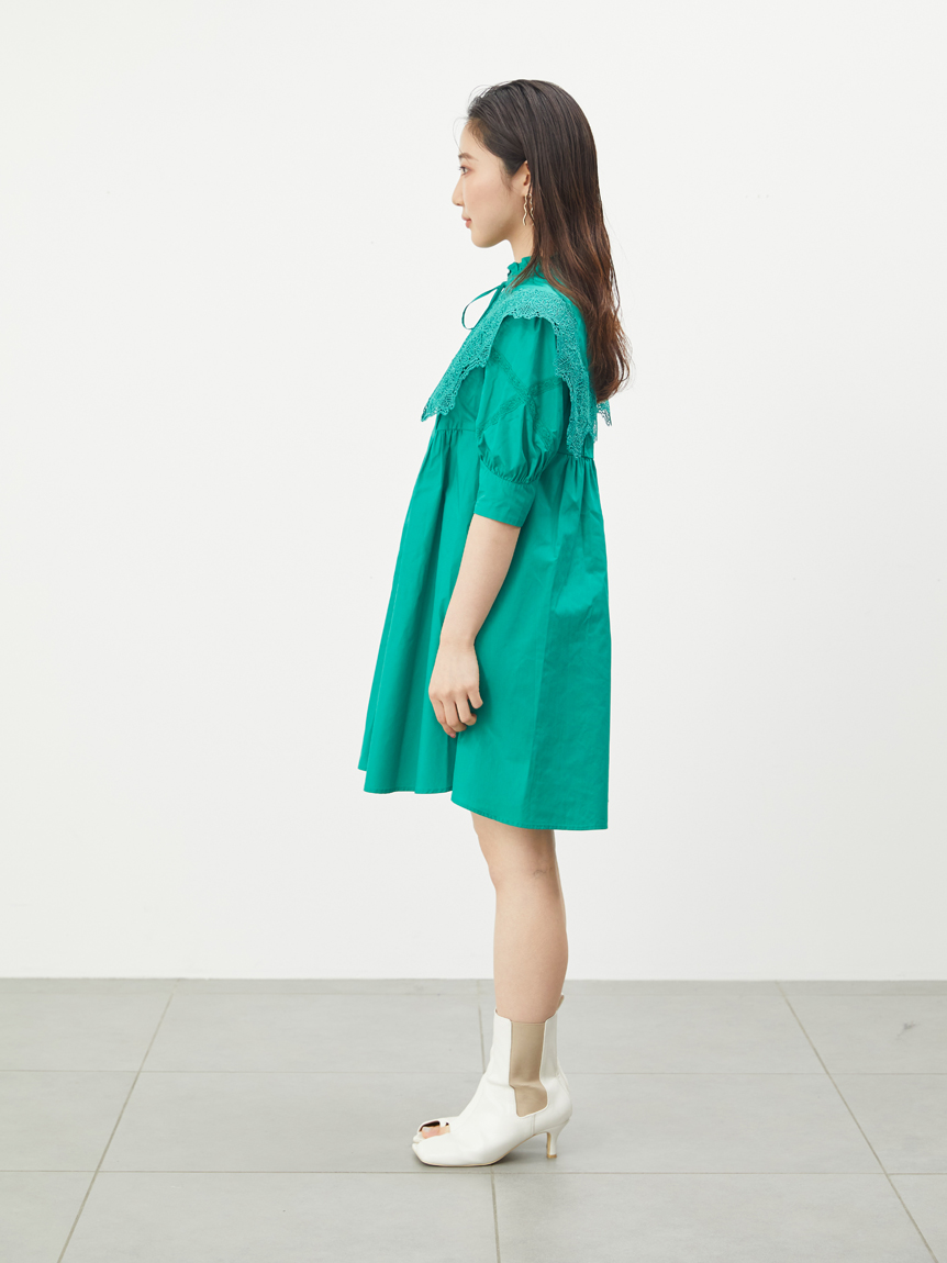 襟つきのレイヤードデザインが特徴的な、クラシカルでトレンド感が香るシャツワンピース。襟を外しても、袖にあしらわれたテープレースや切り替えなど抜かりのないディティールで単体としても着用していただきやすいデザインに仕上げました。袖の程よいパフ感と裾にかけて広がるフレアシルエットで春らしい着こなしが楽しめるアイテムです。