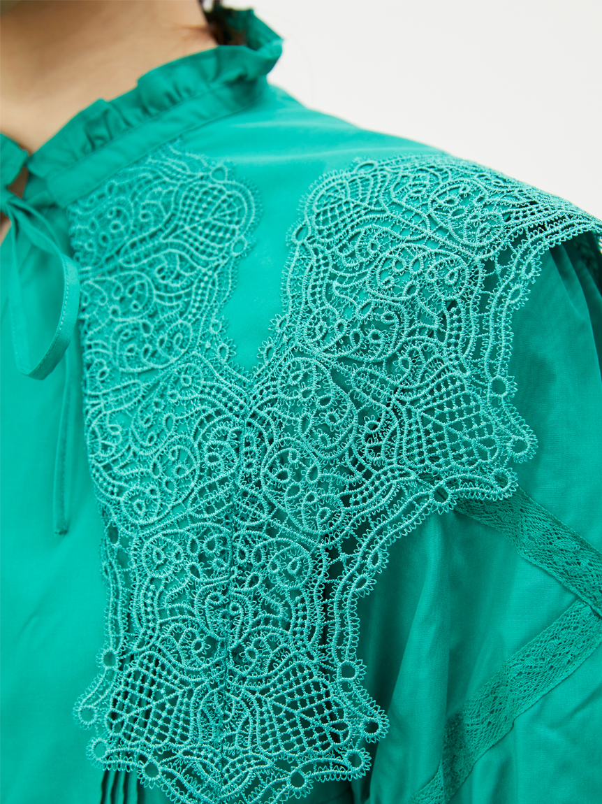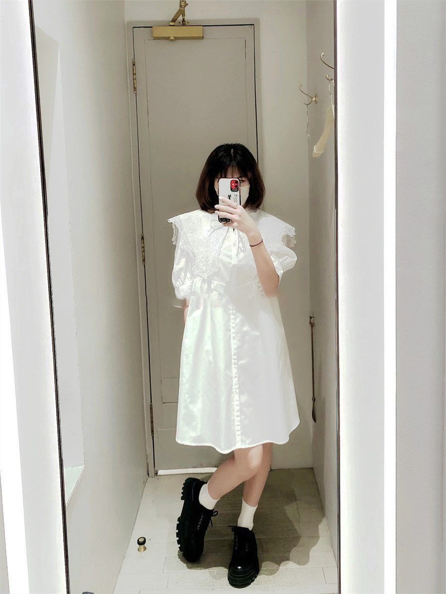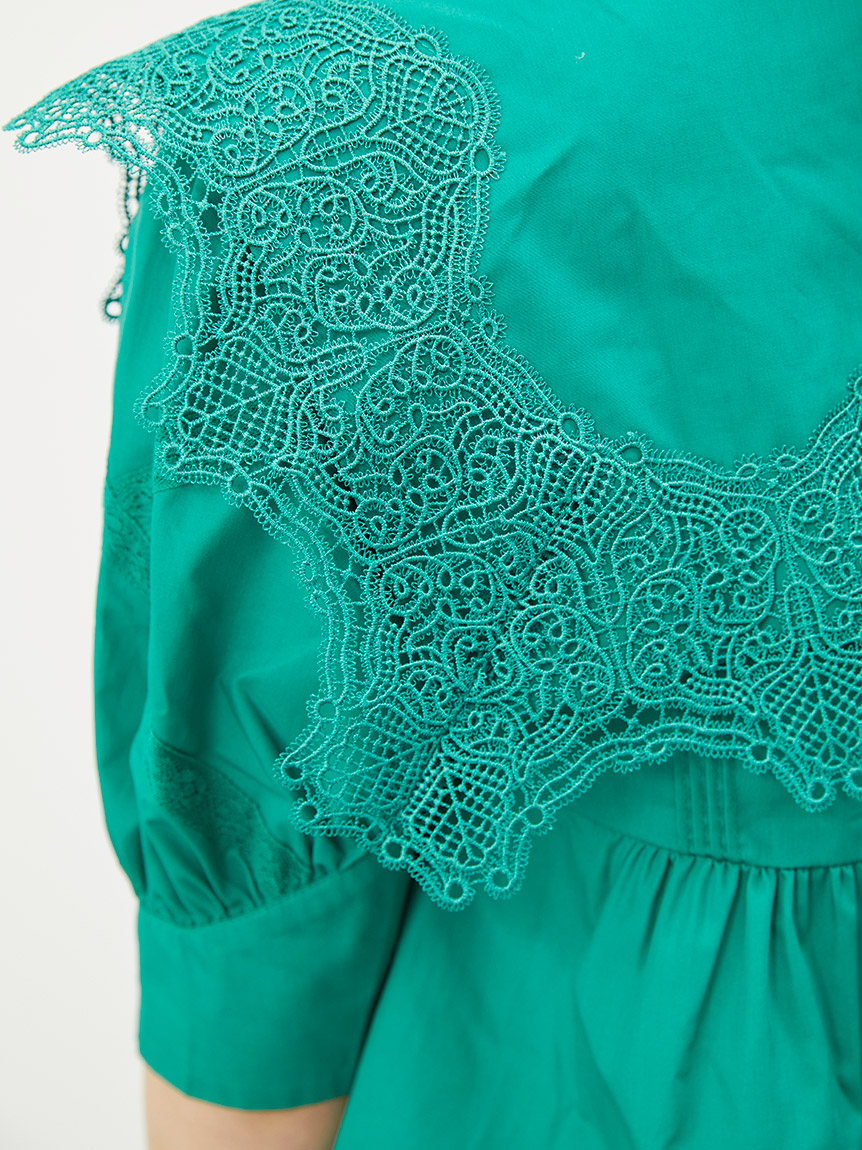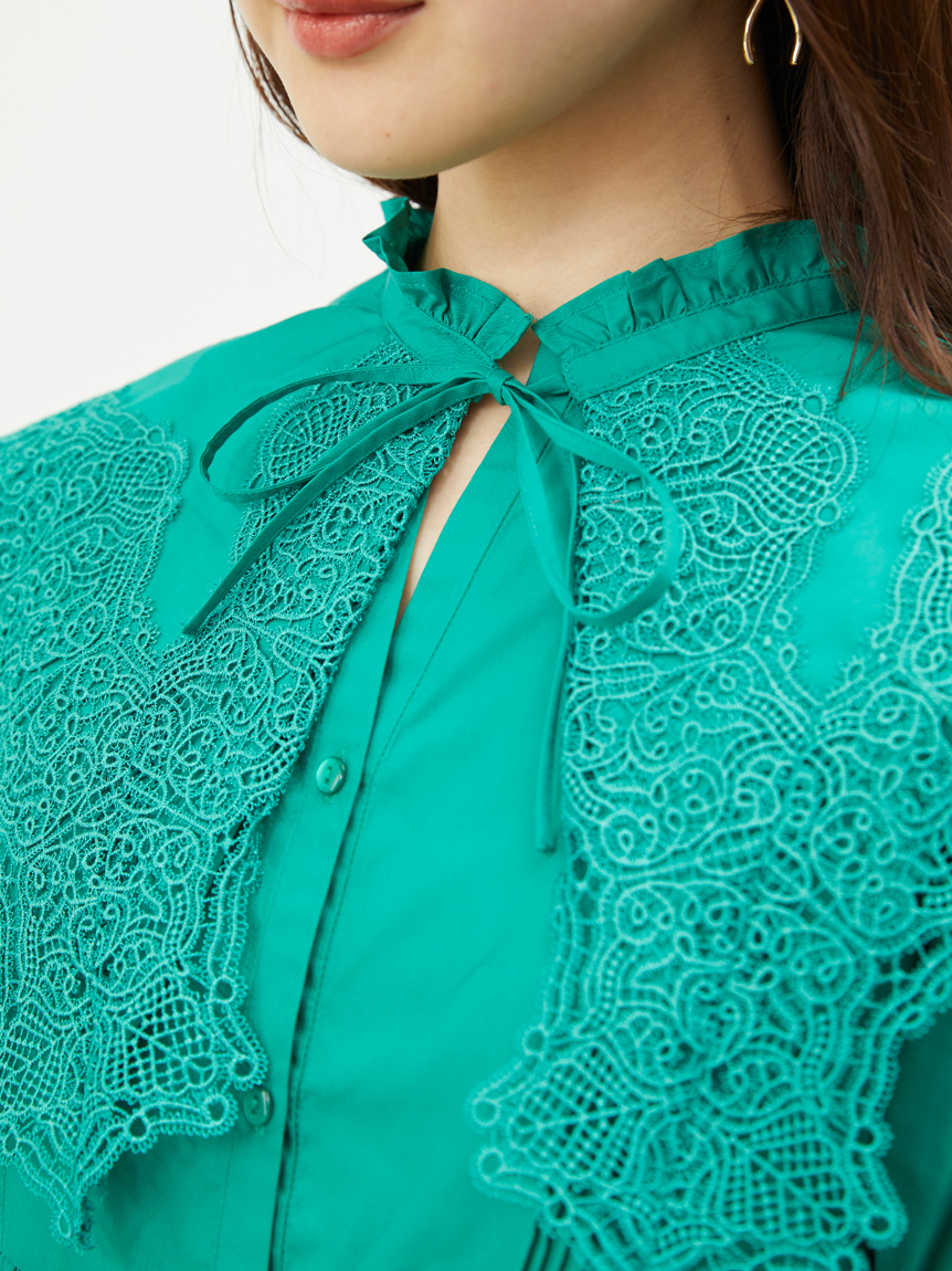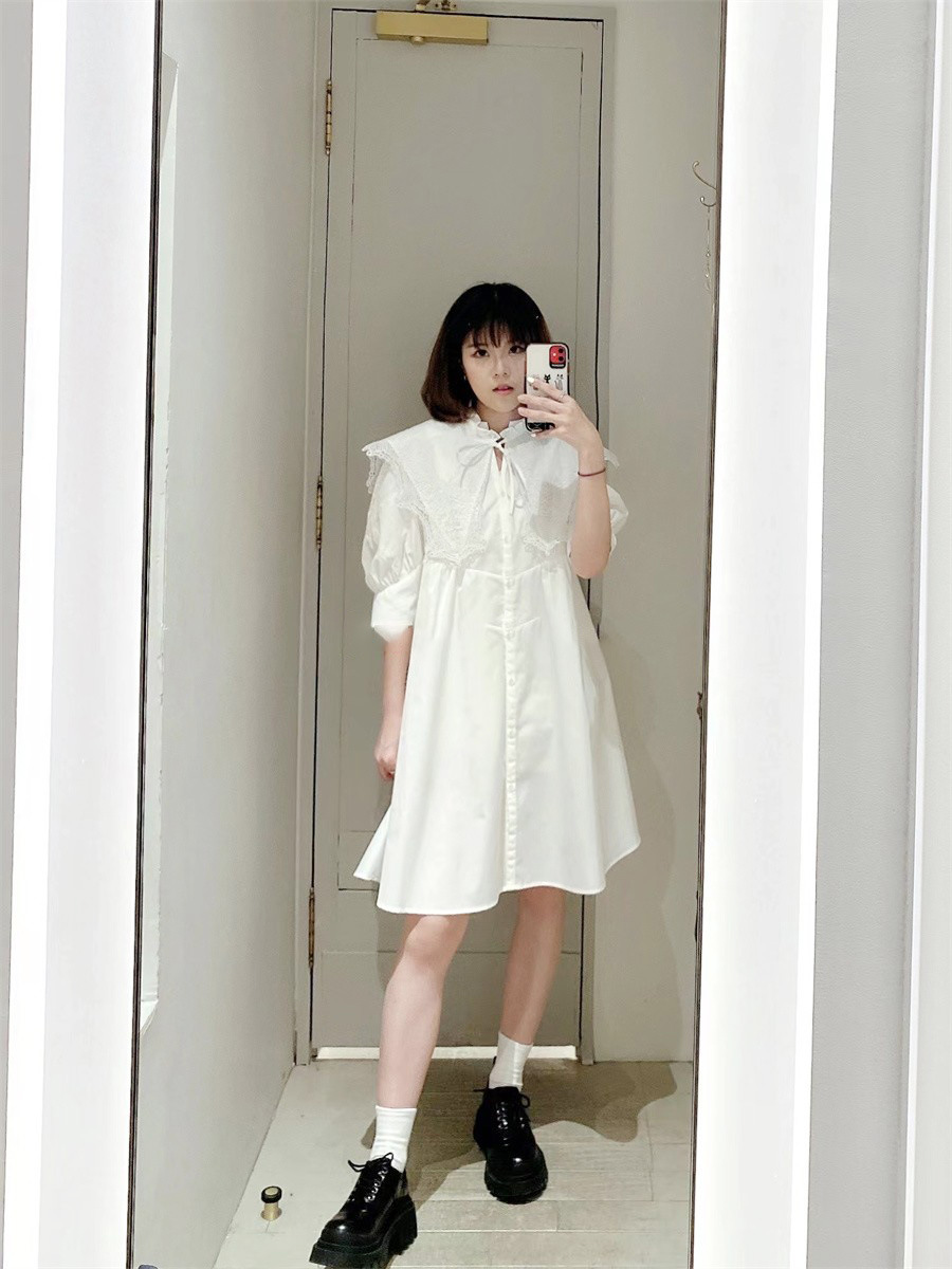 襟つきのレイヤードデザインが特徴的な、クラシカルでトレンド感が香るシャツワンピース。襟を外しても、袖にあしらわれたテープレースや切り替えなど抜かりのないディティールで単体としても着用していただきやすいデザインに仕上げました。袖の程よいパフ感と裾にかけて広がるフレアシルエットで春らしい着こなしが楽しめるアイテムです。