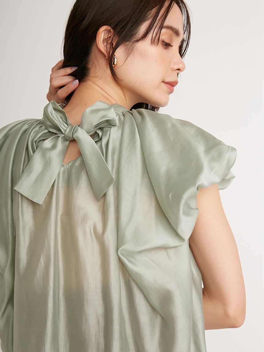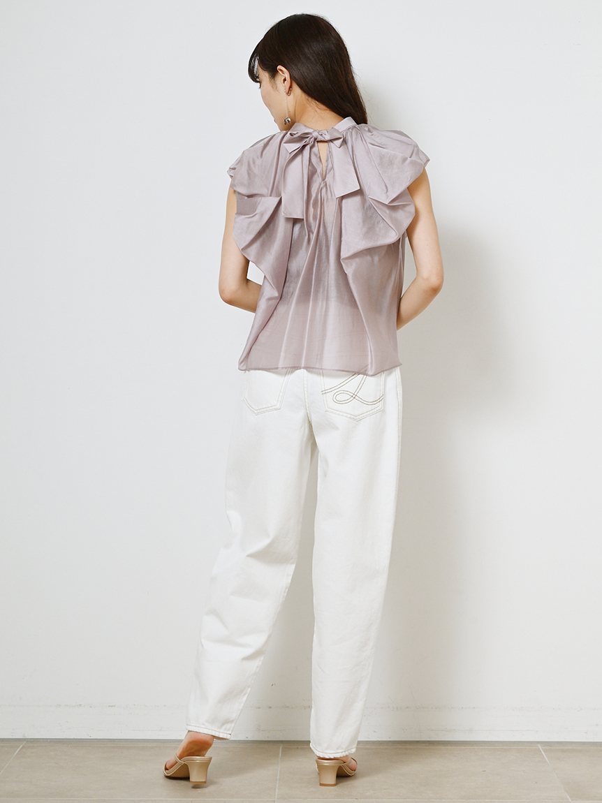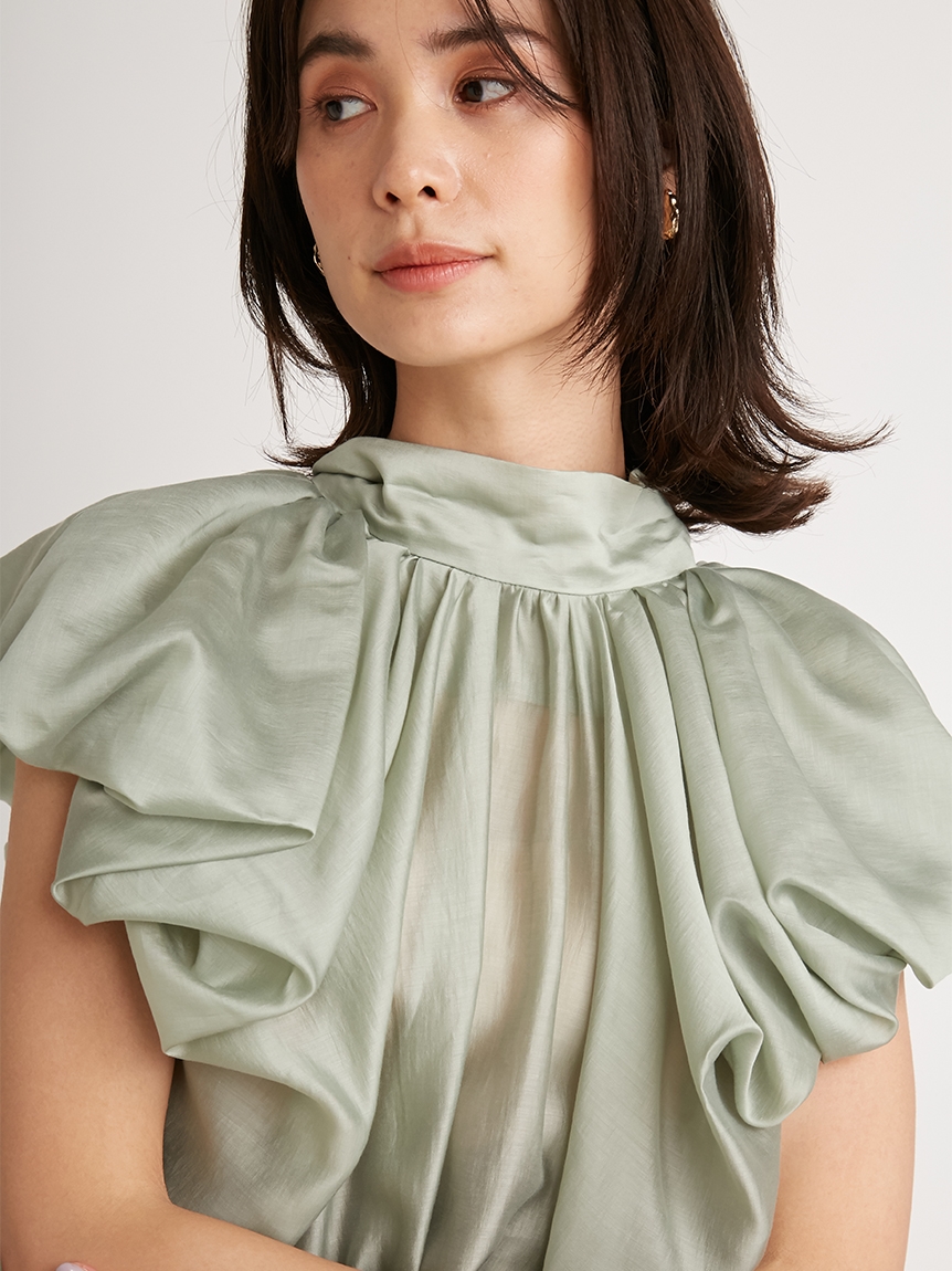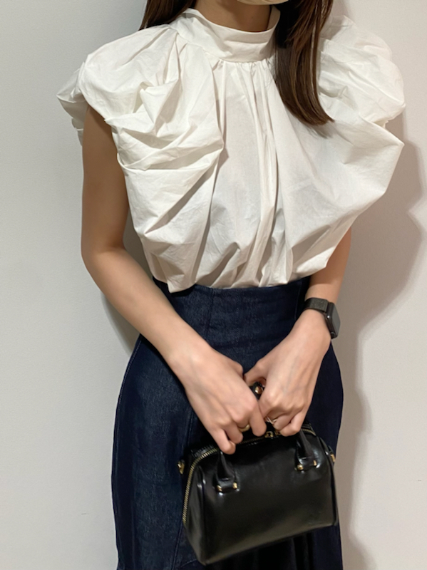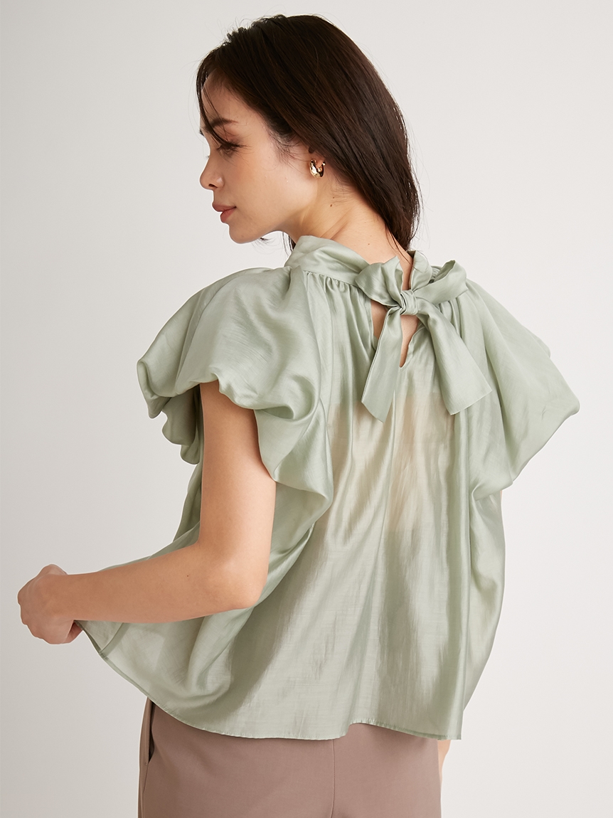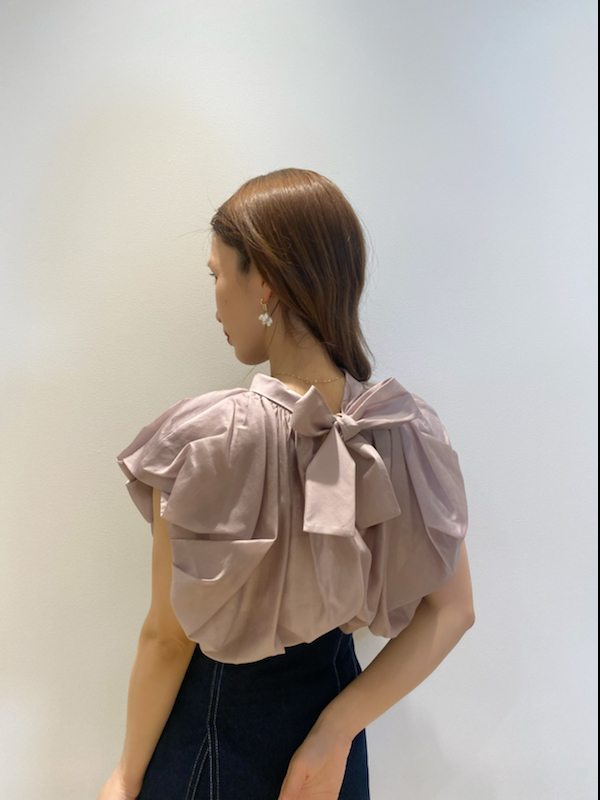 バルーンで表現した立体的なフリルスリーブが特徴。ふんわりとしたボリュームフォルムで今年らしいフェミニンスタイルに似合うブラウス。バックネックでキュッと結んだリボンが後ろ姿まで愛らしく演出。ハイウエストボトムにINしてスマートにまとめるのがトレンドライクに決まる秘訣です。