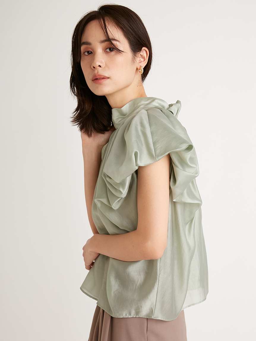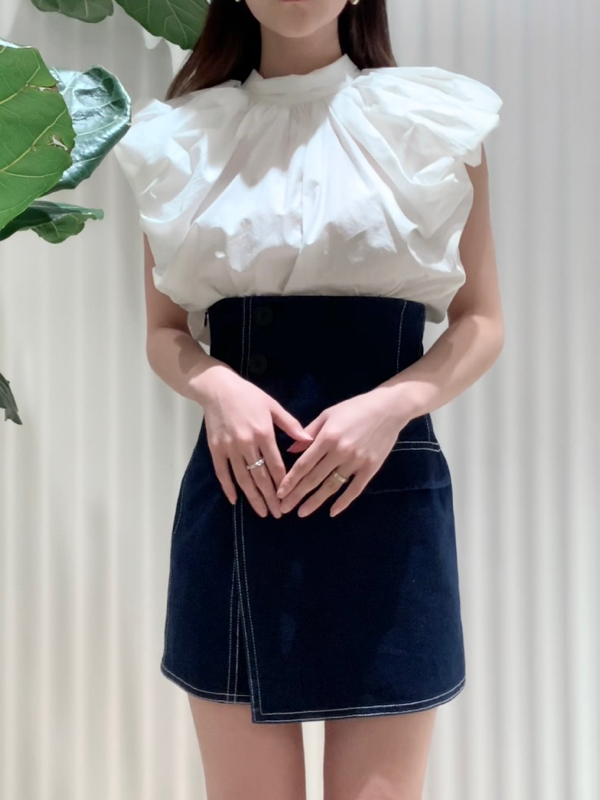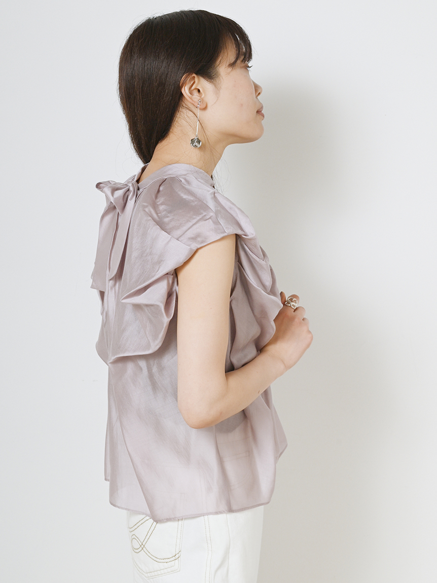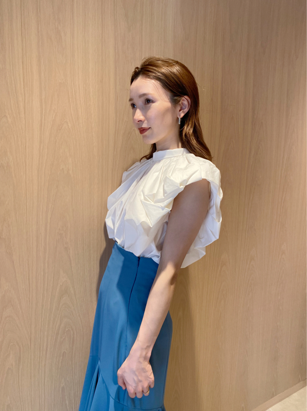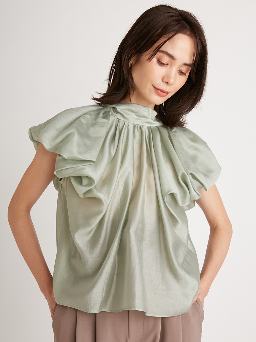 バルーンで表現した立体的なフリルスリーブが特徴。ふんわりとしたボリュームフォルムで今年らしいフェミニンスタイルに似合うブラウス。バックネックでキュッと結んだリボンが後ろ姿まで愛らしく演出。ハイウエストボトムにINしてスマートにまとめるのがトレンドライクに決まる秘訣です。