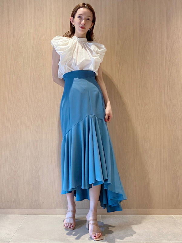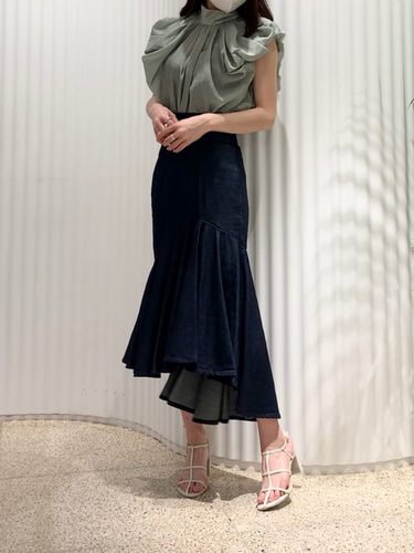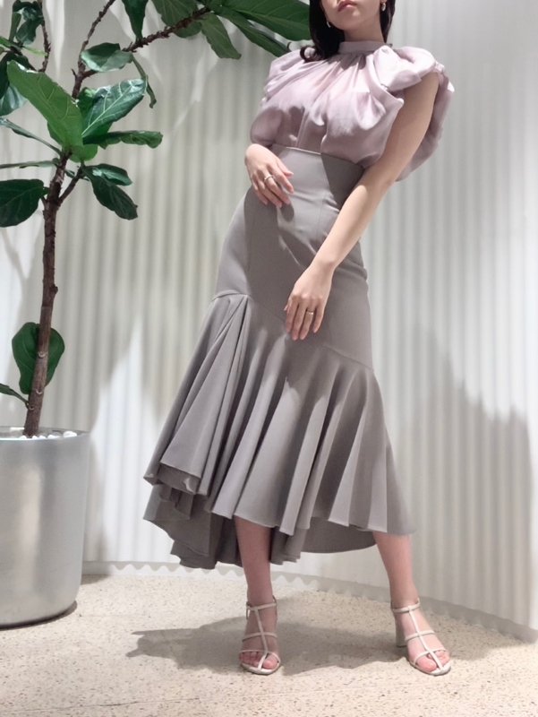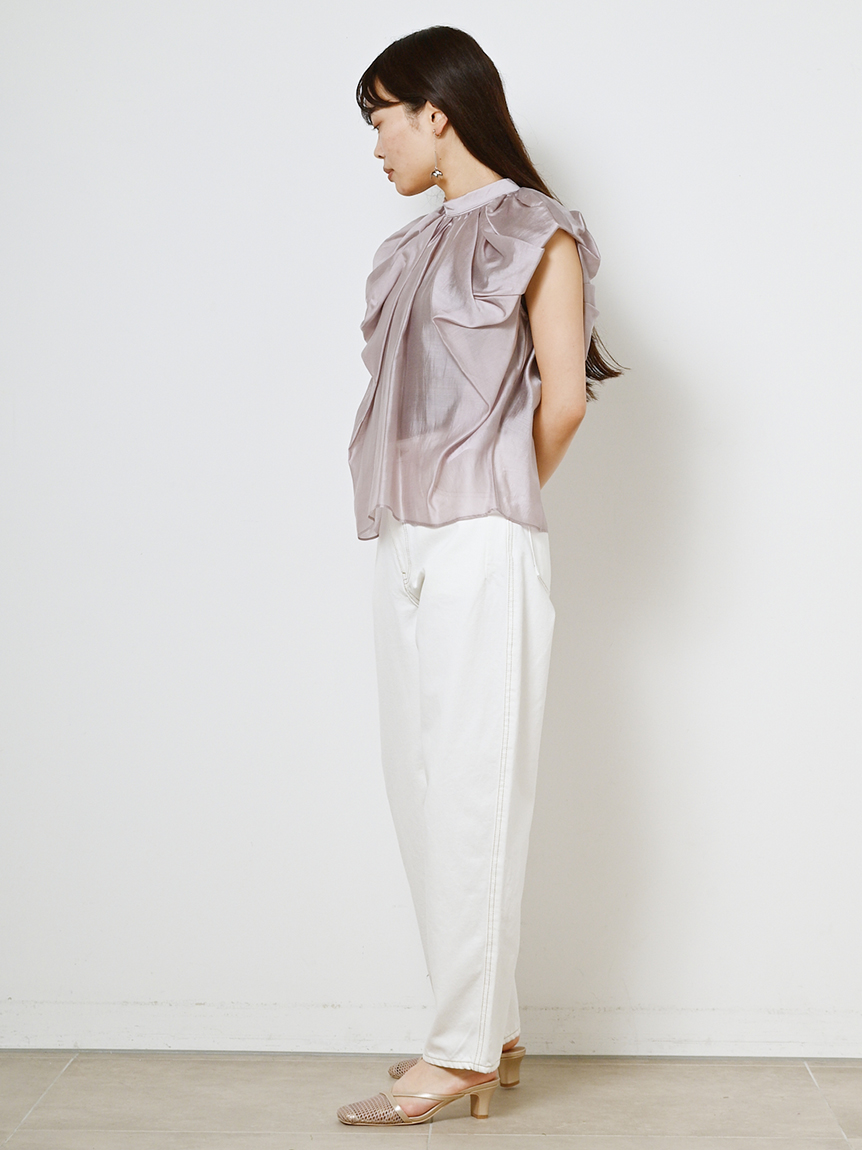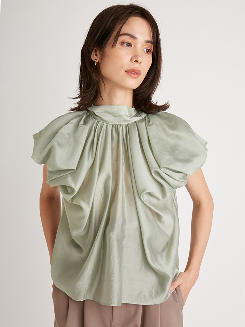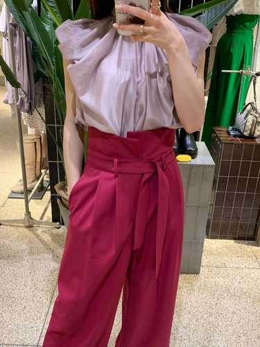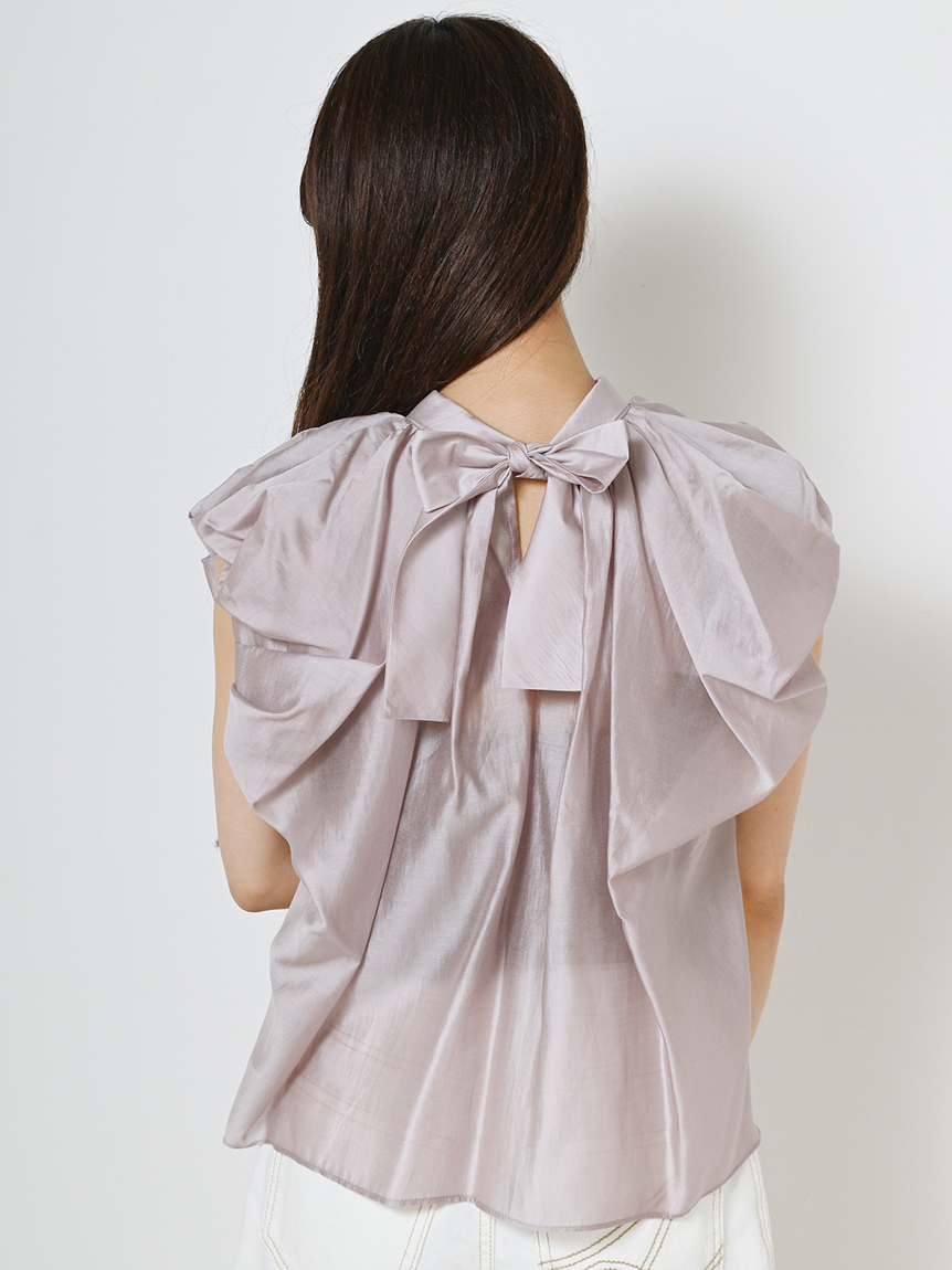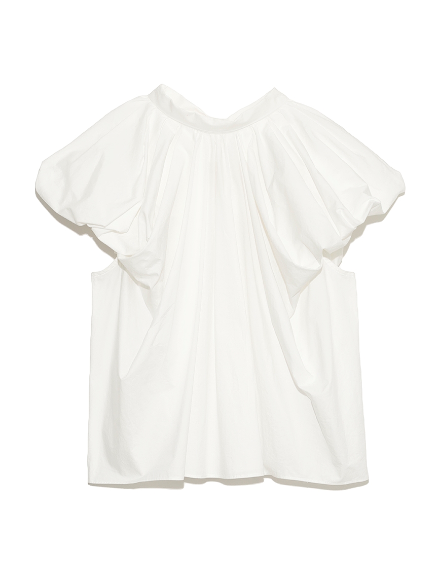 バルーンで表現した立体的なフリルスリーブが特徴。ふんわりとしたボリュームフォルムで今年らしいフェミニンスタイルに似合うブラウス。バックネックでキュッと結んだリボンが後ろ姿まで愛らしく演出。ハイウエストボトムにINしてスマートにまとめるのがトレンドライクに決まる秘訣です。