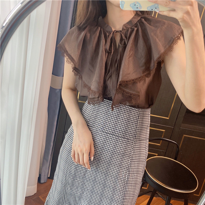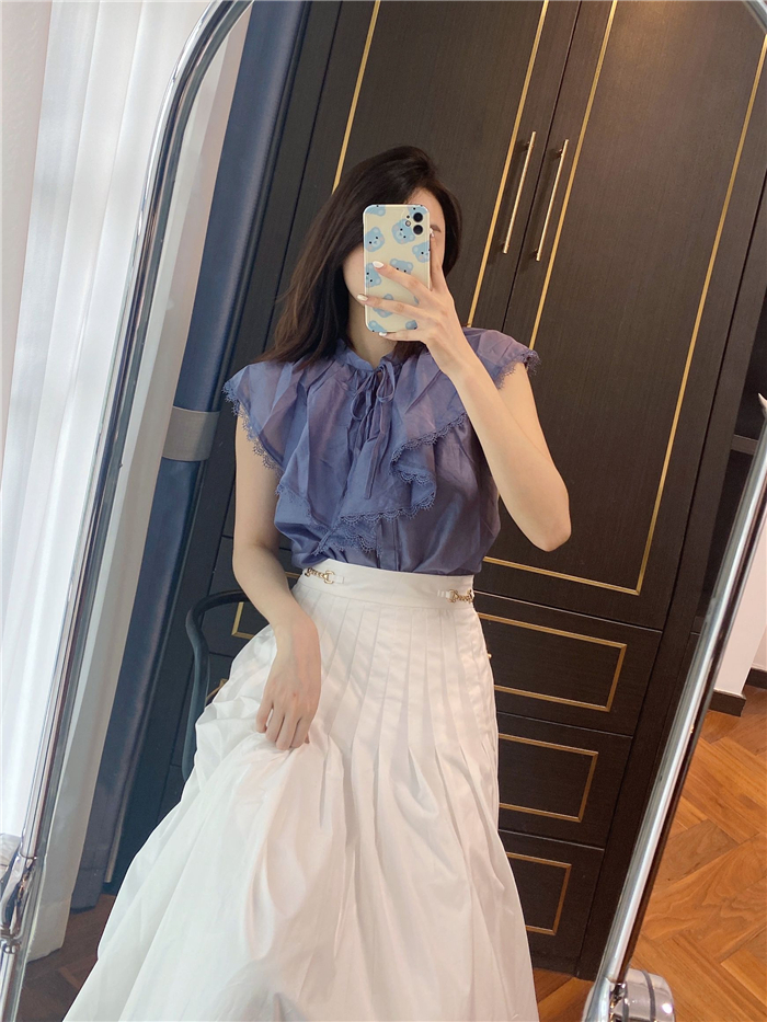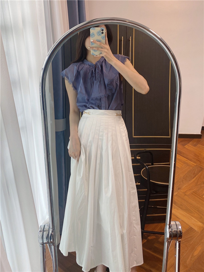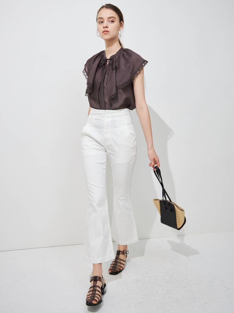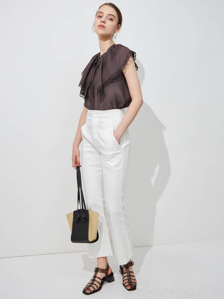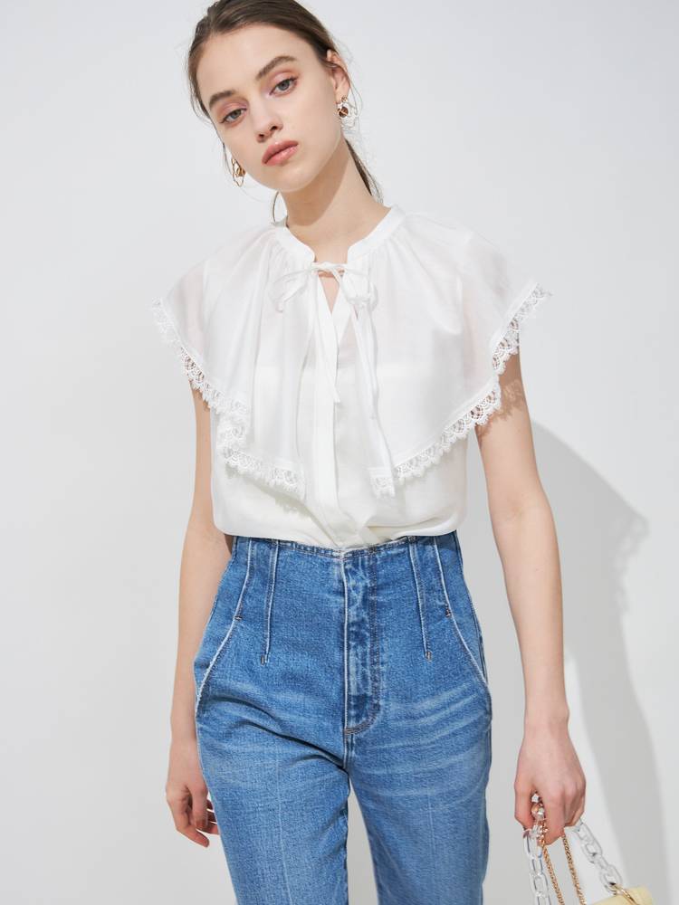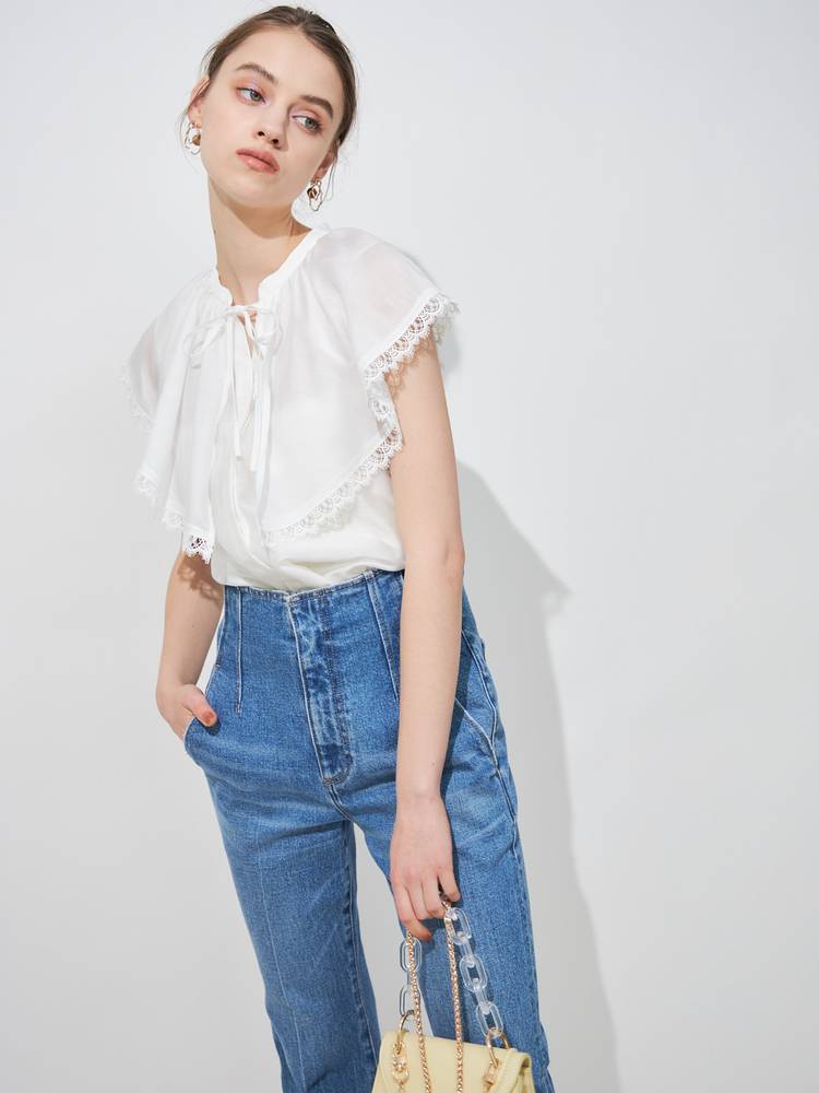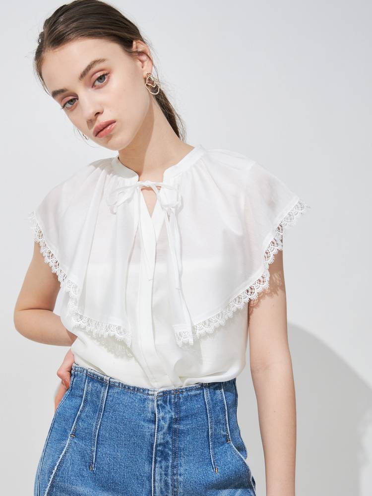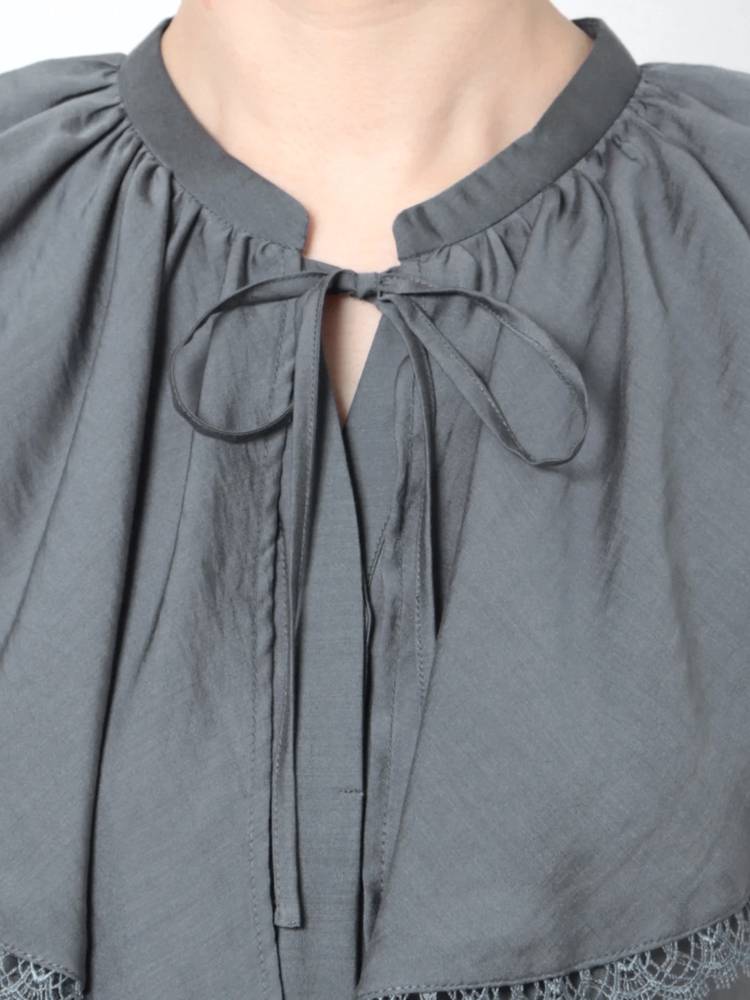 スキッパーの立ち襟でデコルテはすっきり見せつつ、胸元のリボンでフロントにアクセントを。