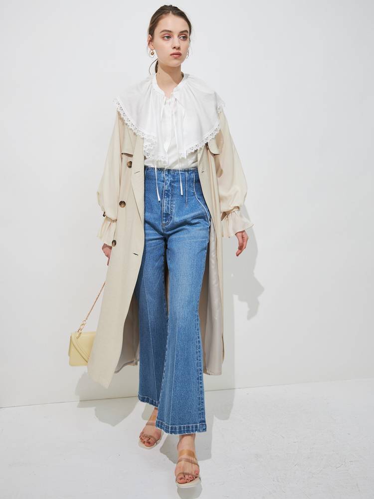 トレンドのボリュームラッフルは、合わせたジャケットやトレンチなどから襟を出して着こなすのが今年っぽいスタイリング。