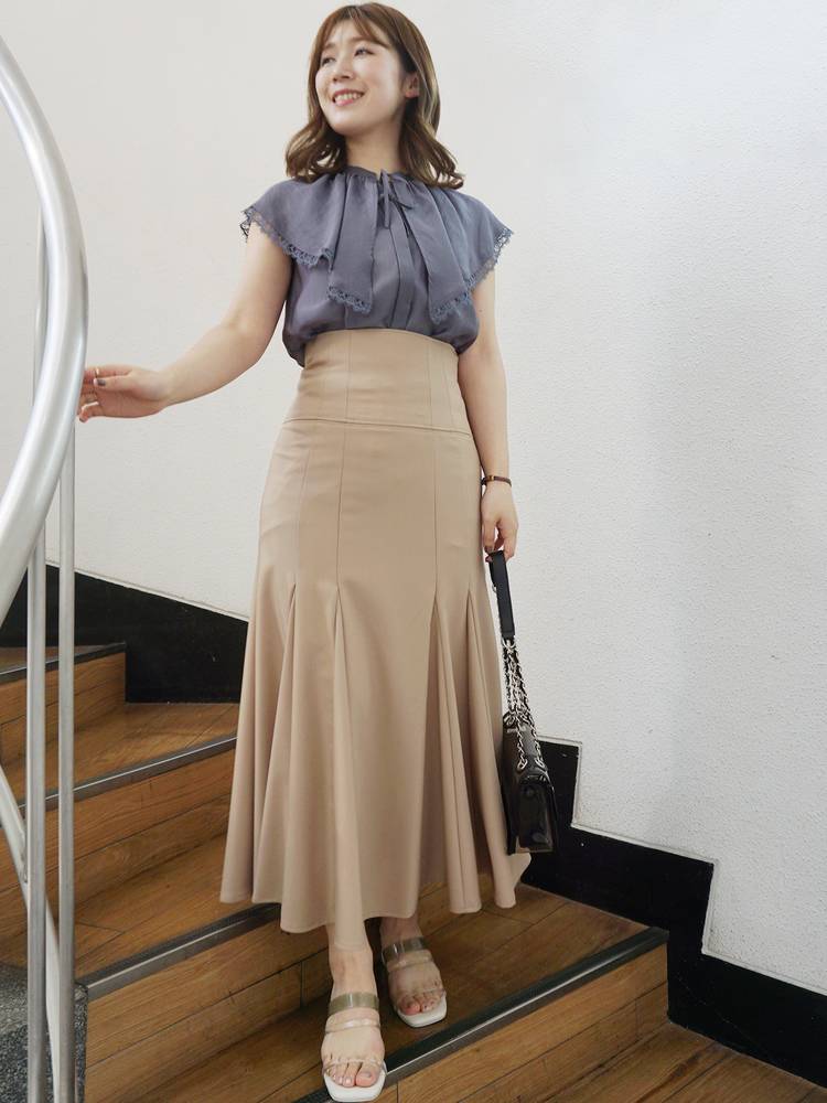 上半身にボリュームがあるので、ボトムはパンツや、タイトスカート、