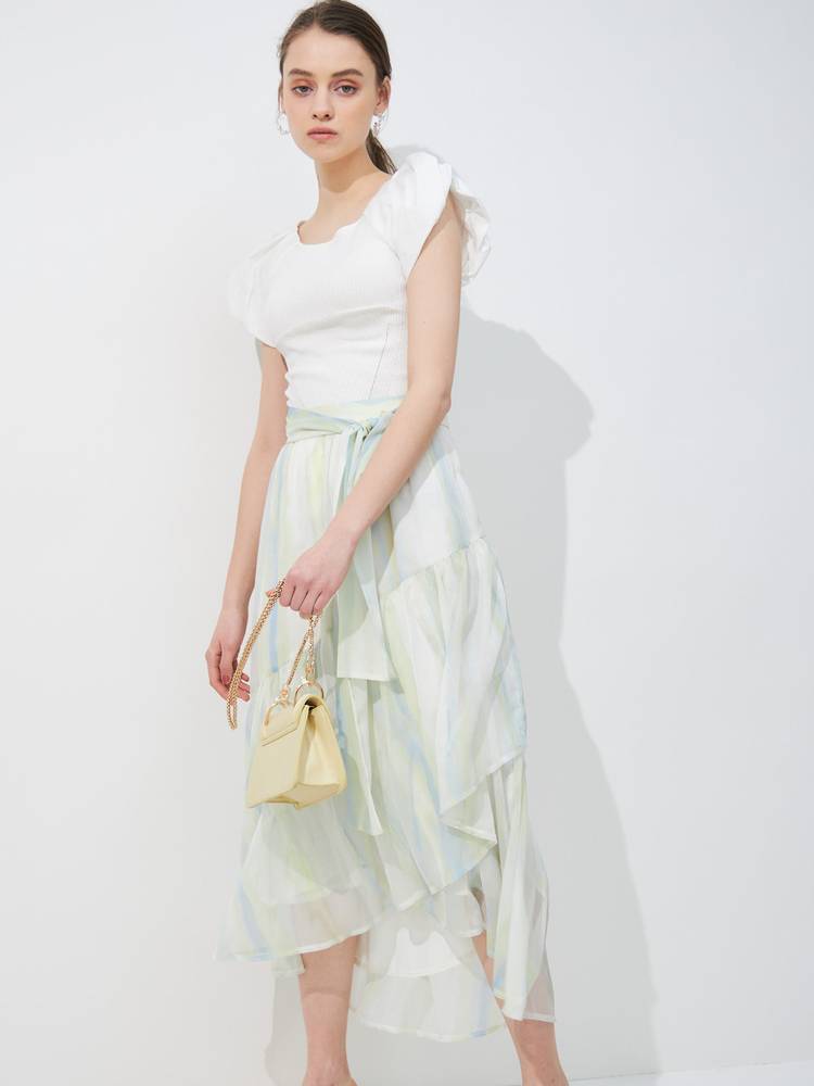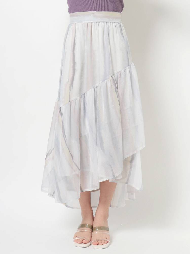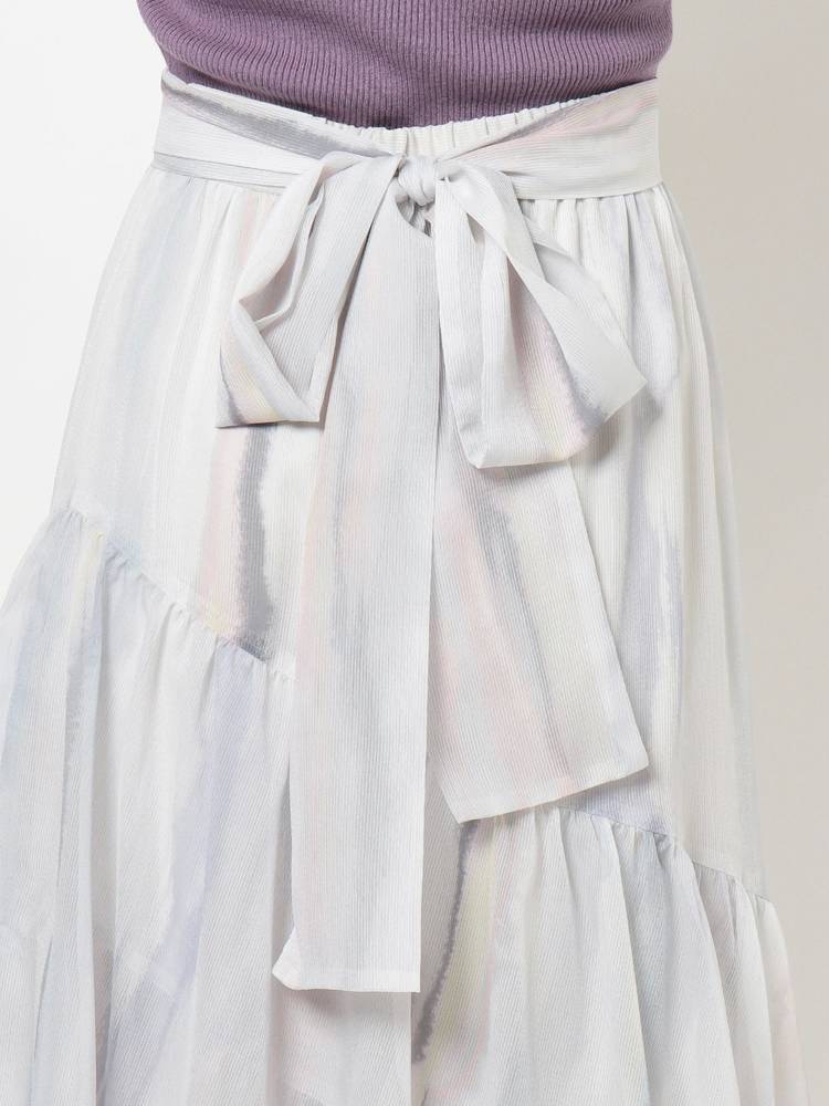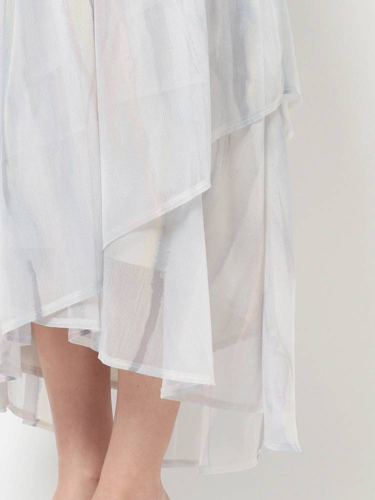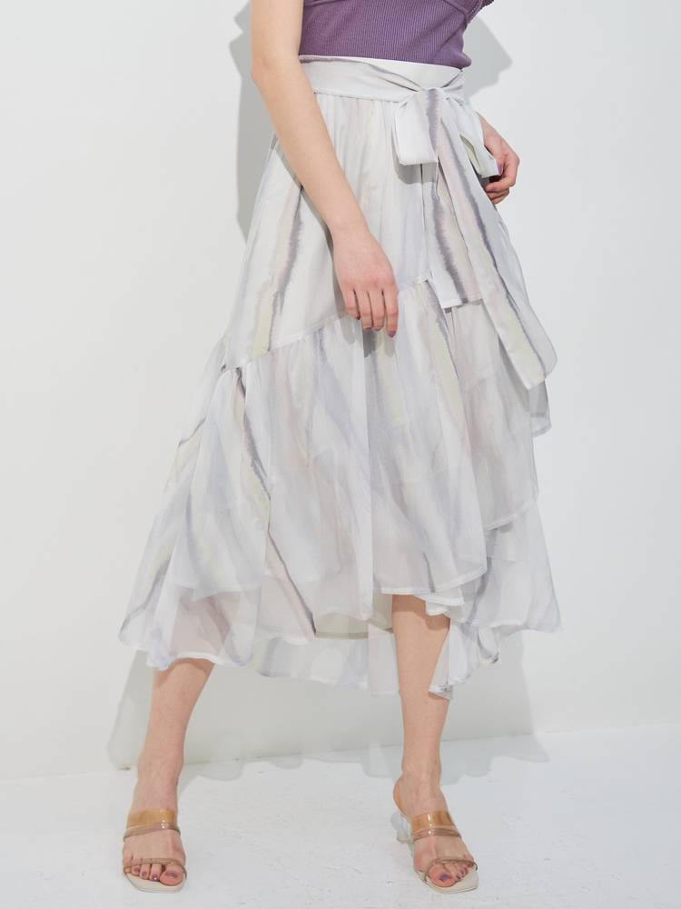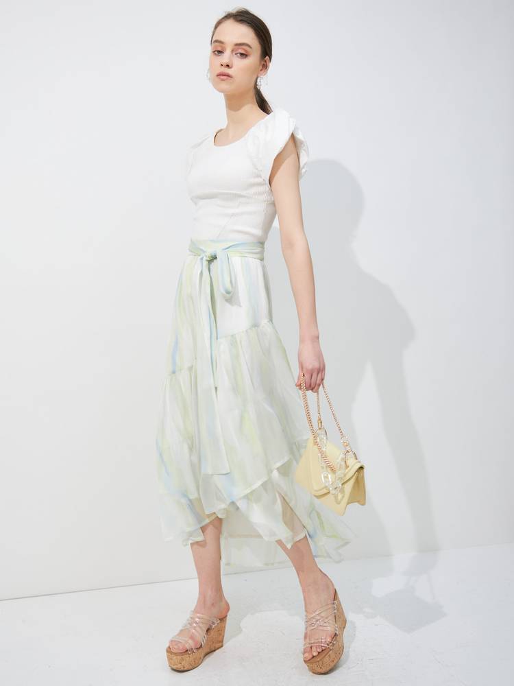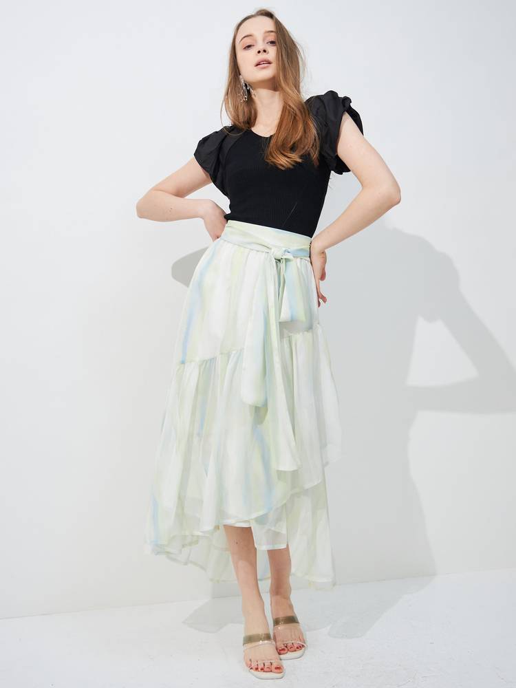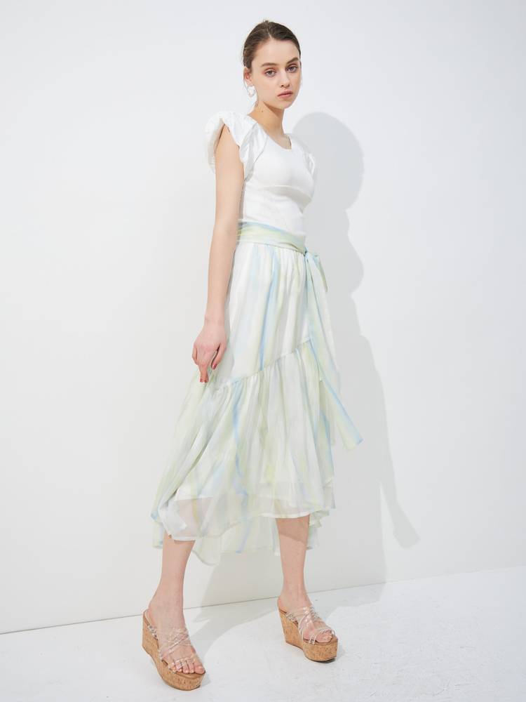 ストライプ見えの繊細で軽やかな楊柳シフォンに、オリジナルのグラデーションペイントを施した特別感のあるスカート。