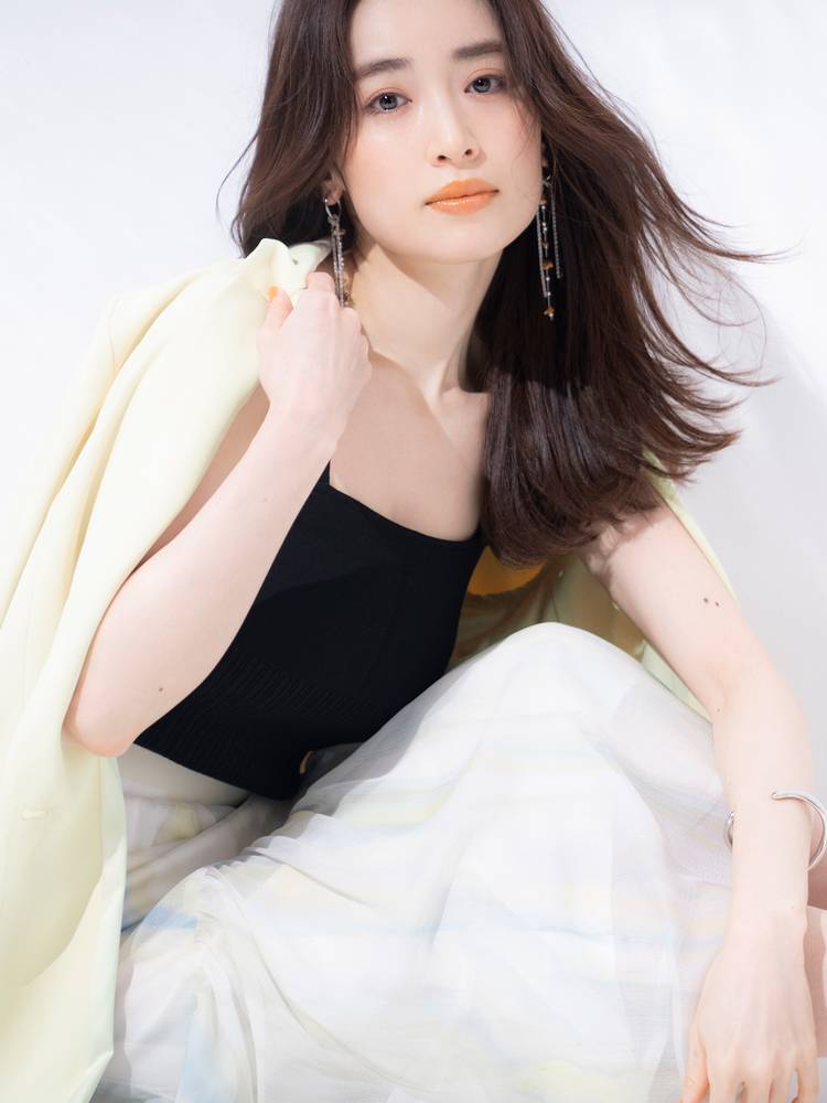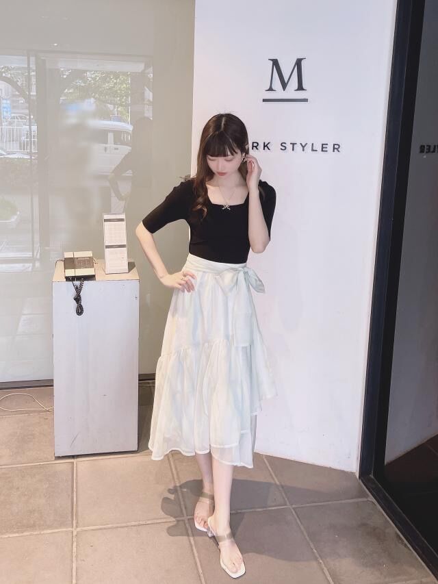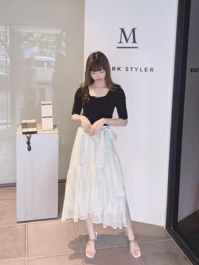 マルチカラーなので、柄に入っている一色ををトップスにも取り入れると、まとまったカラーのスタイリングが完成します◎