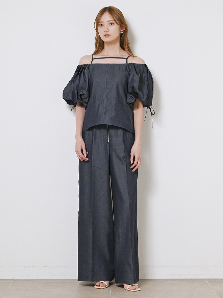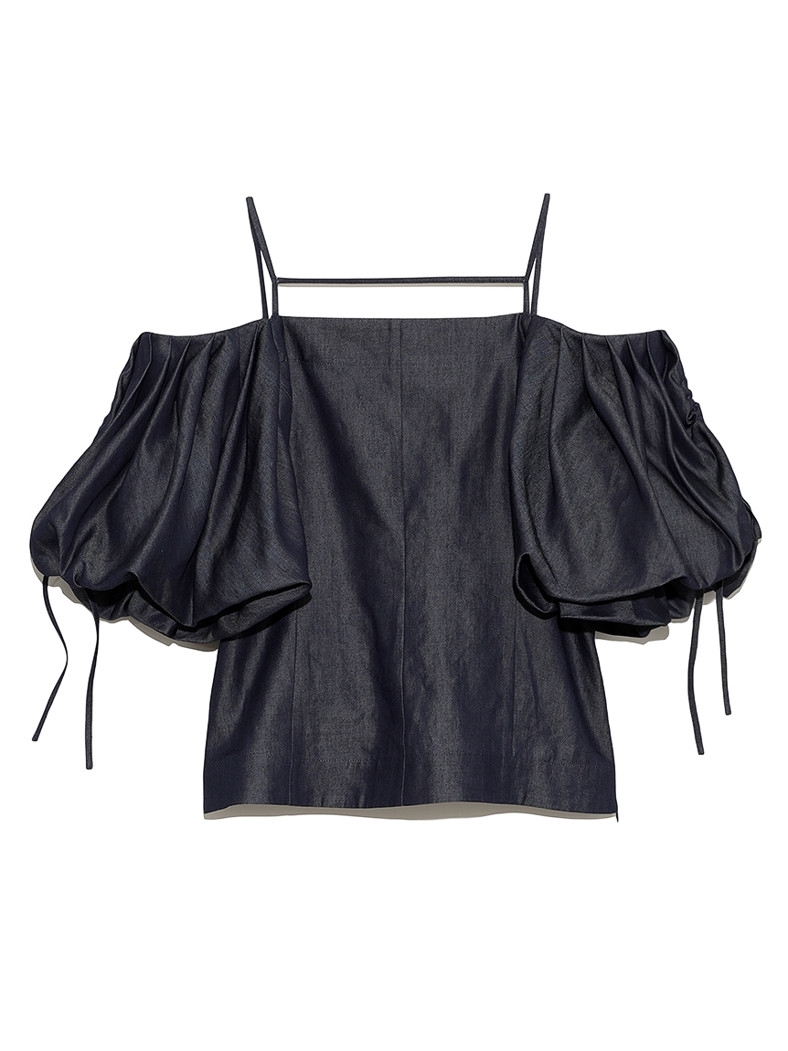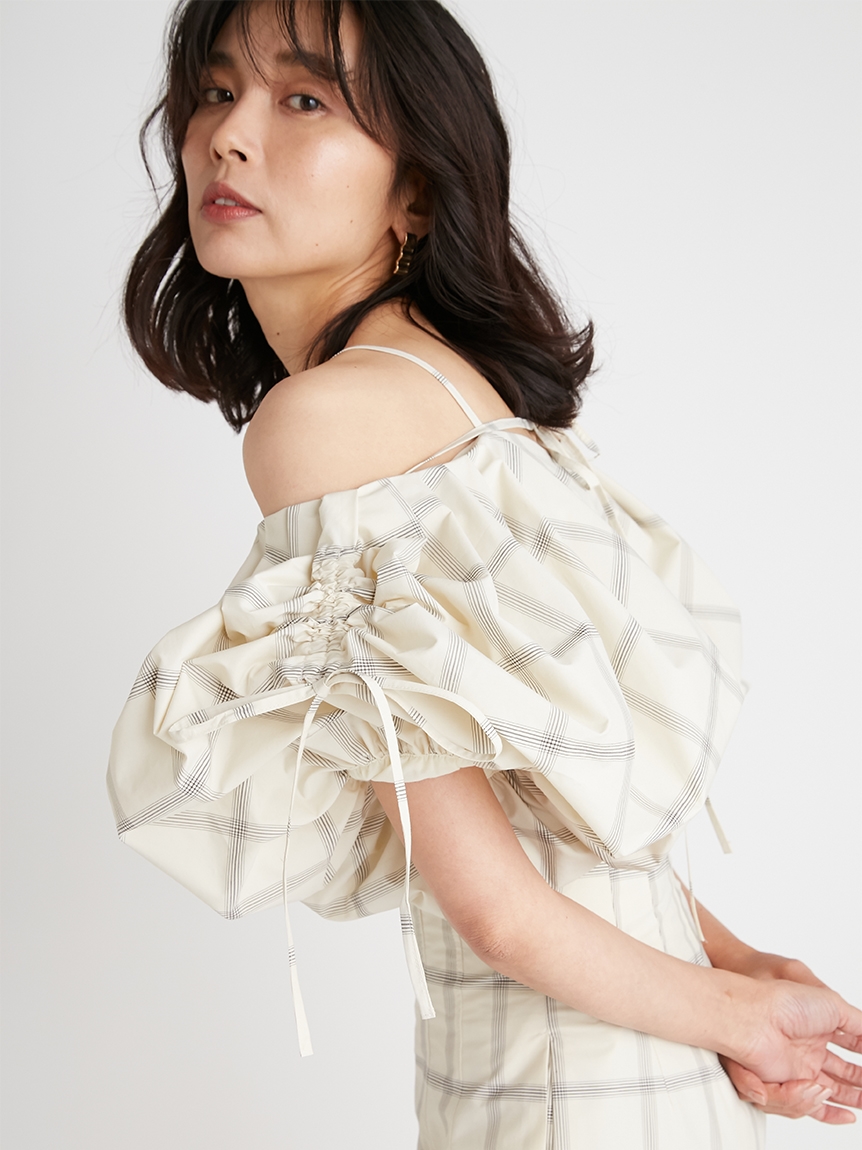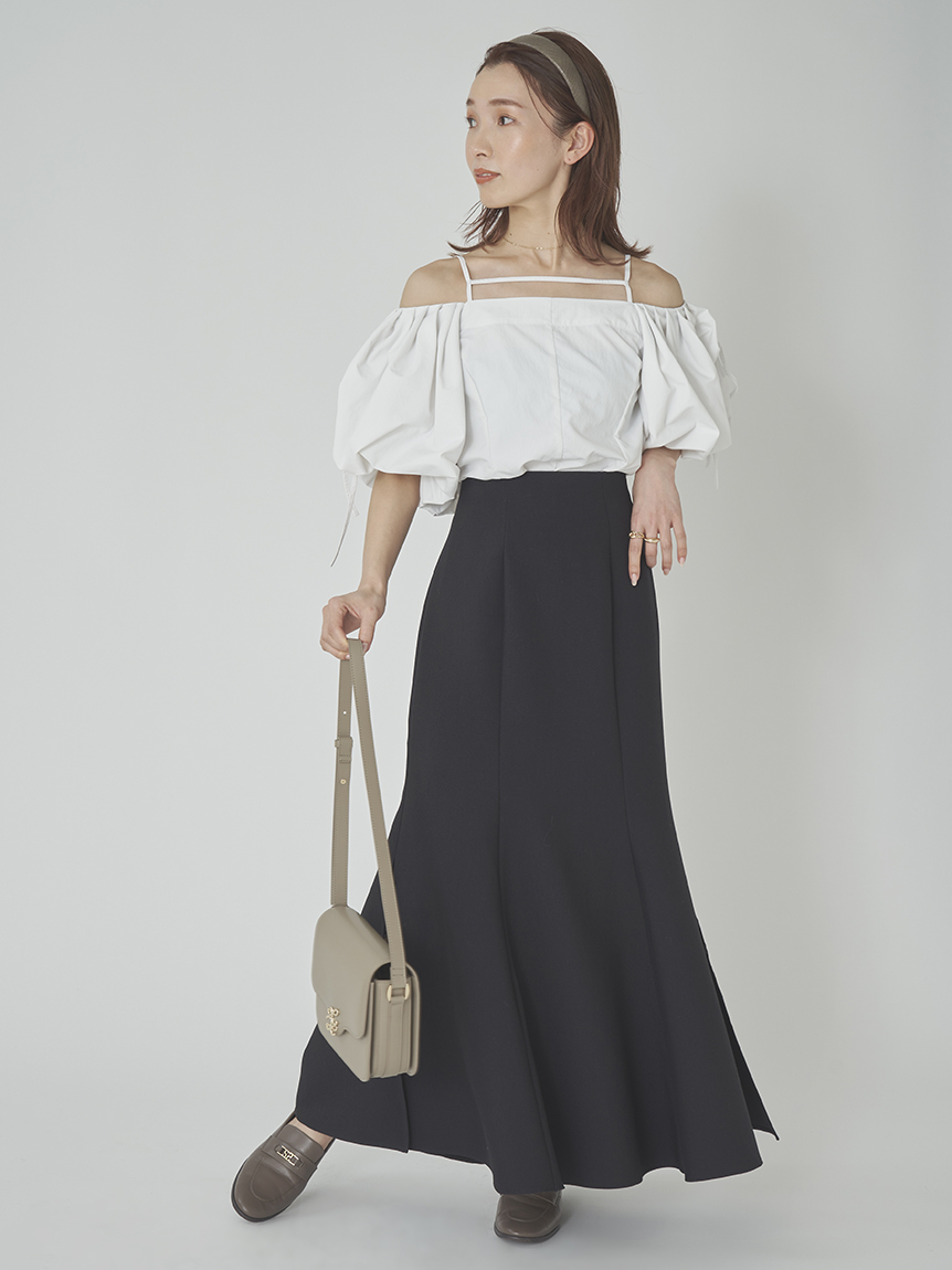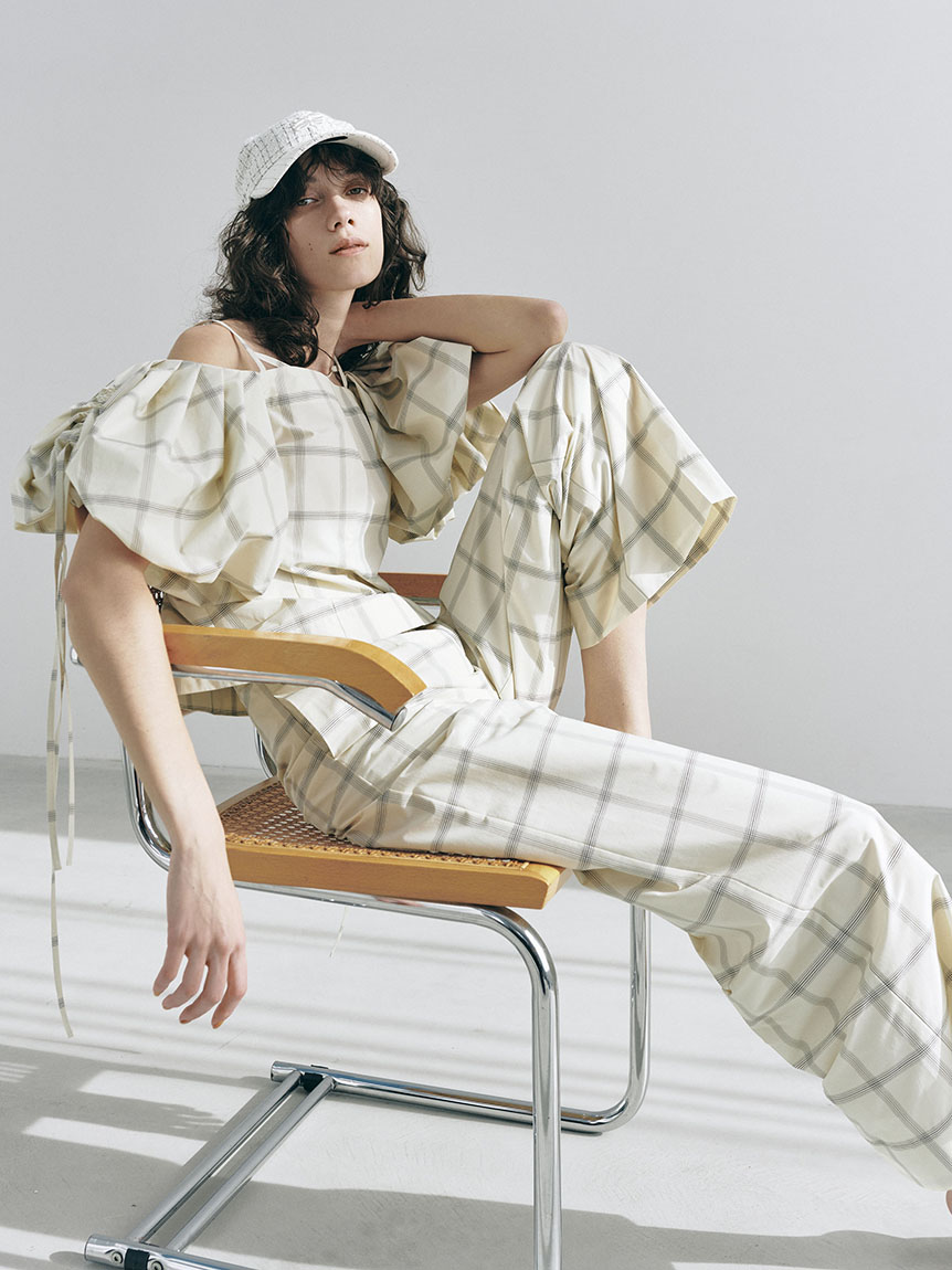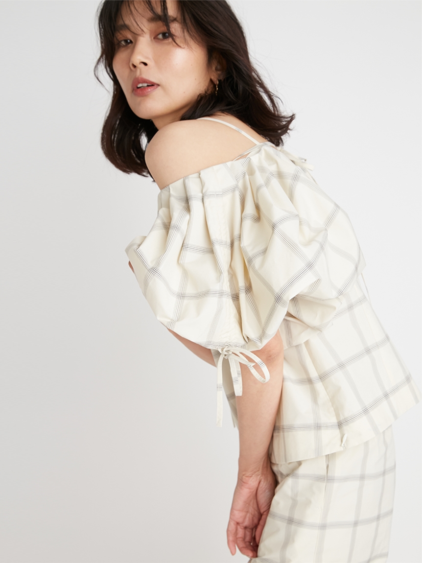 たっぷりとタックを施しボリューミーに仕上げたパフスリーブが印象的。モード感と女性らしさが相まったトレンドライクなブラウスが届きました。袖山にはドロストを備えているのでスリーブのフォルムはアレンジ可能。バックネックの紐の長さを調整することでオフショルにもできる2WAYデザインです。身頃はウエストをやや絞り、ペプラムライクなシルエットに。パンツともスカートとも相性が良く、様々なスタイリングに活躍してくれます。