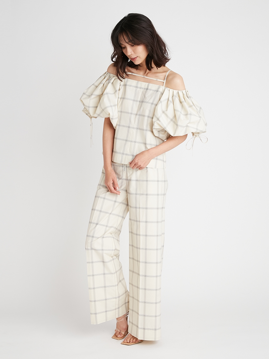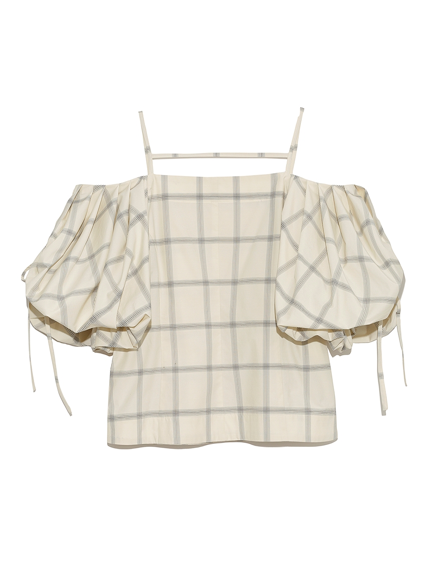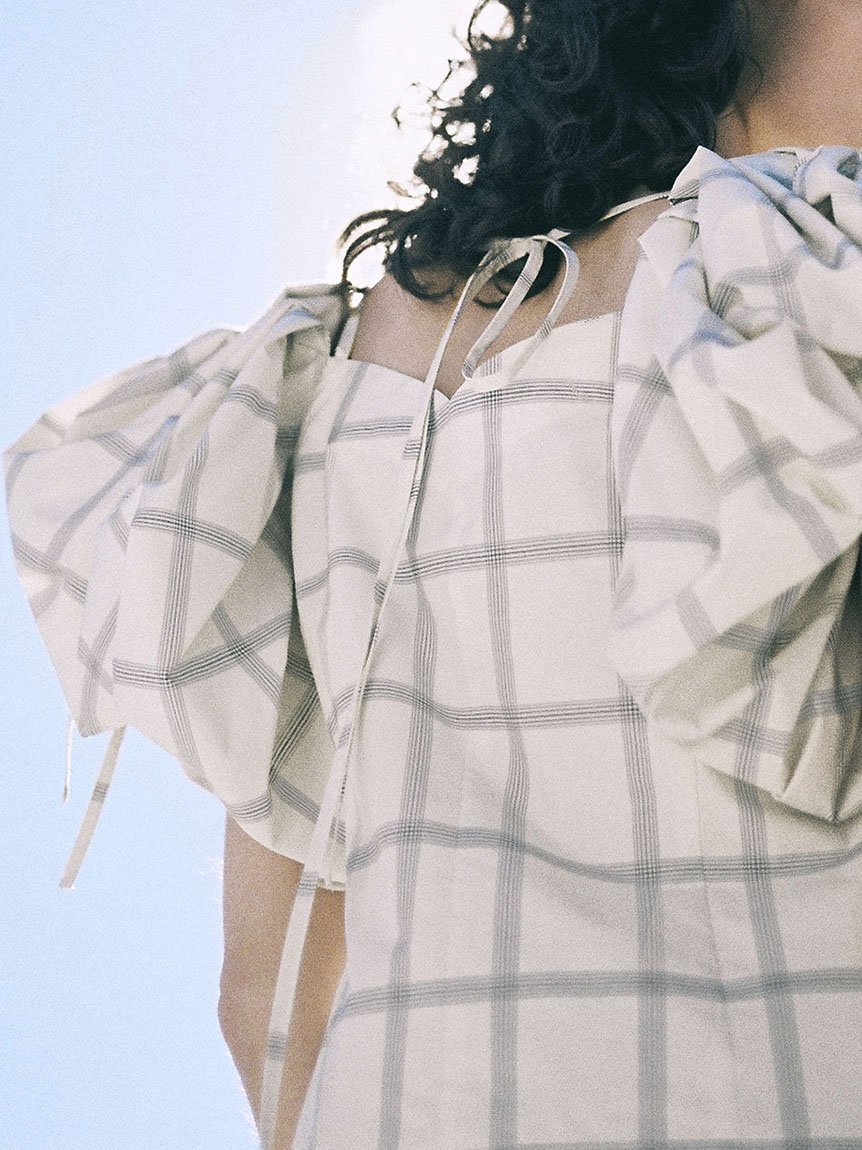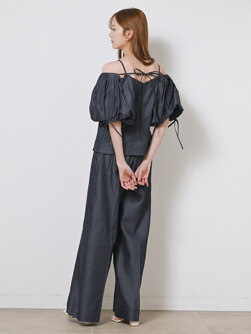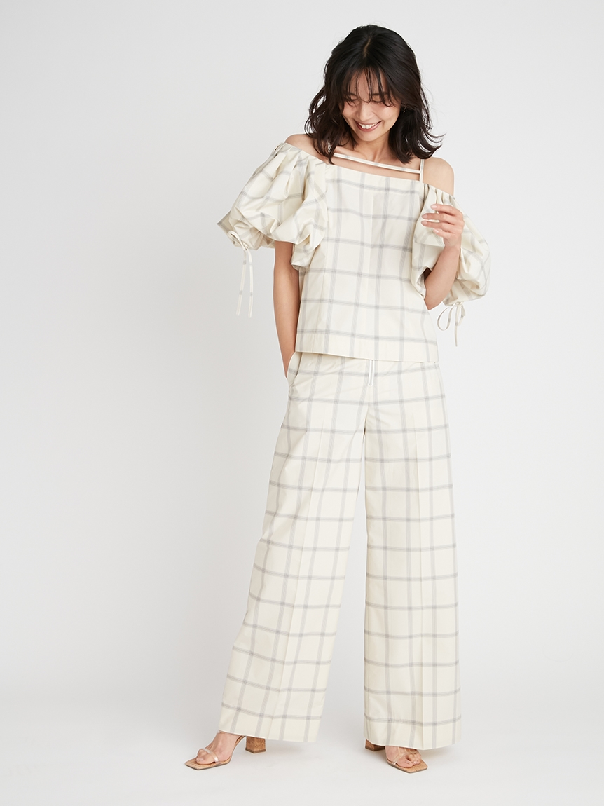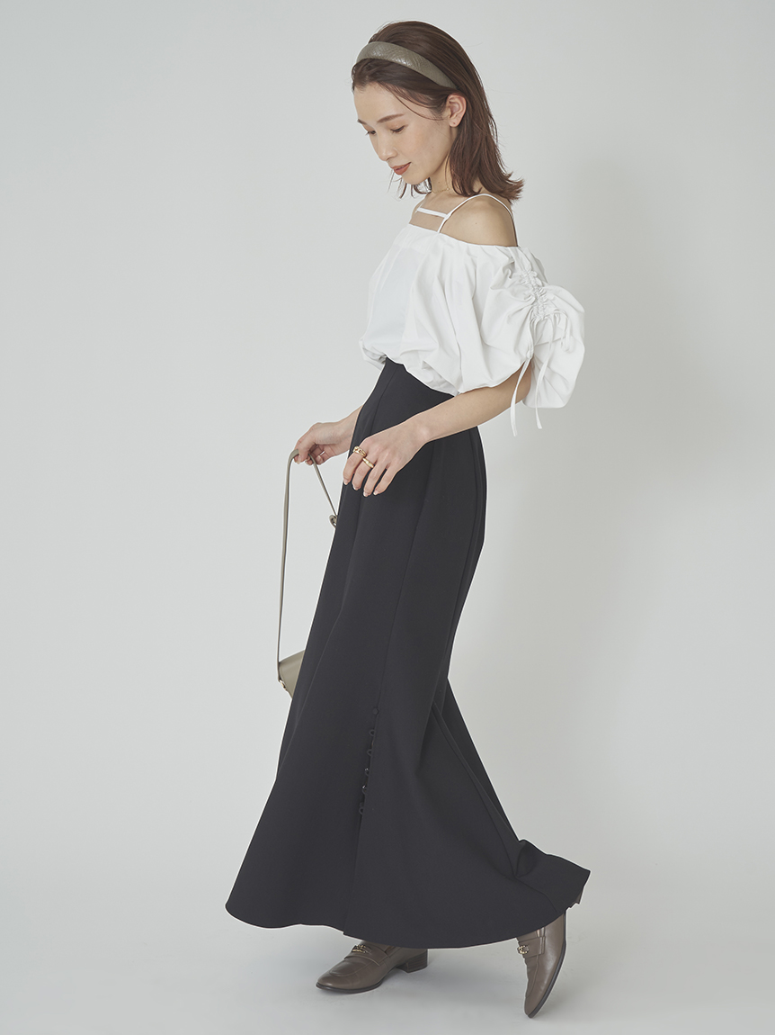 たっぷりとタックを施しボリューミーに仕上げたパフスリーブが印象的。モード感と女性らしさが相まったトレンドライクなブラウスが届きました。袖山にはドロストを備えているのでスリーブのフォルムはアレンジ可能。バックネックの紐の長さを調整することでオフショルにもできる2WAYデザインです。身頃はウエストをやや絞り、ペプラムライクなシルエットに。パンツともスカートとも相性が良く、様々なスタイリングに活躍してくれます。