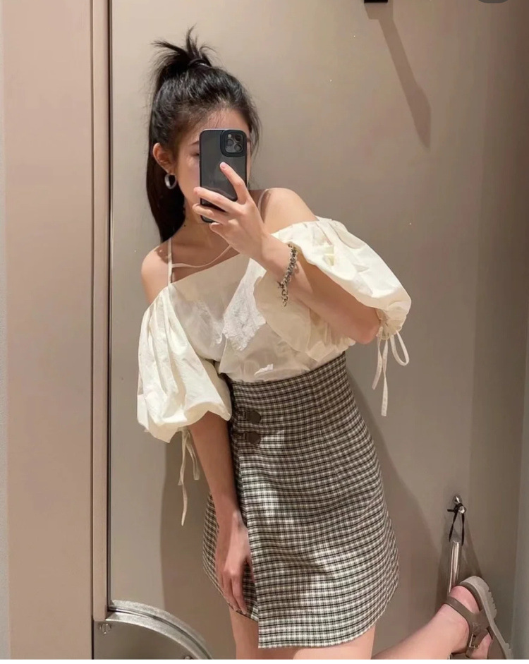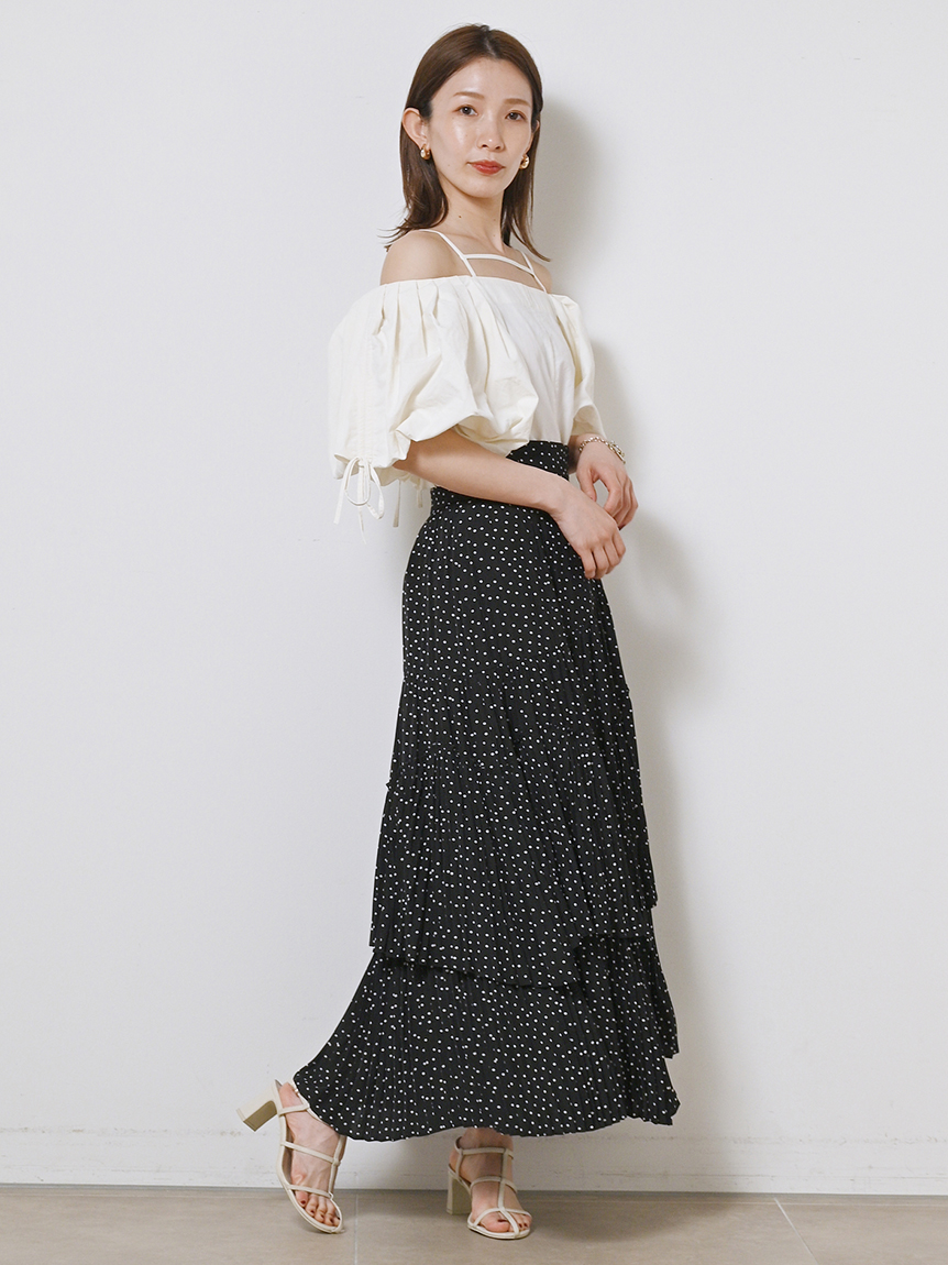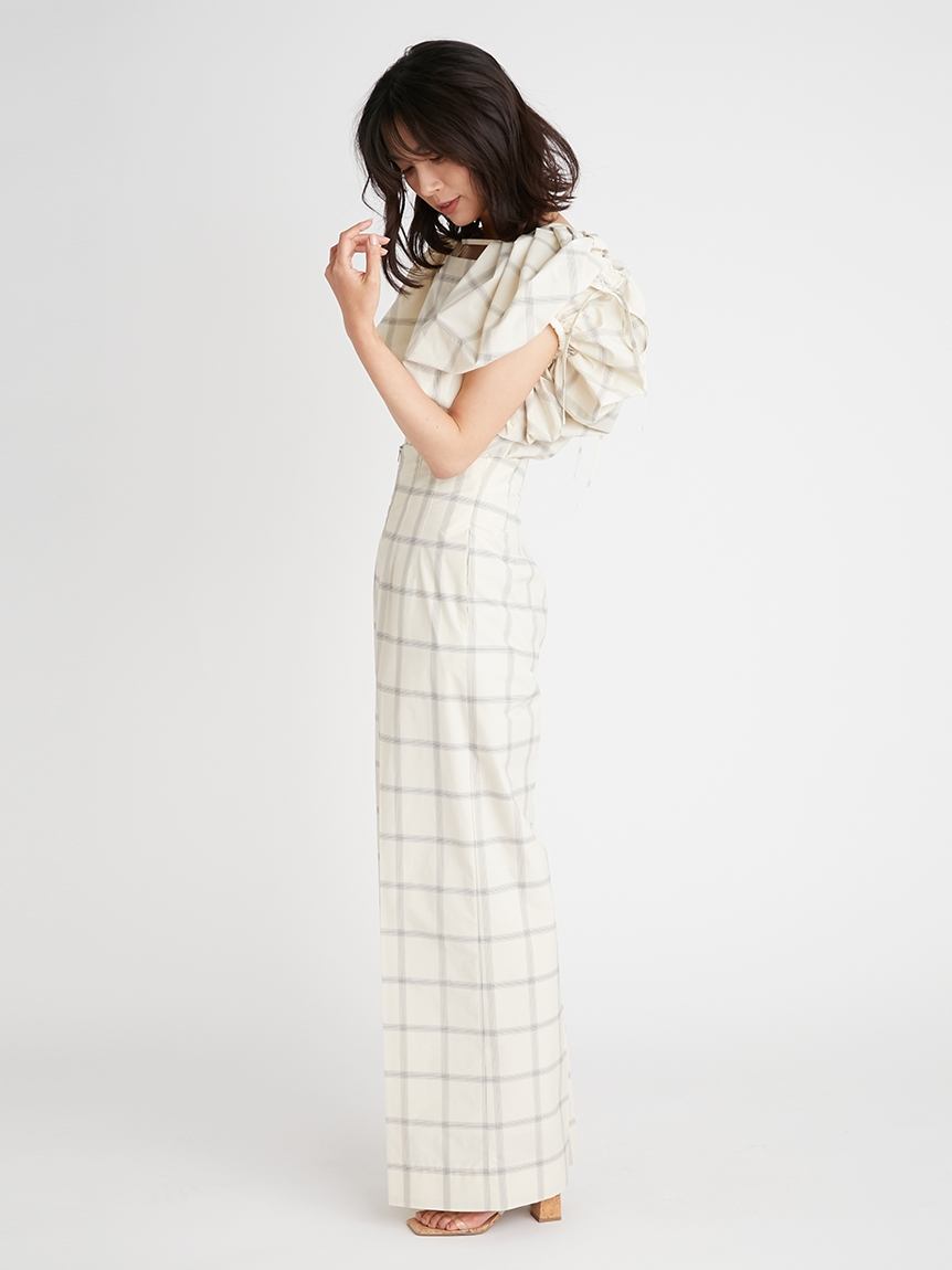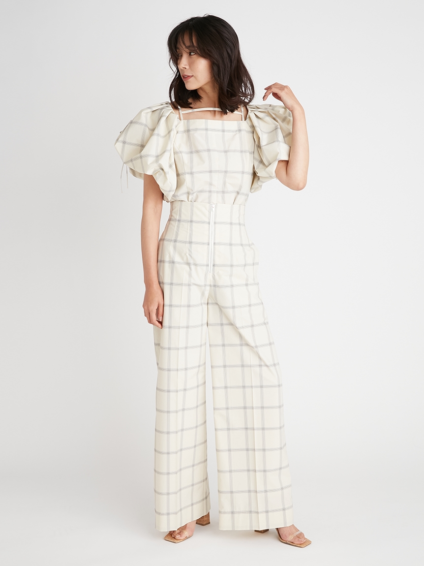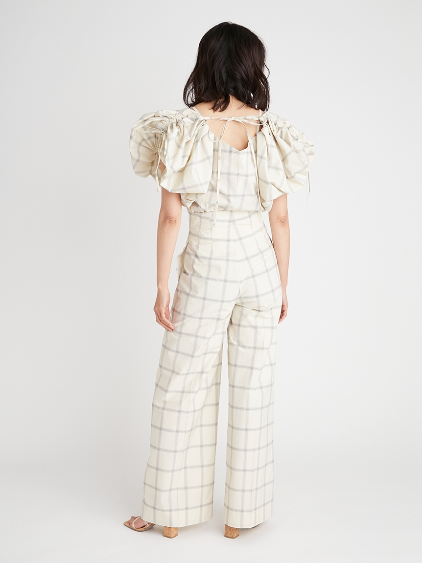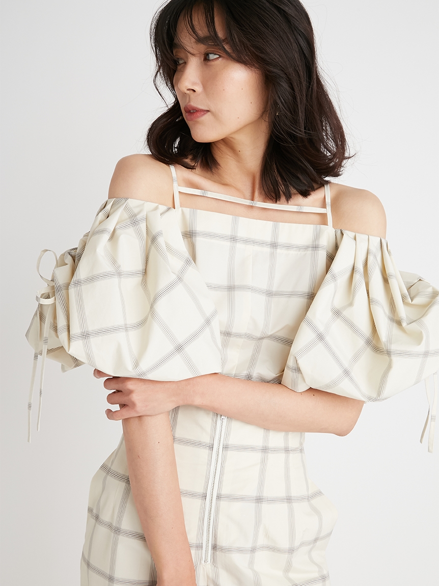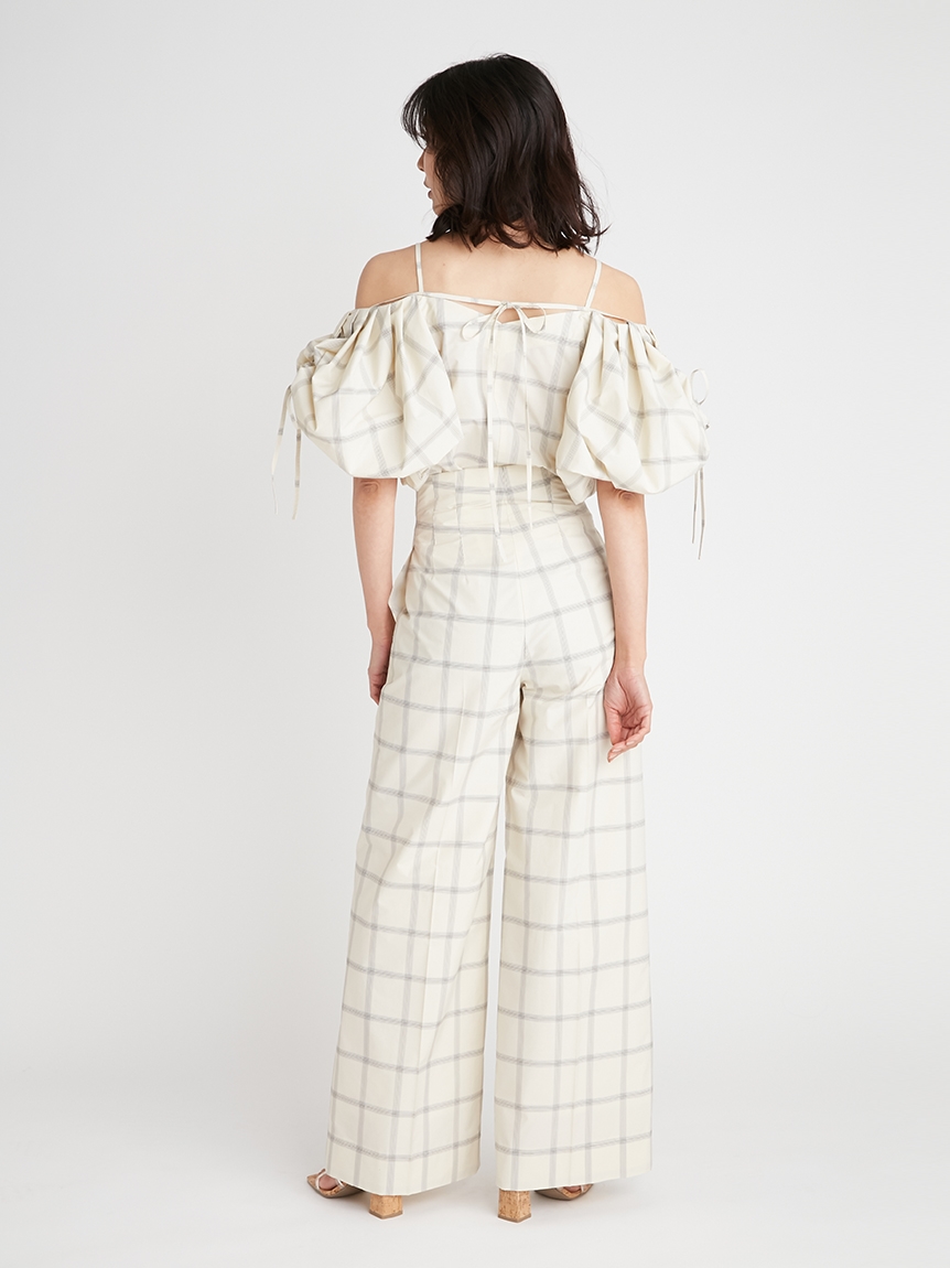 たっぷりとタックを施しボリューミーに仕上げたパフスリーブが印象的。モード感と女性らしさが相まったトレンドライクなブラウスが届きました。袖山にはドロストを備えているのでスリーブのフォルムはアレンジ可能。バックネックの紐の長さを調整することでオフショルにもできる2WAYデザインです。身頃はウエストをやや絞り、ペプラムライクなシルエットに。パンツともスカートとも相性が良く、様々なスタイリングに活躍してくれます。