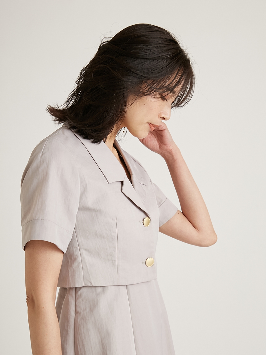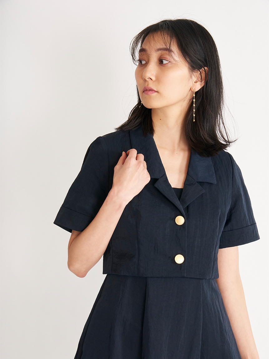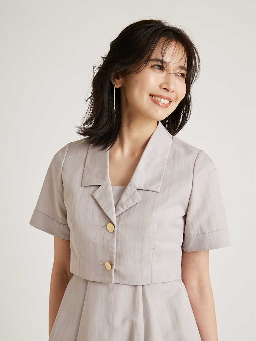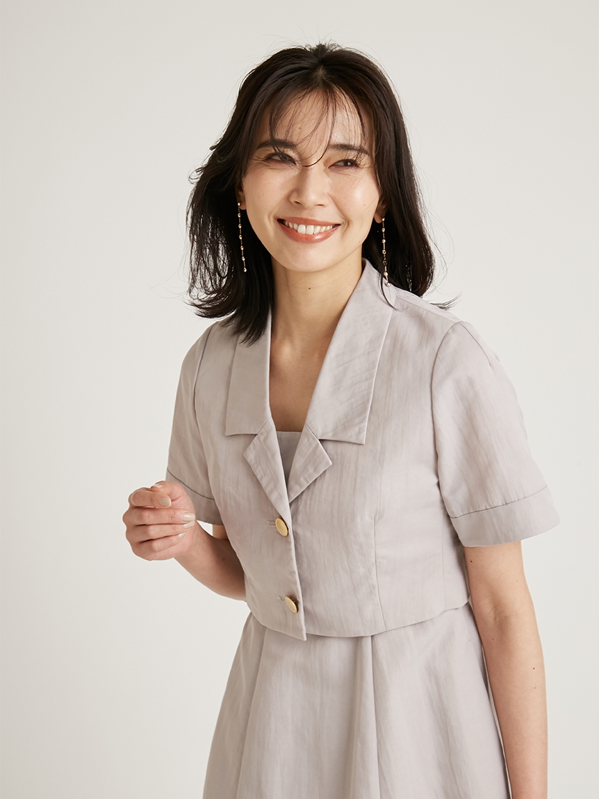 ショート丈のコンパクトなシルエットでトレンドライクに仕上げたハーフスリーブジャケット。小さめの襟や金ボタンを採用したきちんと感のあるルックスが、大人の洗練ムードを高めてくれます。同素材を用いたワンピース(SWFO222047)とのセットアップスタイルがオススメ。品の良さを感じさせるコーディネートで、オケージョンシーンやフォーマルな場でも活躍してくれます。