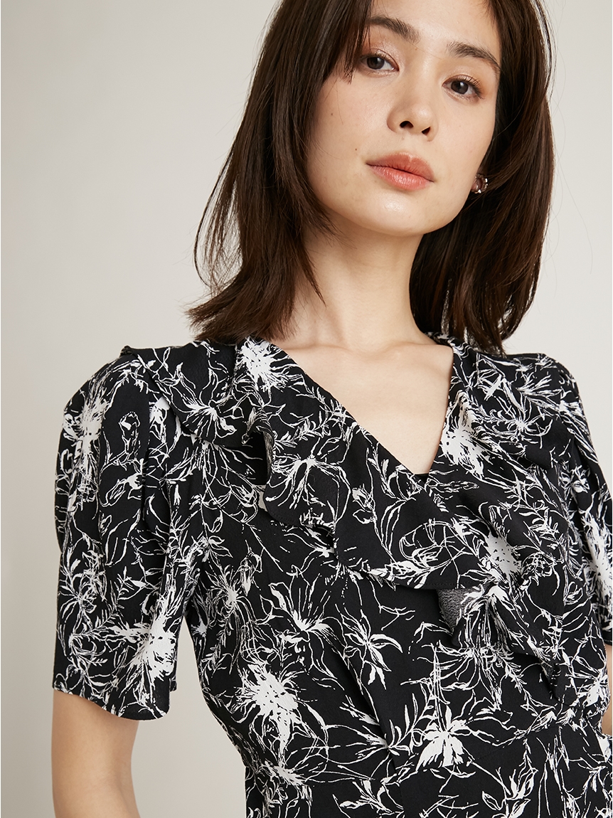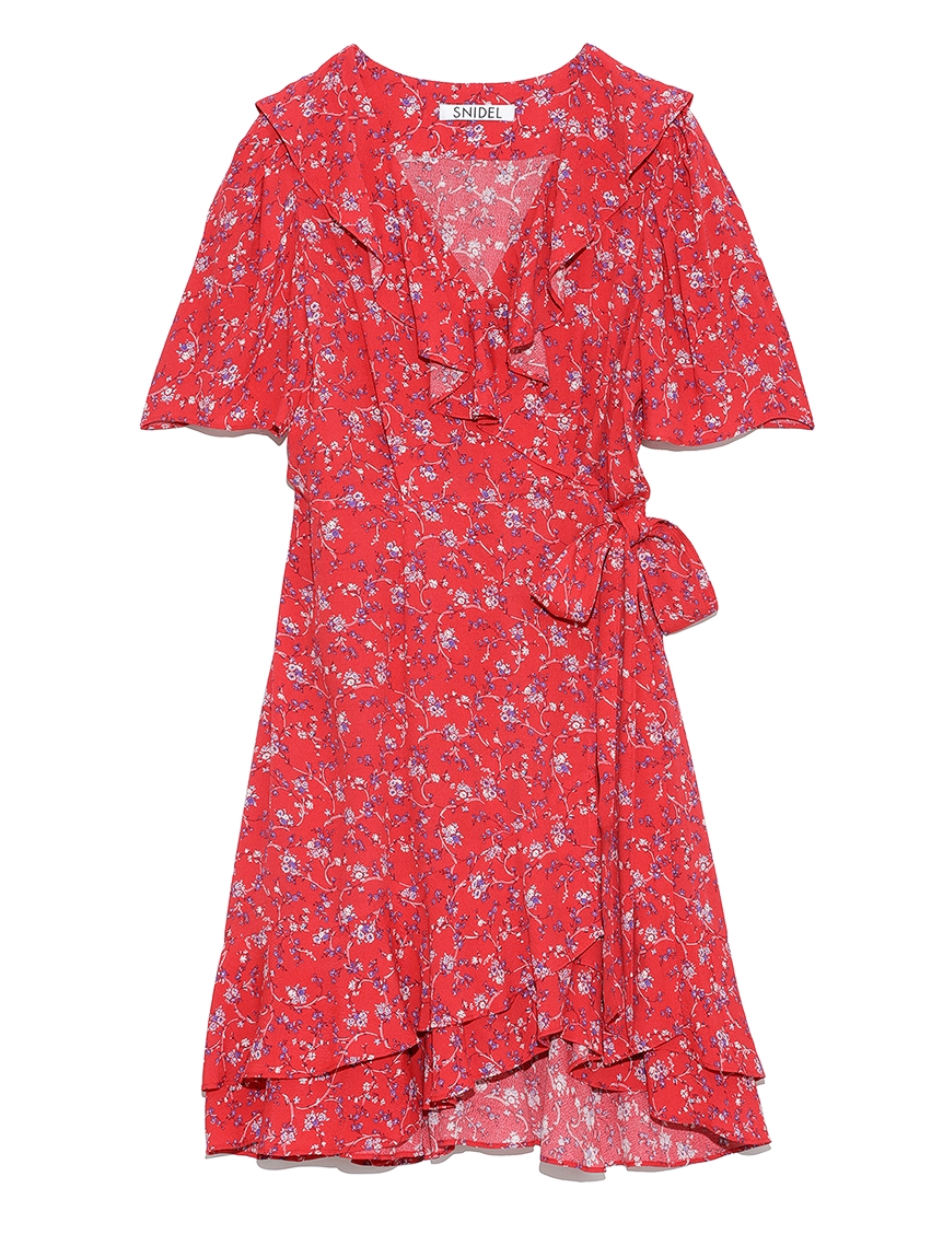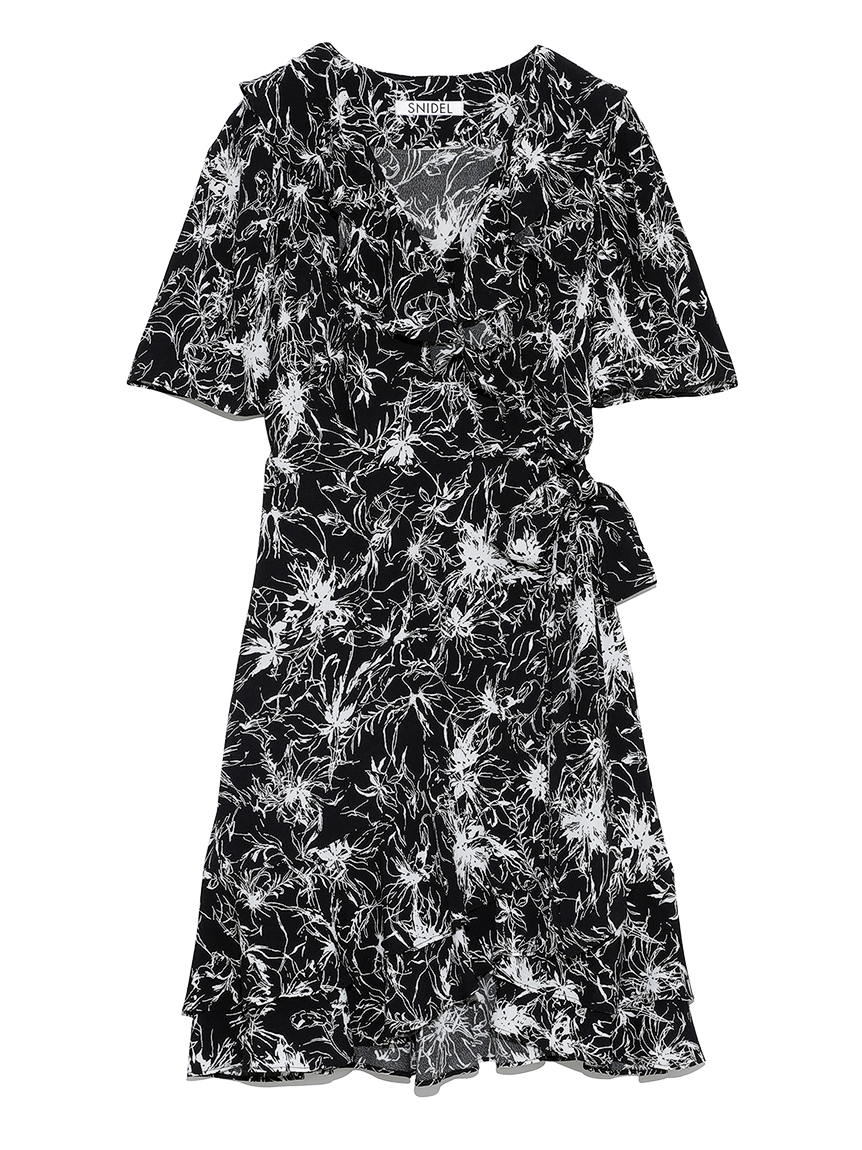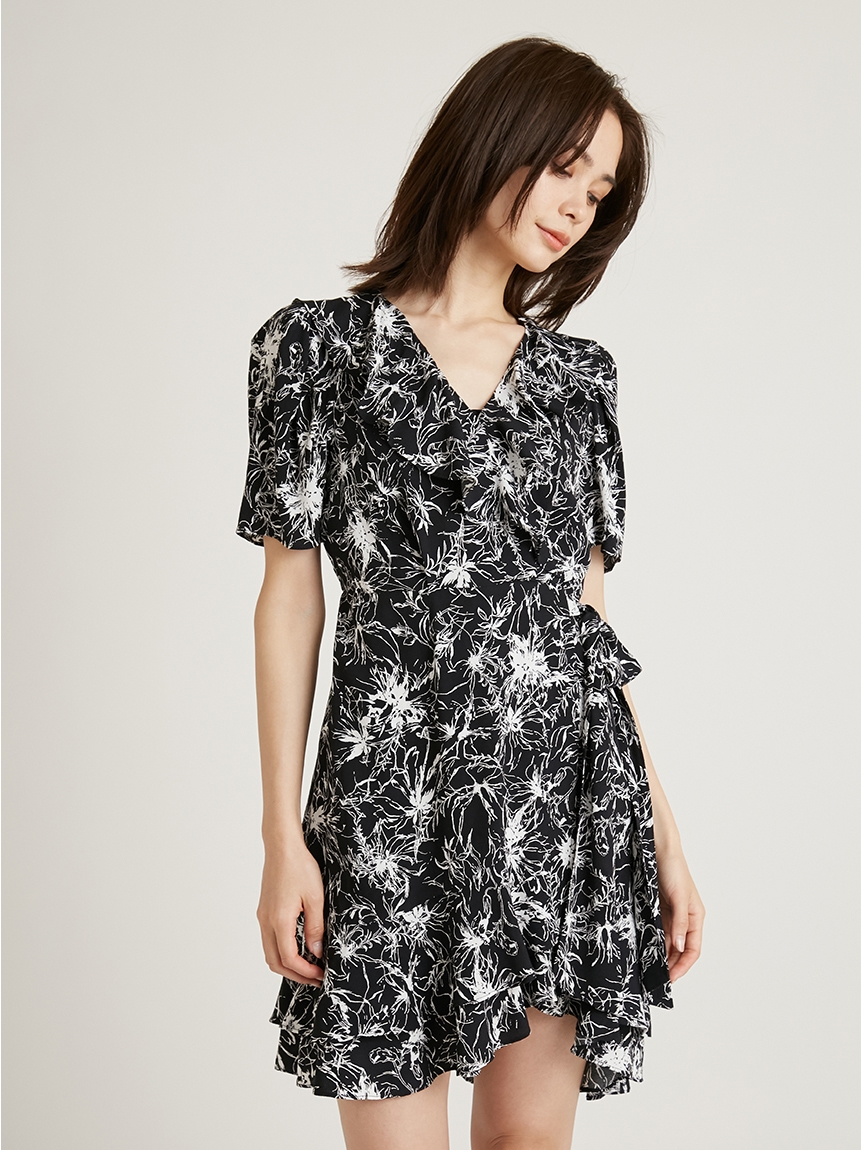 襟ぐりに彩られたフリル&裾のティアードが印象的な、レディムード溢れるミニワンピース。サイドでリボンをキュッと結んだカシュクールデザインで、大人っぽい雰囲気に仕上げています。バックウエストにゴムギャザーを効かせることで、シルエットにメリハリをプラス。存在感たっぷりのプリントなので1枚でもサマになり、夏らしいスタイリングが完成します。
