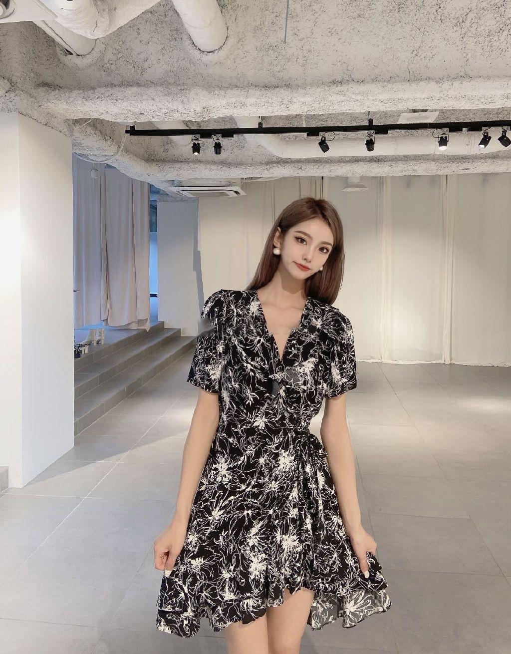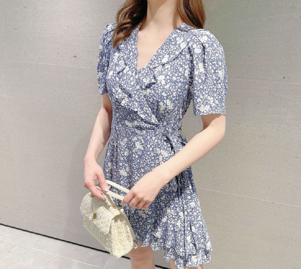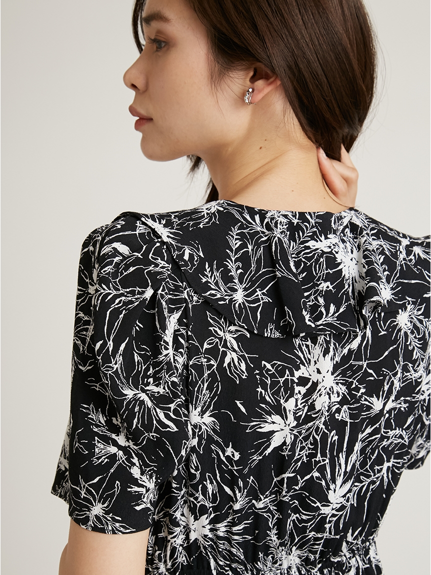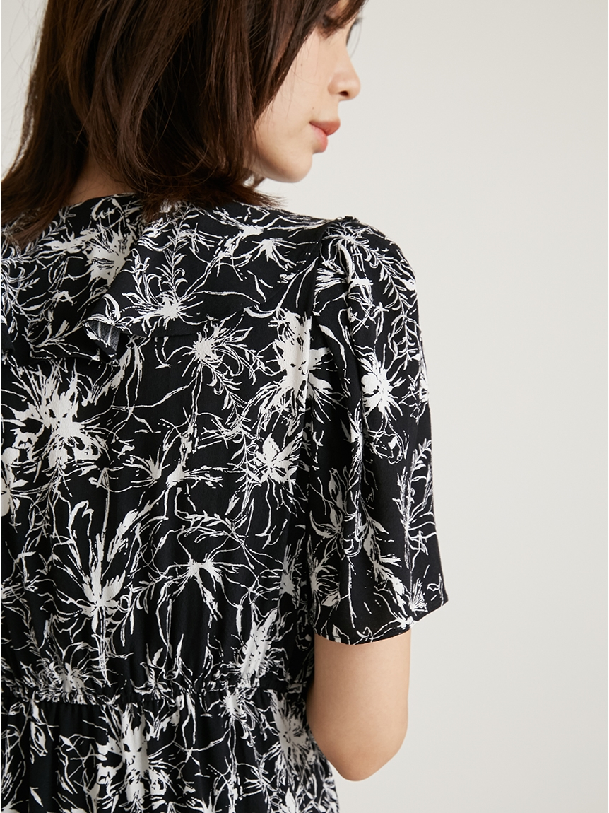 襟ぐりに彩られたフリル&裾のティアードが印象的な、レディムード溢れるミニワンピース。サイドでリボンをキュッと結んだカシュクールデザインで、大人っぽい雰囲気に仕上げています。バックウエストにゴムギャザーを効かせることで、シルエットにメリハリをプラス。存在感たっぷりのプリントなので1枚でもサマになり、夏らしいスタイリングが完成します。
