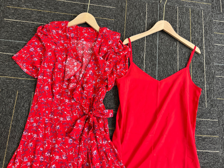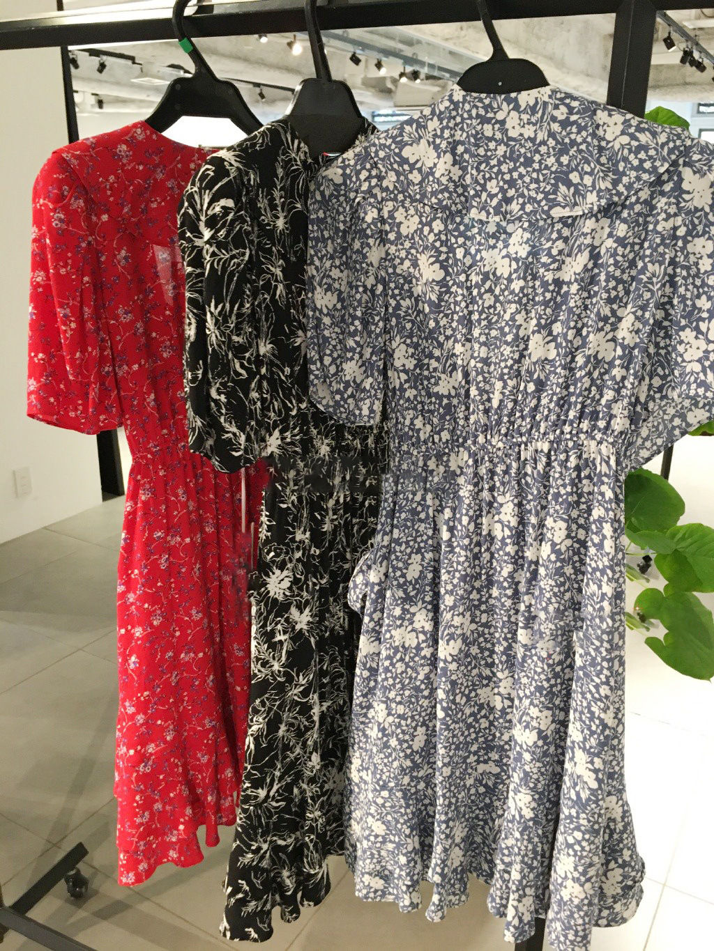 落ち感のある軽やかなファブリックを使用。華やかなレッド、鮮やかなブルー、モードなブラックのオリジナルフラワー柄3色をご用意しました。