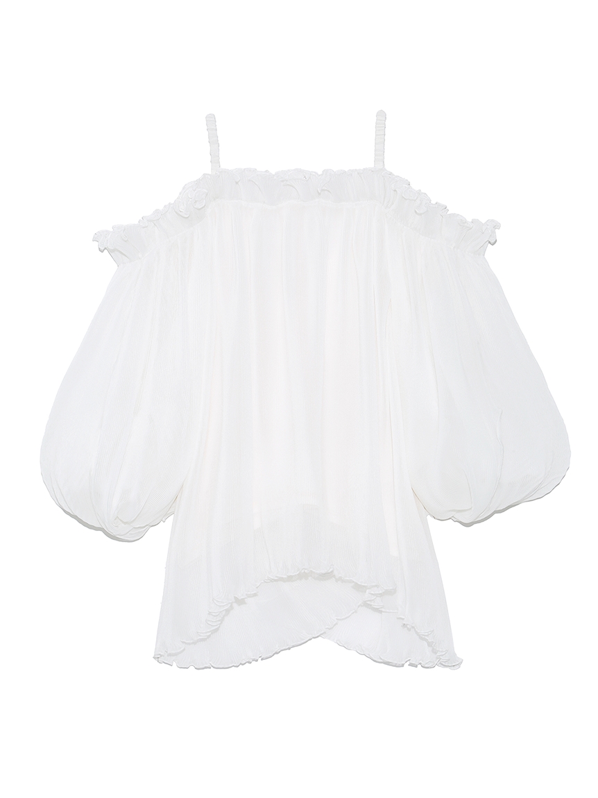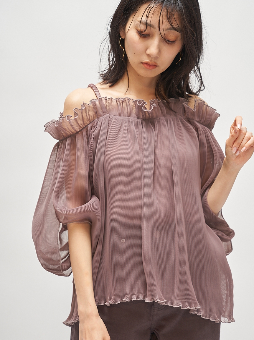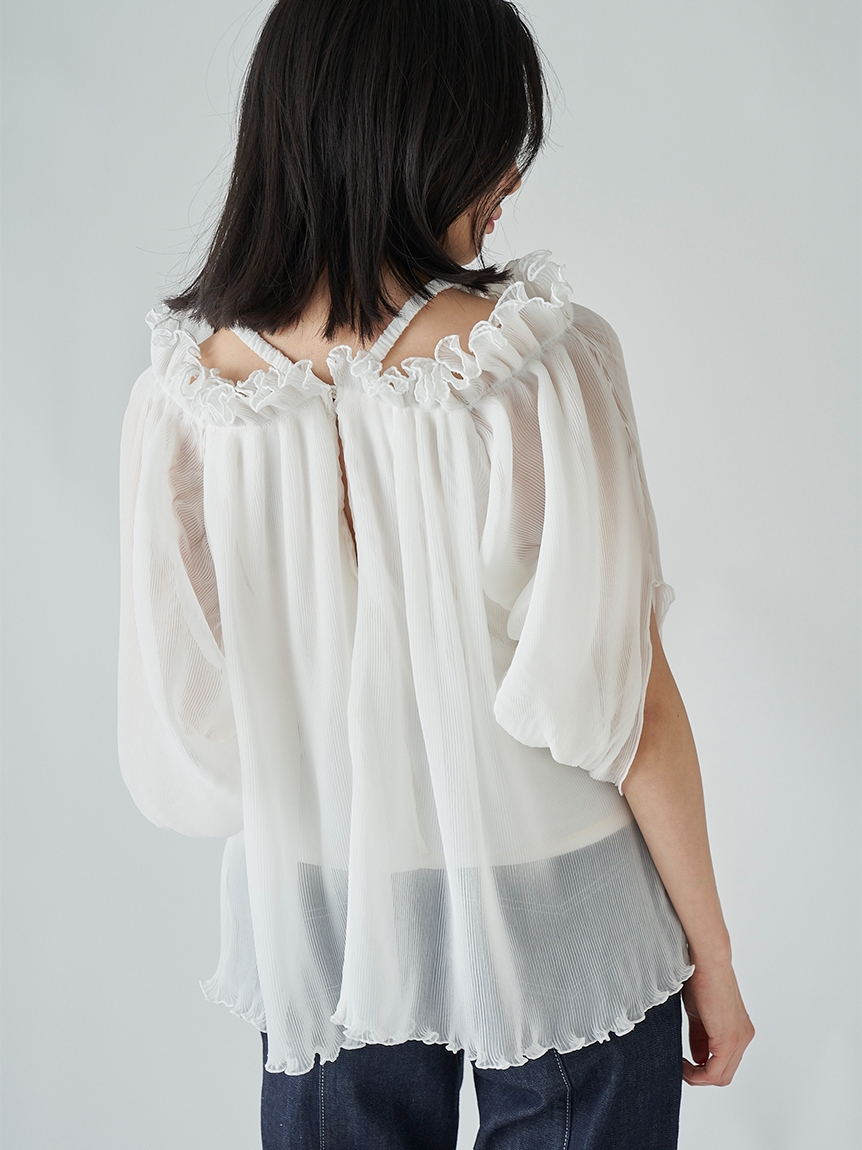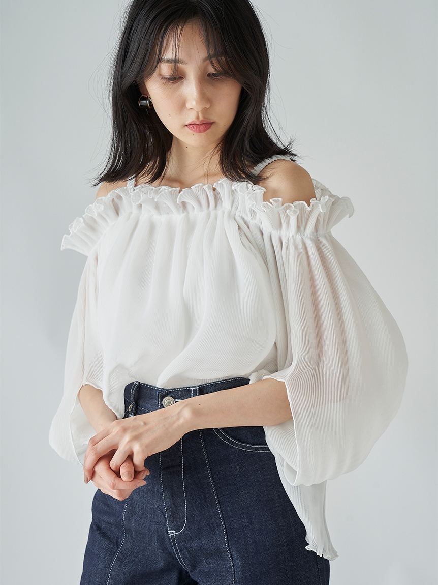 全体に細かなプリーツを畳んだ軽やかな素材感で、シーズンスタイルにぴったりのブラウス。軽やかな素材ながらハリ感のある素材に立体的な袖がモード感を引き立てます。バックに備えたボタンを外せばオフショルにもできる2WAYデザインで、アレンジ力は◎。肩紐があしらわれているのでずり落ちる心配もなく、安心して着られます。