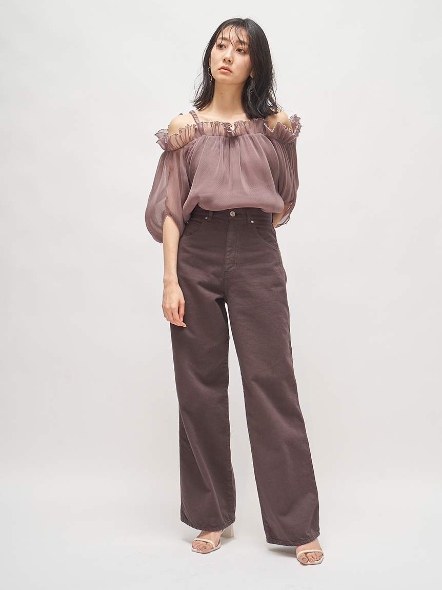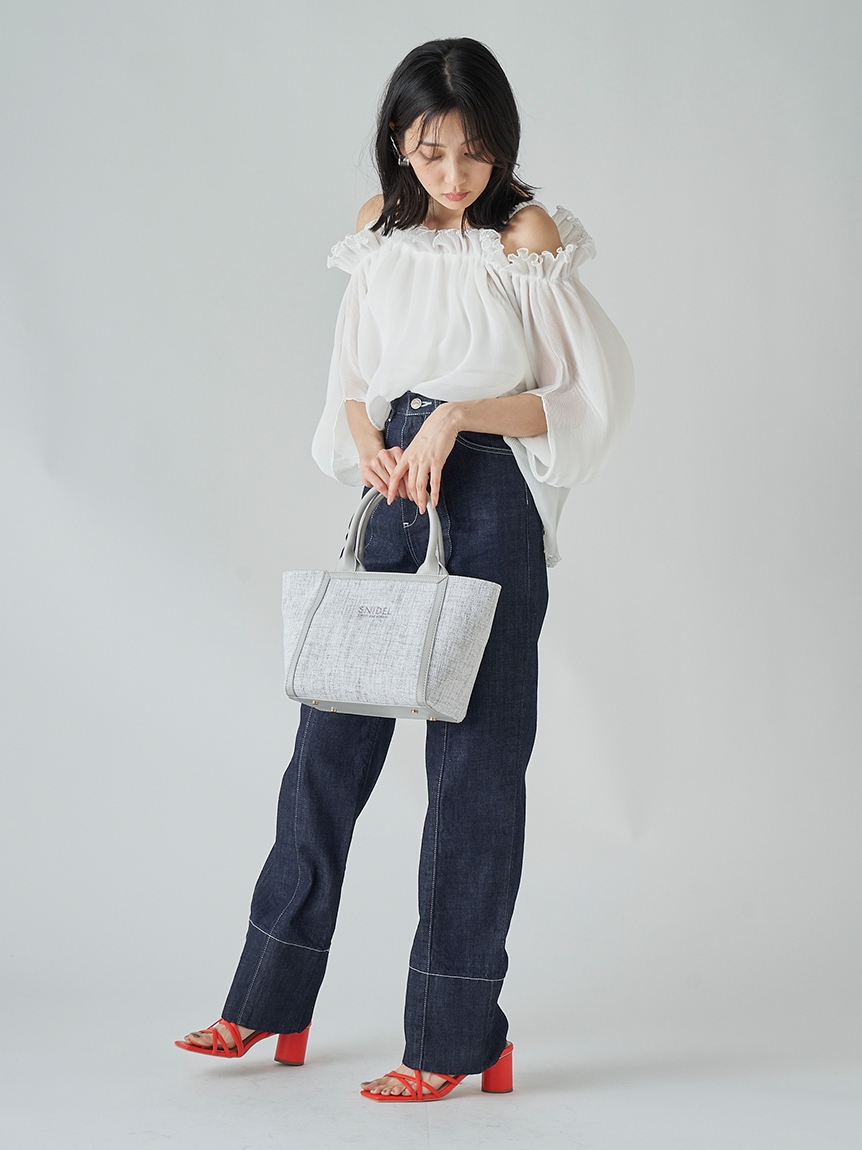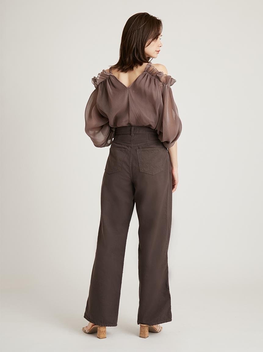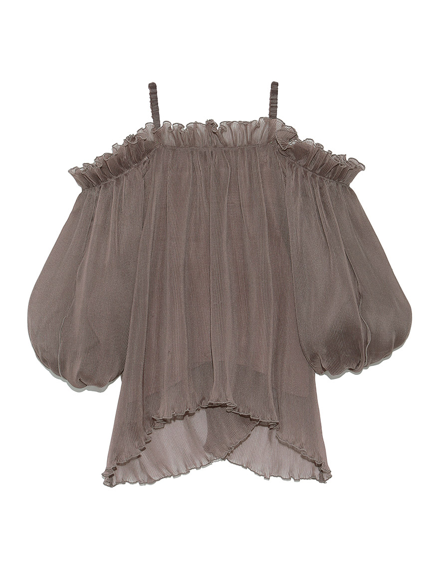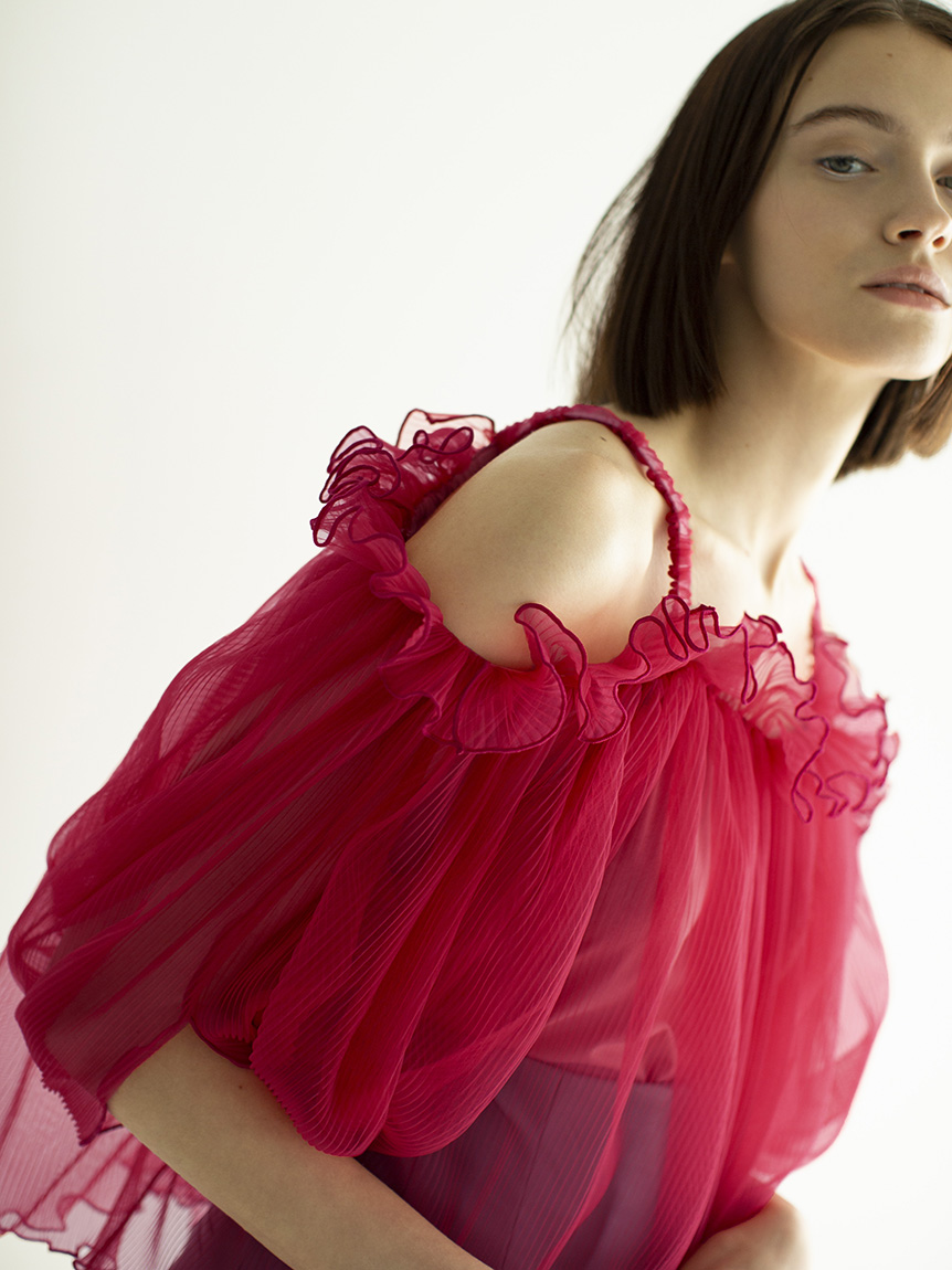 全体に細かなプリーツを畳んだ軽やかな素材感で、シーズンスタイルにぴったりのブラウス。軽やかな素材ながらハリ感のある素材に立体的な袖がモード感を引き立てます。バックに備えたボタンを外せばオフショルにもできる2WAYデザインで、アレンジ力は◎。肩紐があしらわれているのでずり落ちる心配もなく、安心して着られます。