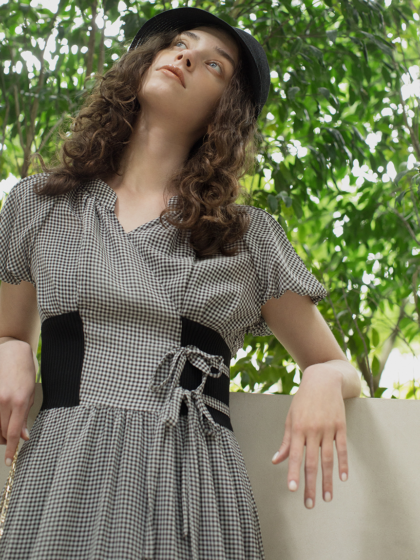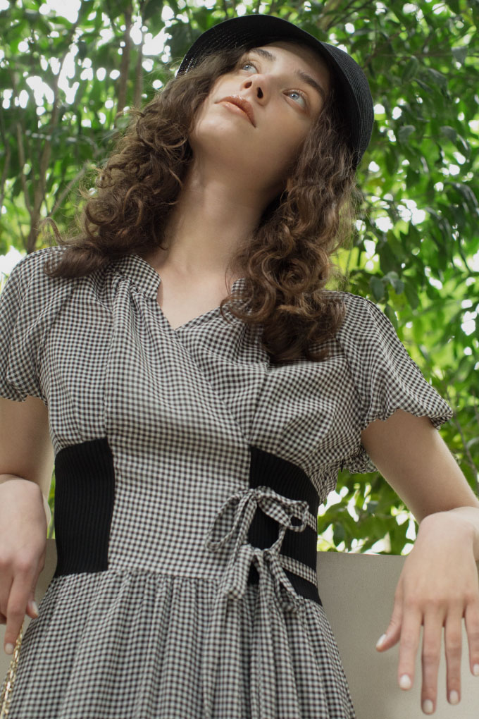 シアーでシボ感のある合繊素材とリブニットを組み合わせました。着まわしやすいホワイト、グレーに、クラシカルなチェックを加えた3色をご用意。
