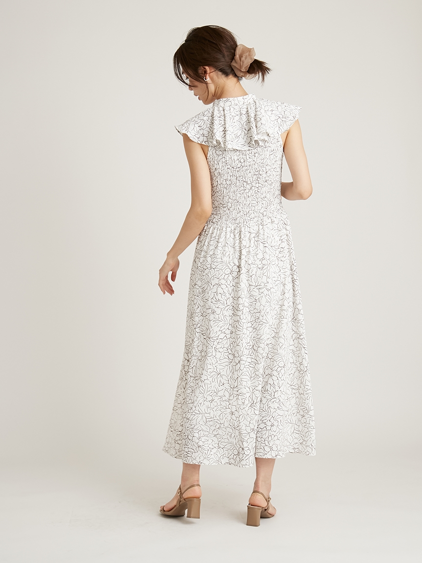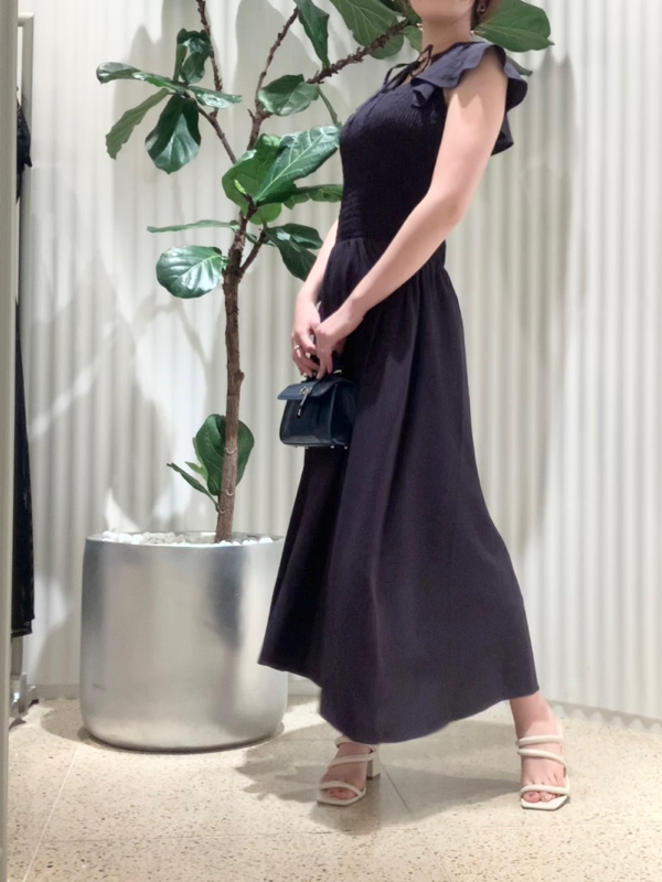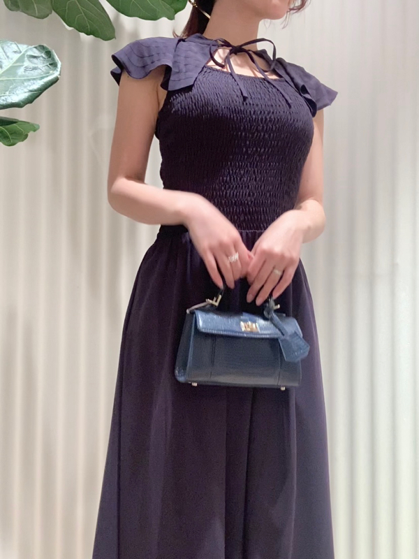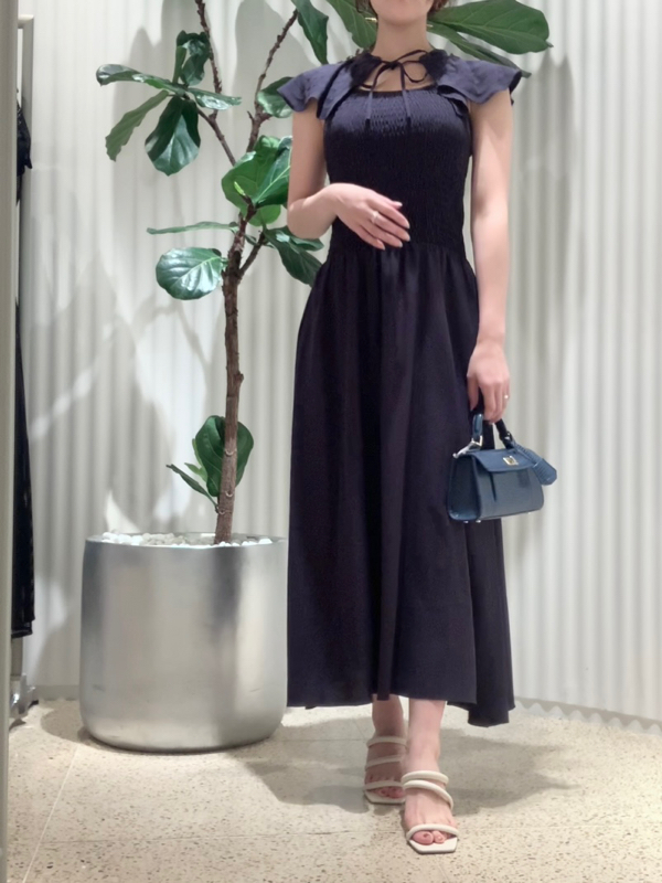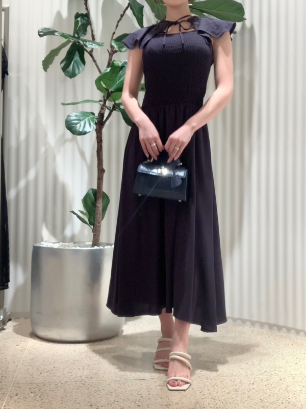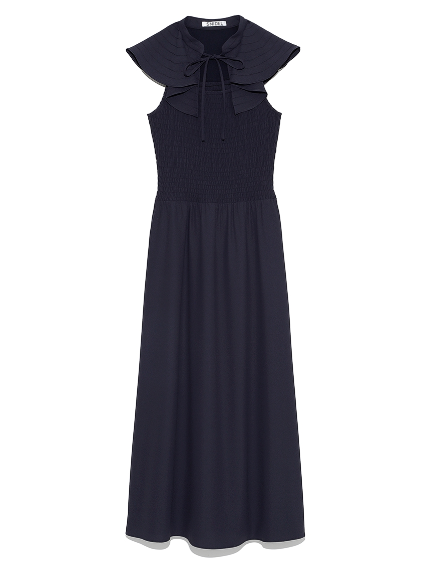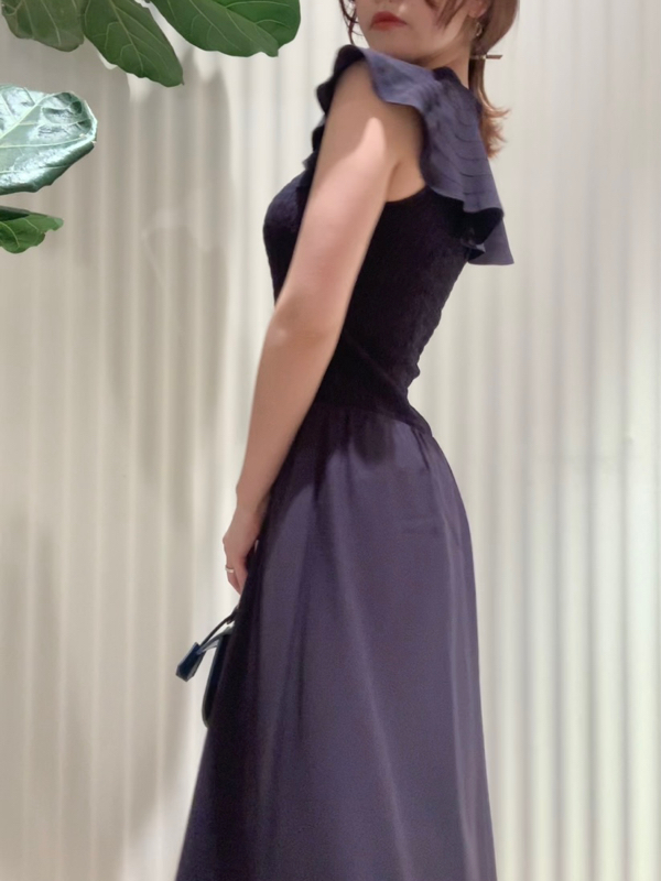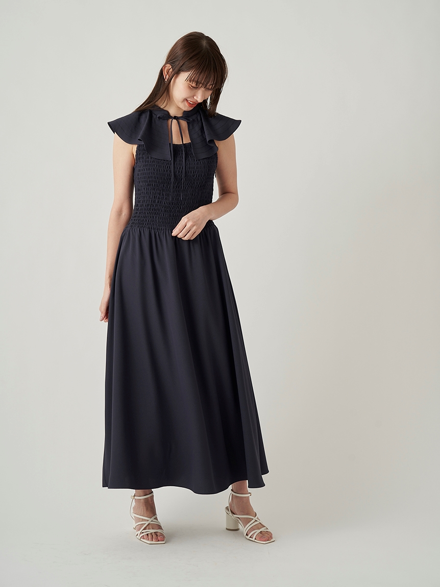 ひらひらと波打つ大きめのフリルカラーが印象的な、今年らしいデザインのワンピース。身頃部分はゴムシャーリングを効かせフィット感のあるシルエットに。スカート部分はふんわりと広がる軽やかなフレアラインで、女性らしさが存分に引き立ちます。ハイウエストの切り替えで脚長効果があり、スタイルアップも期待できます。