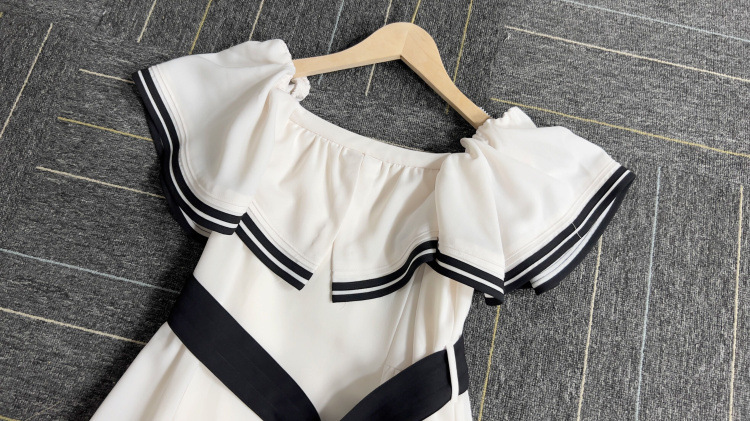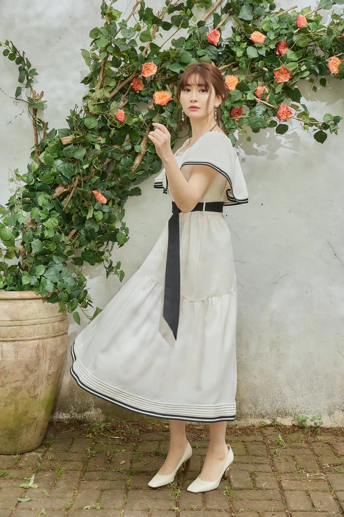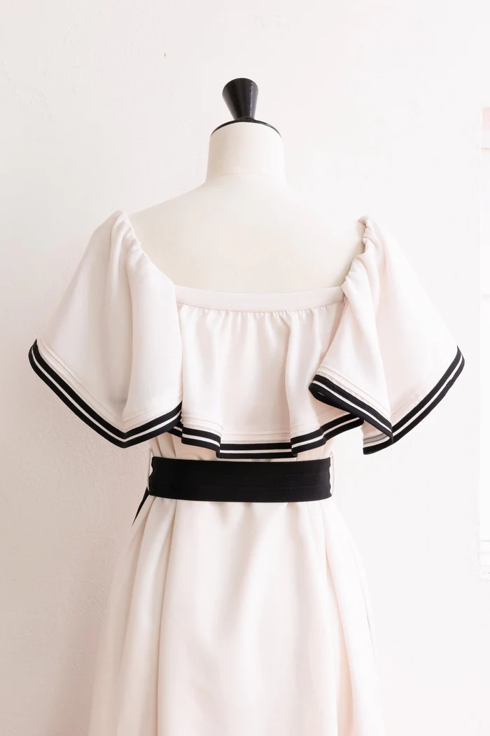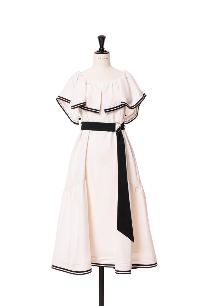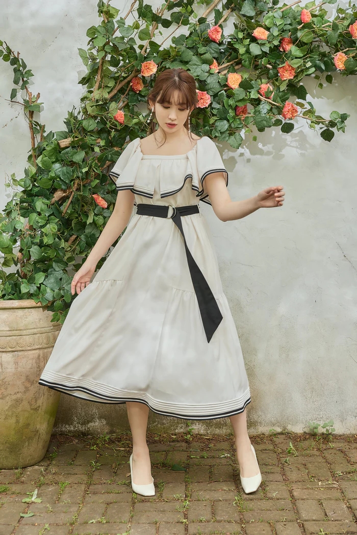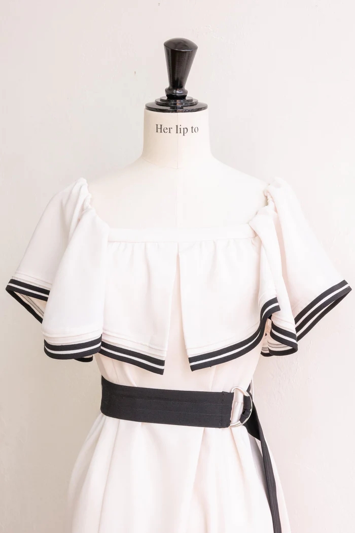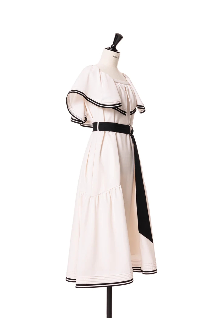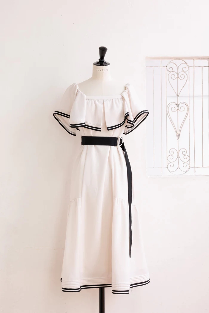 バイカラーのベルトや2本ラインのトリミングが魅力的なドレス。