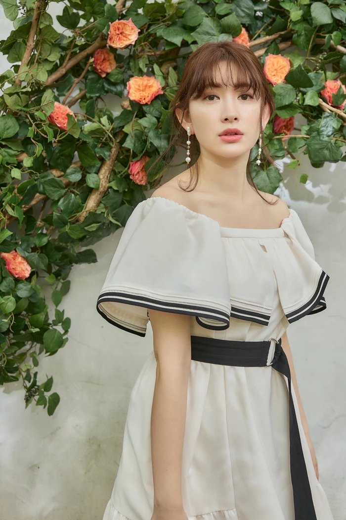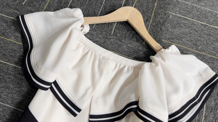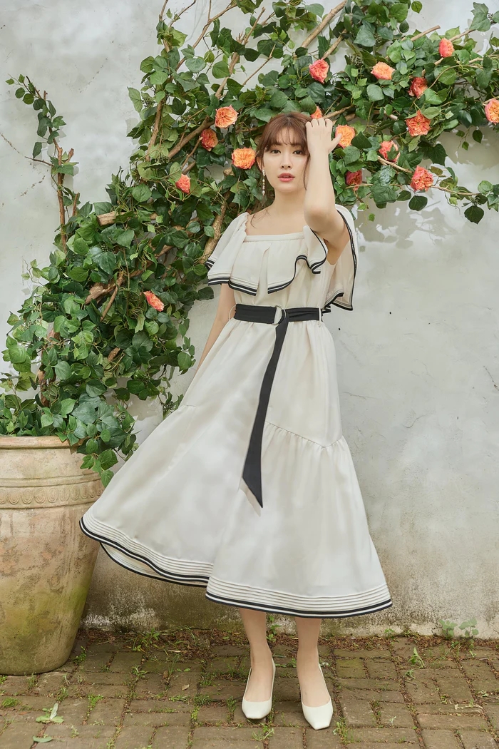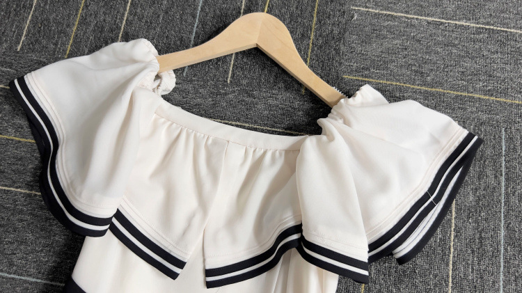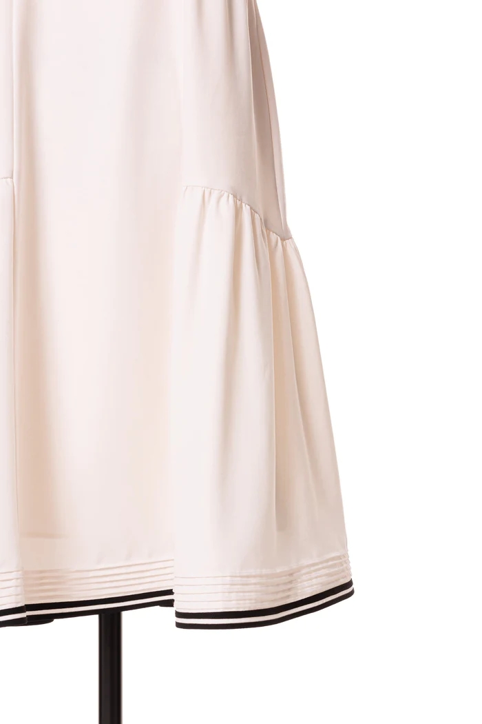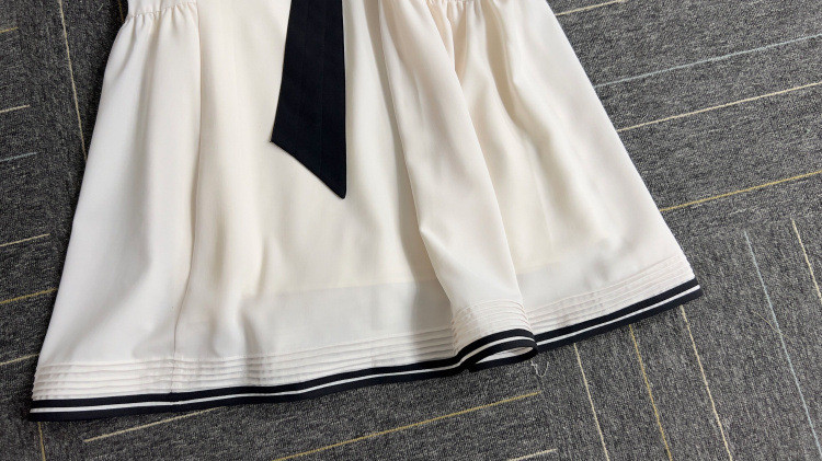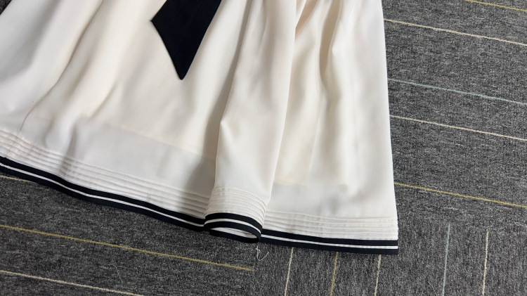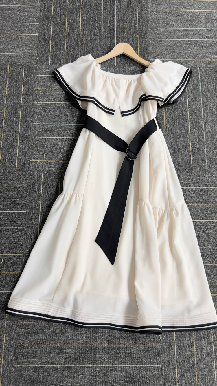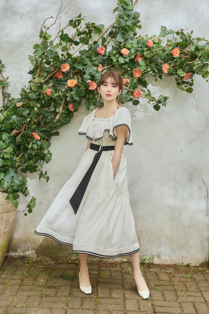 バイカラーのベルトや2本ラインのトリミングが魅力的なドレス。