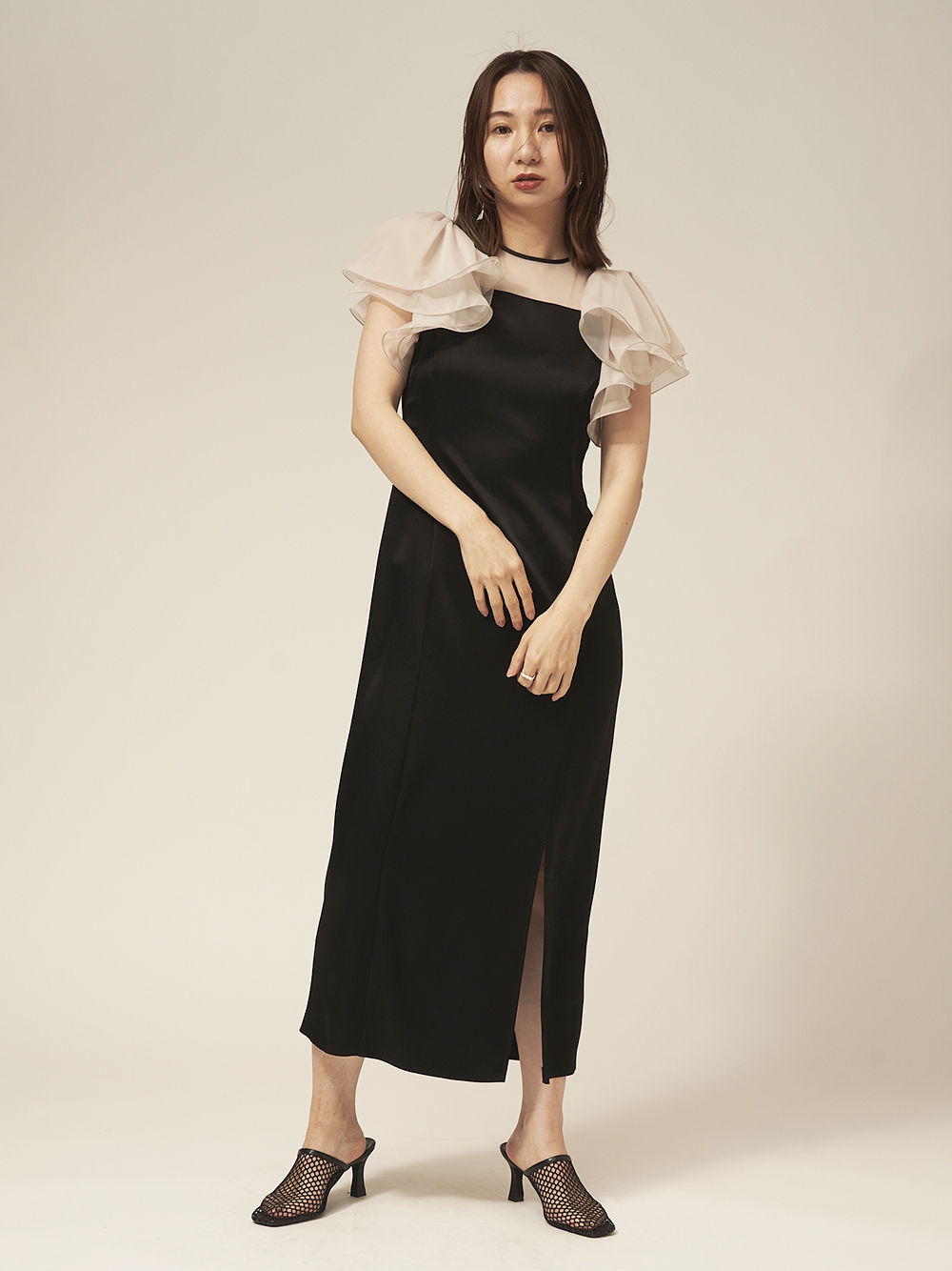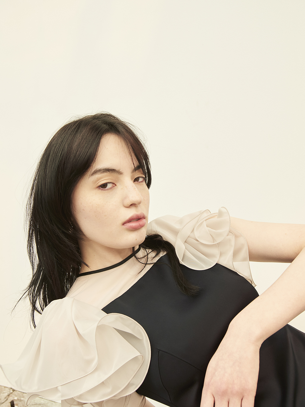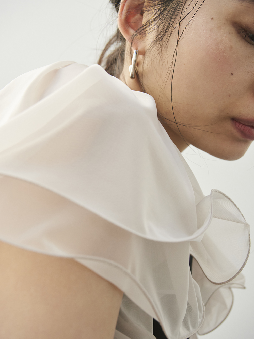 エアリーかつ立体的なラッフルスリーブで肩まわりとスリーブラインを華奢に見せながら、顔映りを華やげるクチュール感溢れるデザインが特徴。