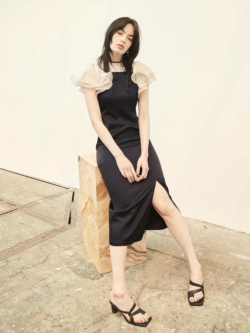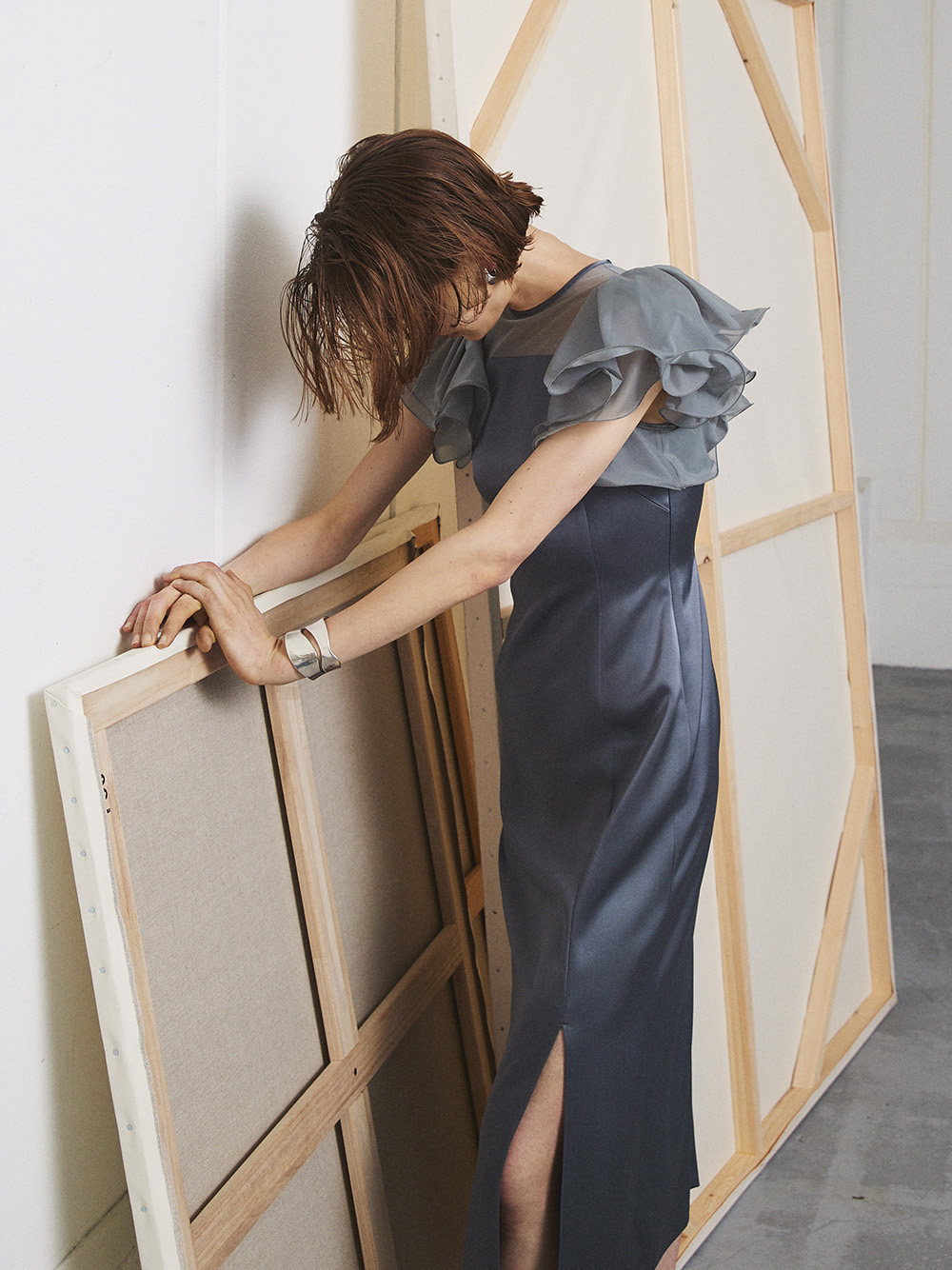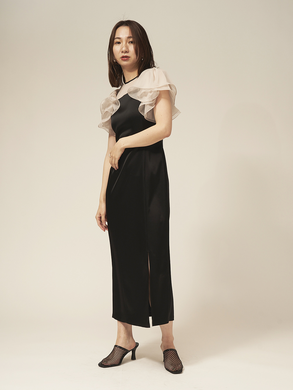 エアリーかつ立体的なラッフルスリーブで肩まわりとスリーブラインを華奢に見せながら、顔映りを華やげるクチュール感溢れるデザインが特徴。