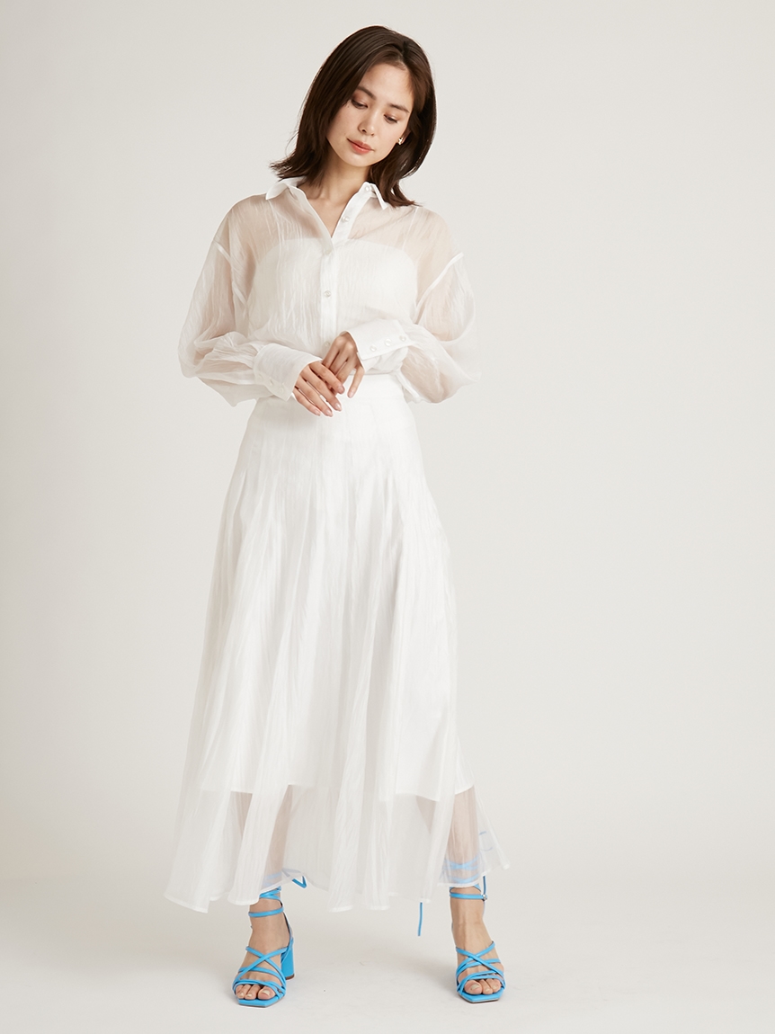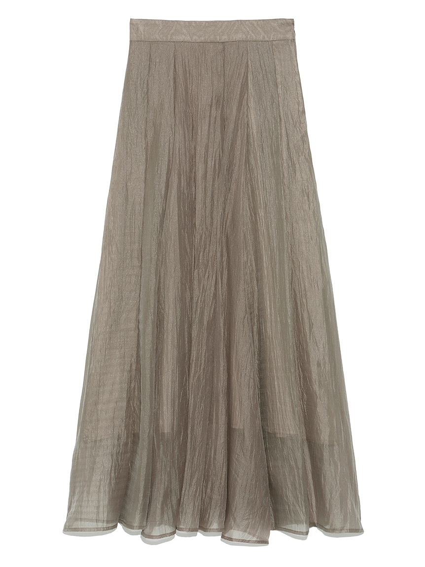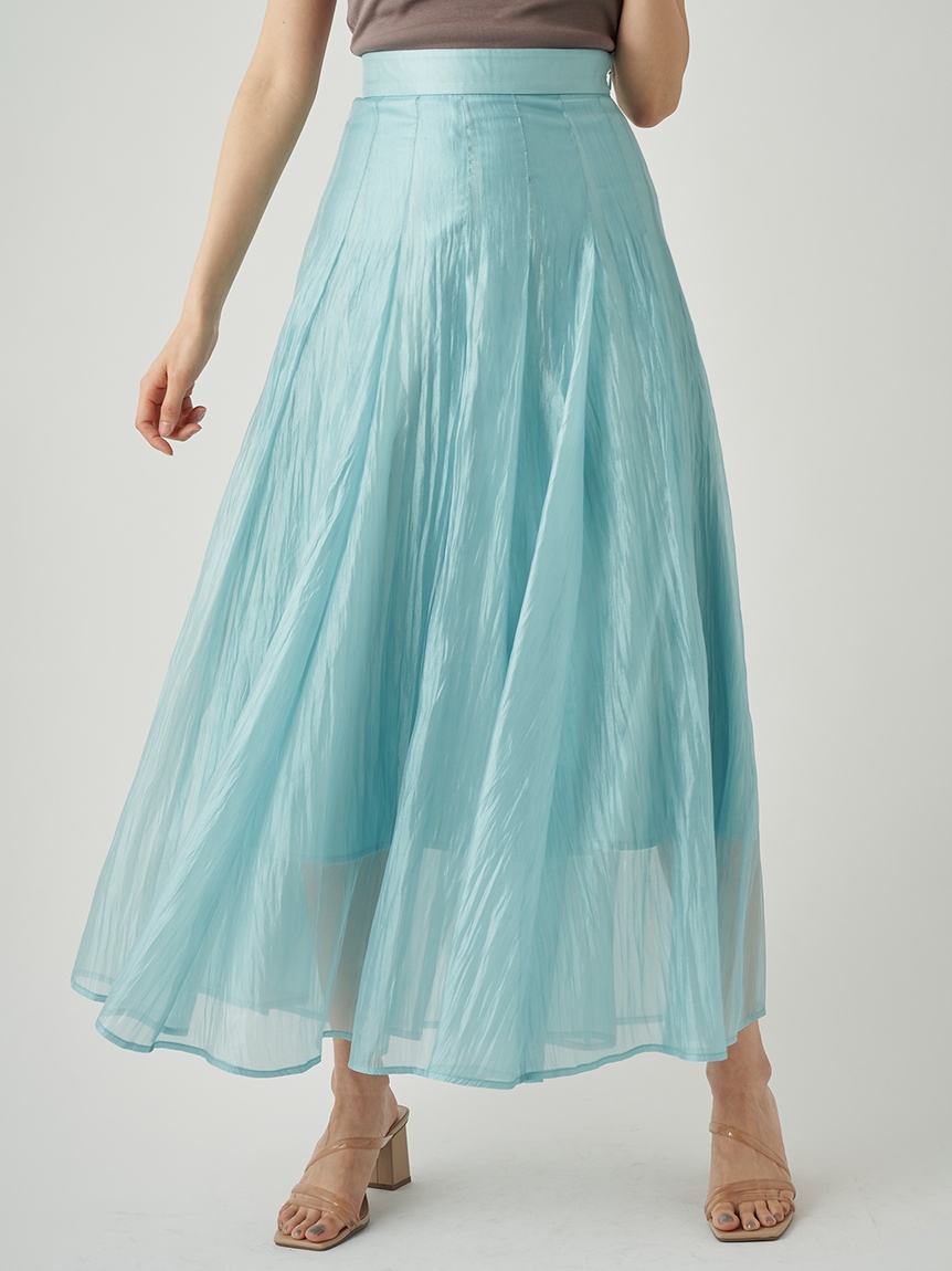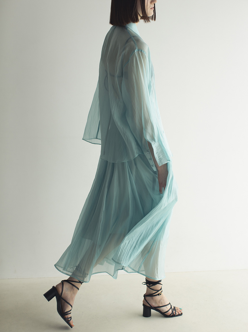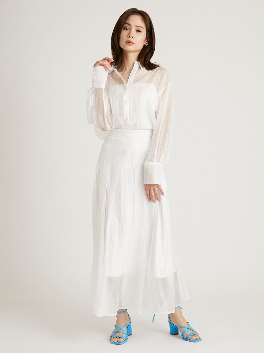 透け感のある軽やかな素材感がシーズンムードを高めるロングスカート。ウエストにたっぷりとタックを効かせたボリュームのあるフレアシルエットが、華やかな印象を与えてくれます。余計な装飾を抑えミニマルに仕上げているので着まわし力は抜群。女性らしいブラウスからカジュアルなTシャツまで幅広いアイテムと合わせやすく、同素材を用いたブラウス(SWFB222073)とセットアップで着こなすのもオススメです。