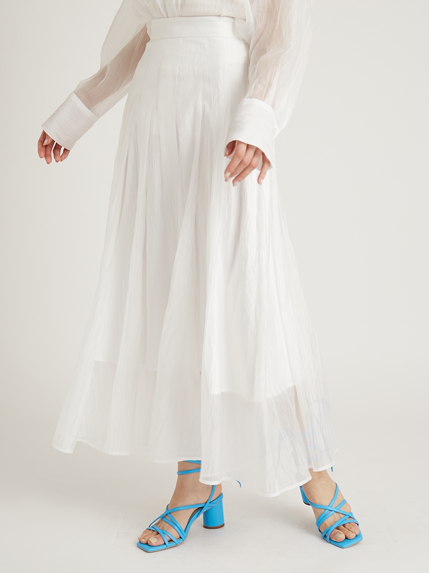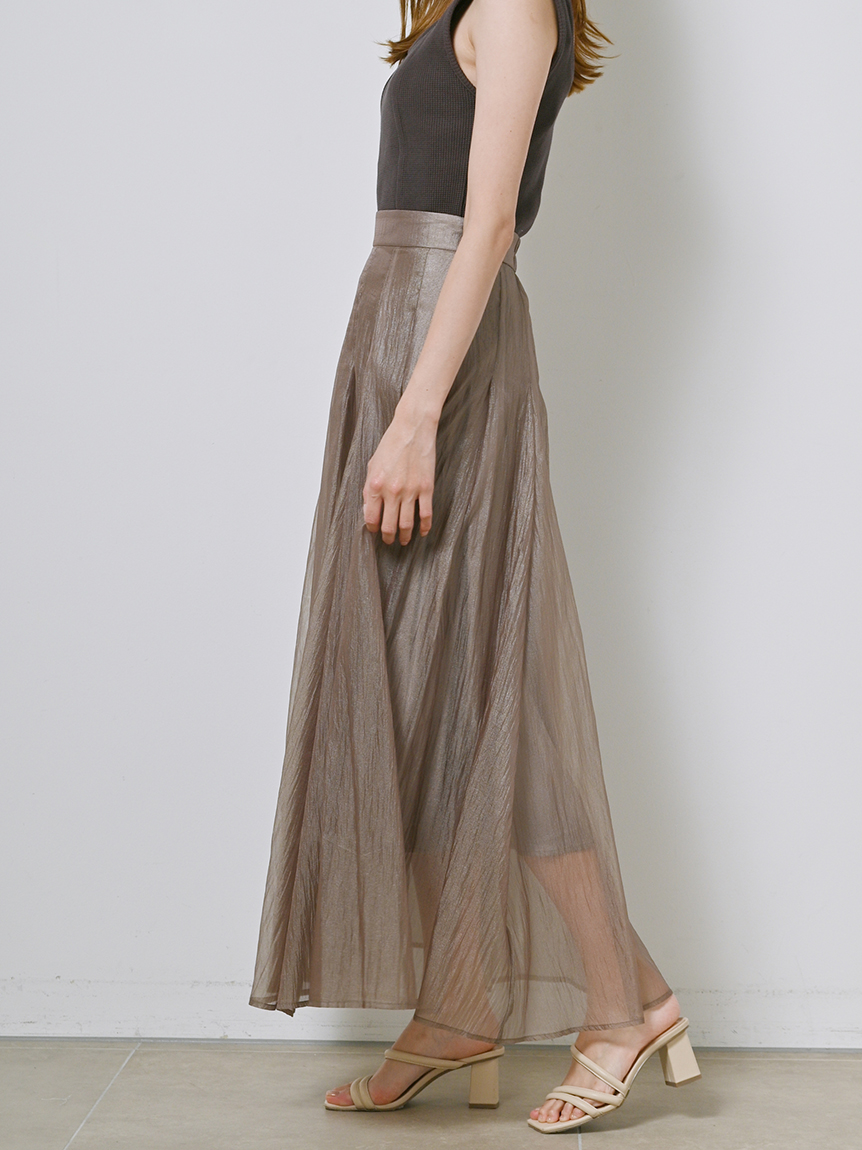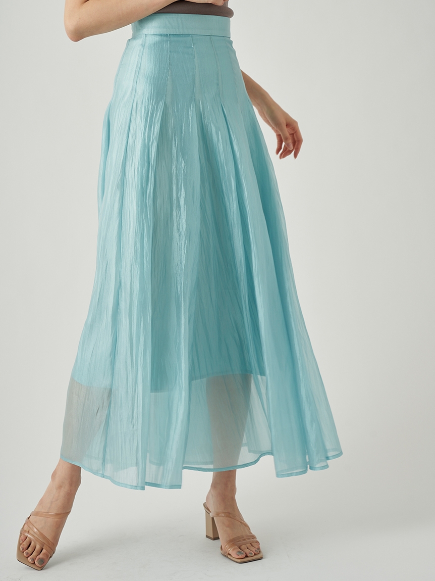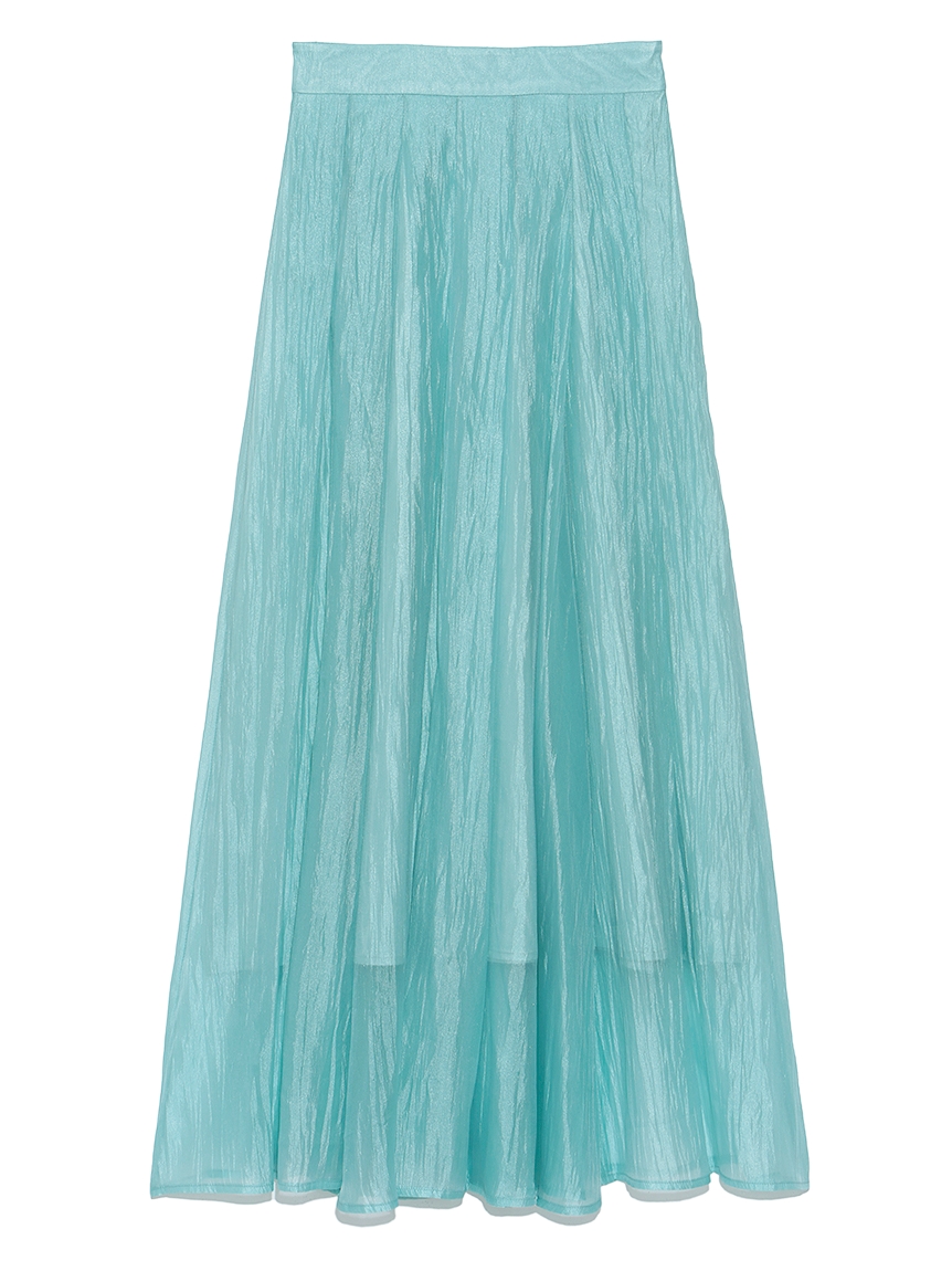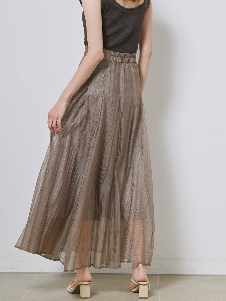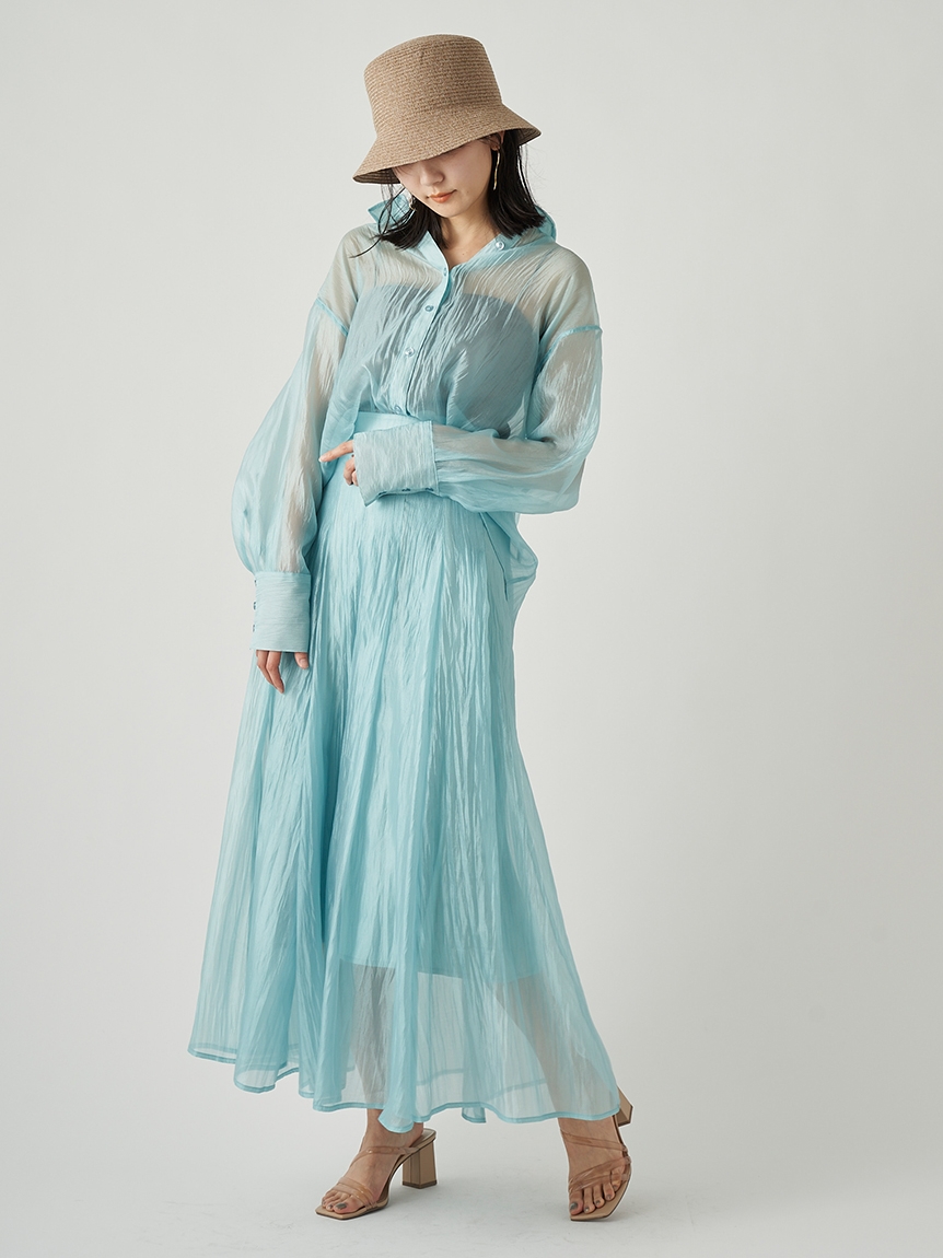 透け感のある軽やかな素材感がシーズンムードを高めるロングスカート。ウエストにたっぷりとタックを効かせたボリュームのあるフレアシルエットが、華やかな印象を与えてくれます。余計な装飾を抑えミニマルに仕上げているので着まわし力は抜群。女性らしいブラウスからカジュアルなTシャツまで幅広いアイテムと合わせやすく、同素材を用いたブラウス(SWFB222073)とセットアップで着こなすのもオススメです。