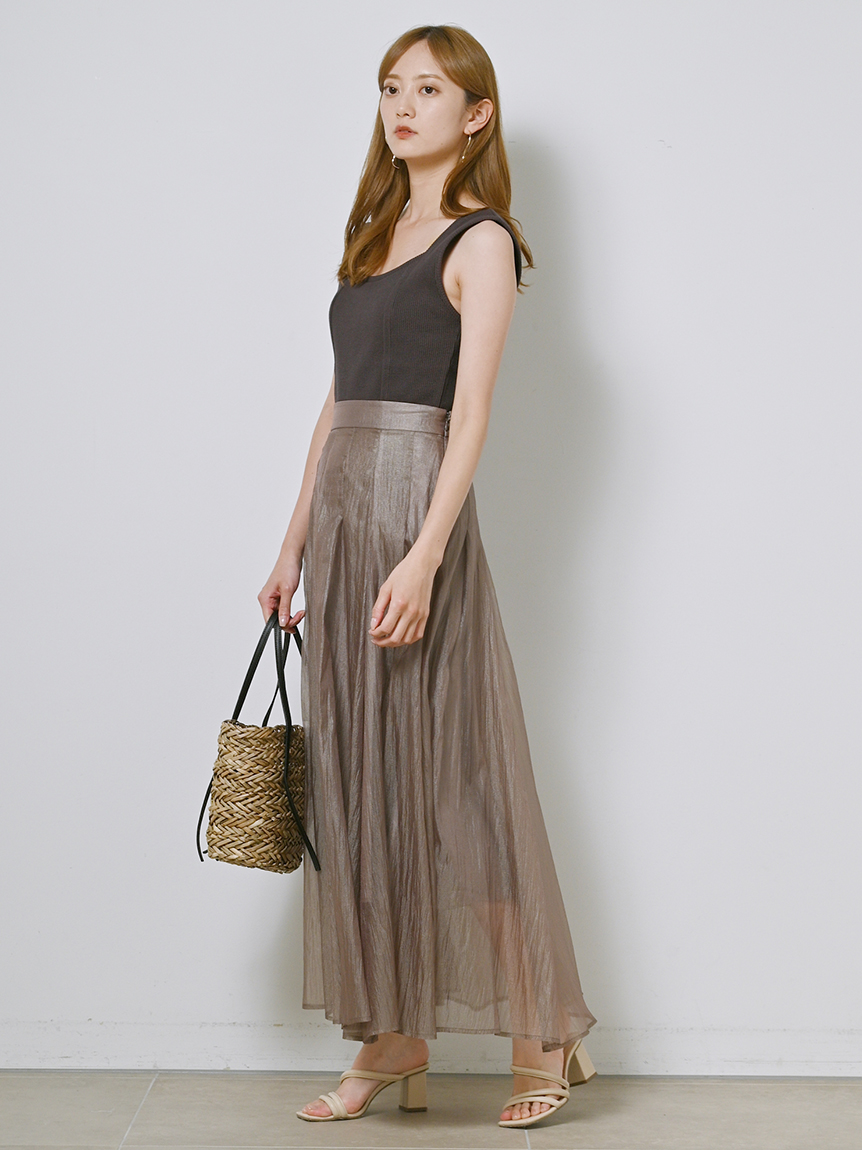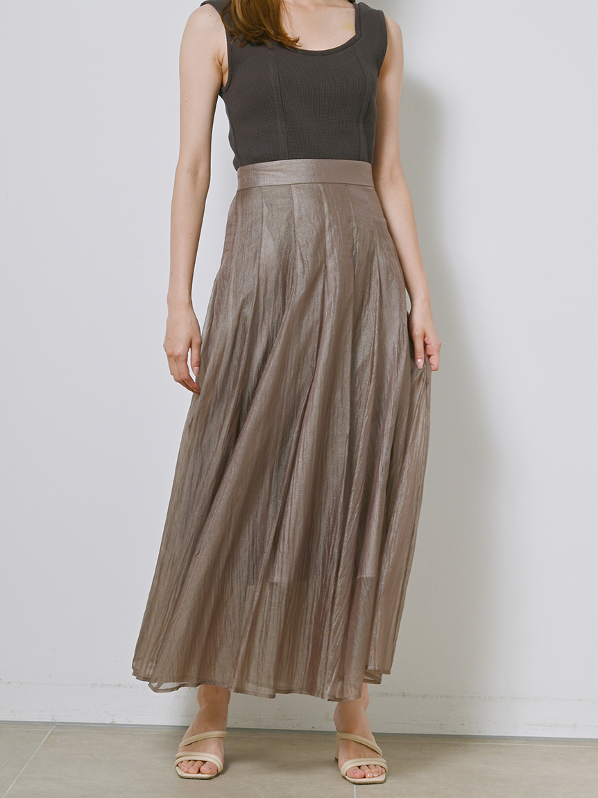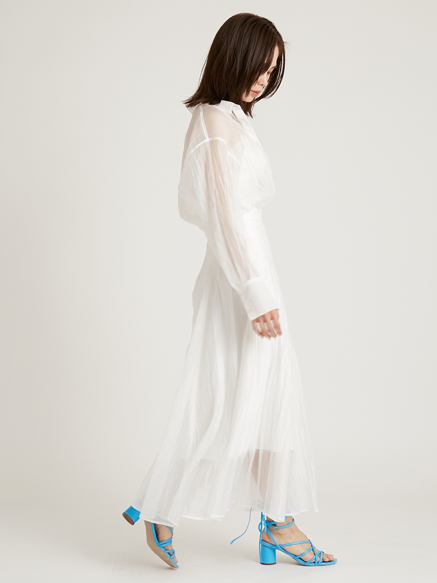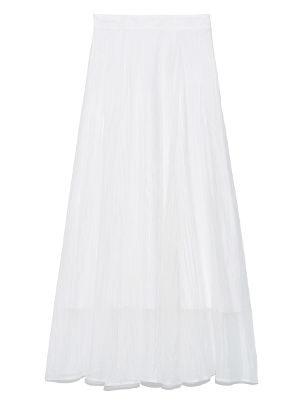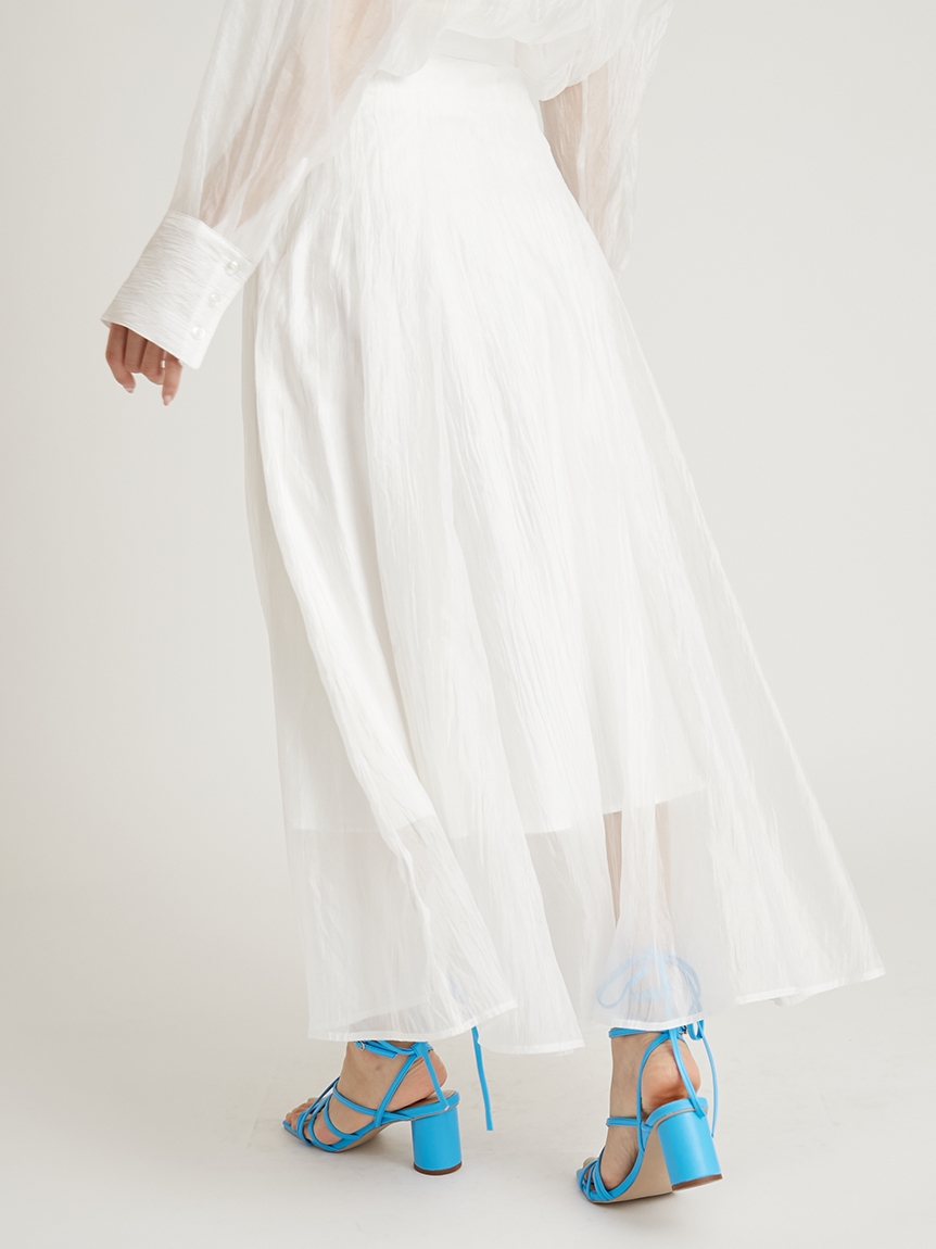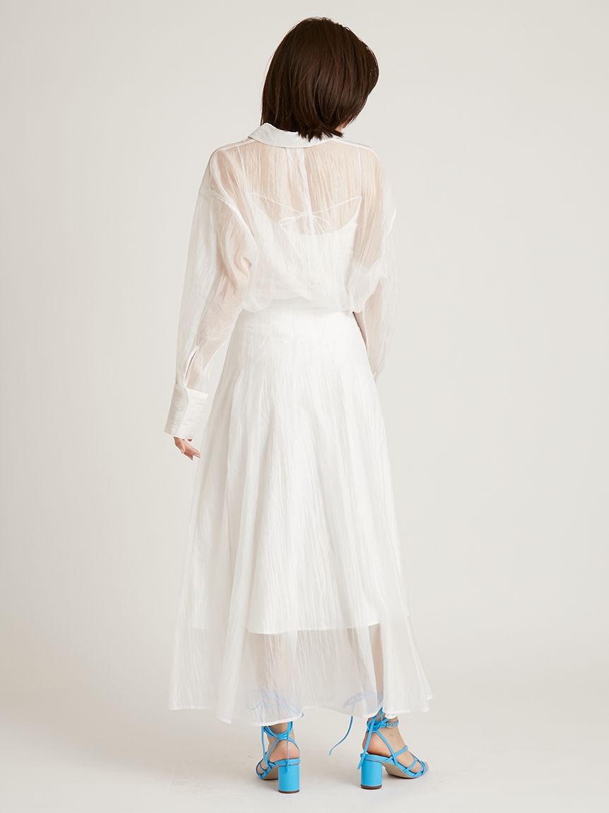 透け感のある軽やかな素材感がシーズンムードを高めるロングスカート。ウエストにたっぷりとタックを効かせたボリュームのあるフレアシルエットが、華やかな印象を与えてくれます。余計な装飾を抑えミニマルに仕上げているので着まわし力は抜群。女性らしいブラウスからカジュアルなTシャツまで幅広いアイテムと合わせやすく、同素材を用いたブラウス(SWFB222073)とセットアップで着こなすのもオススメです。