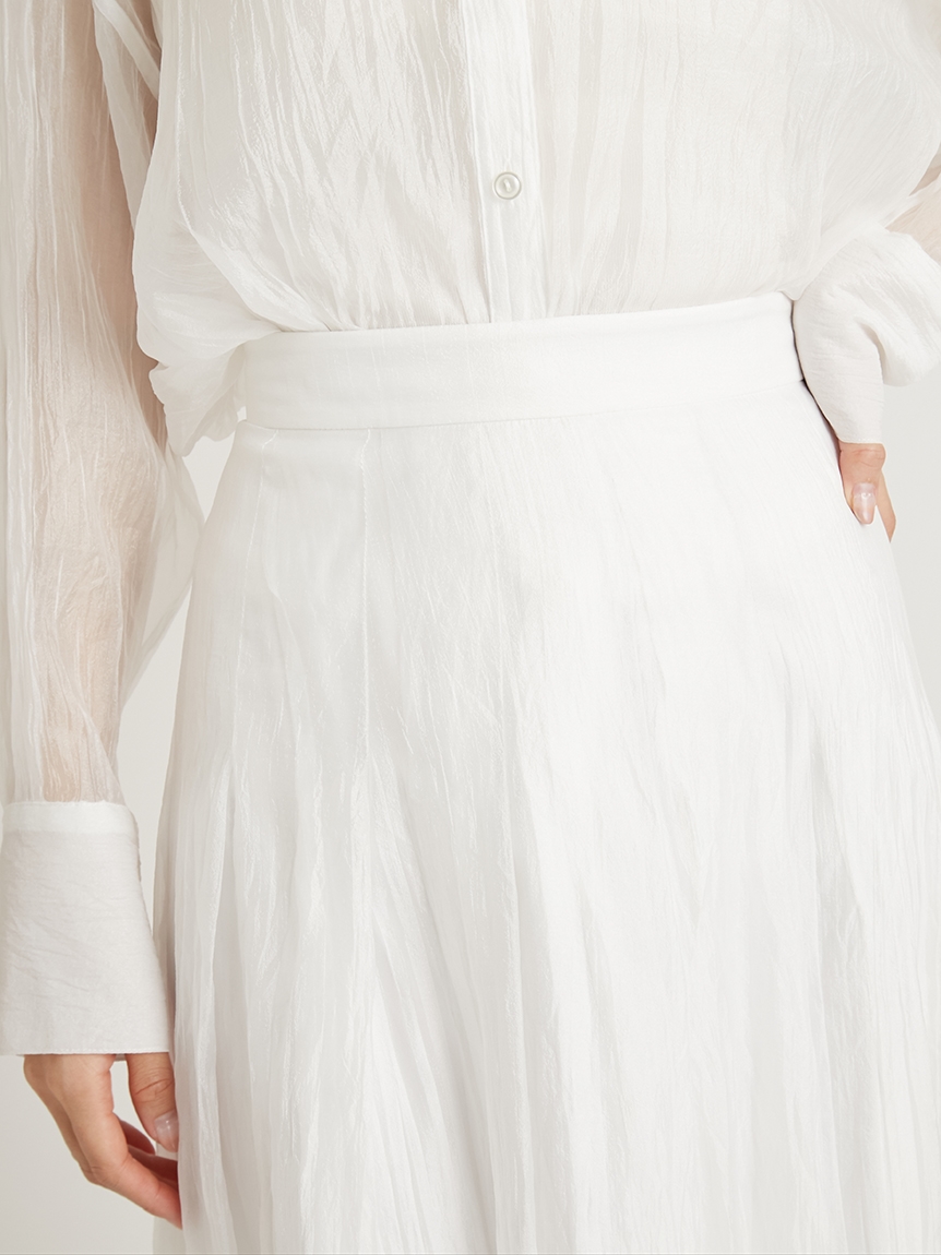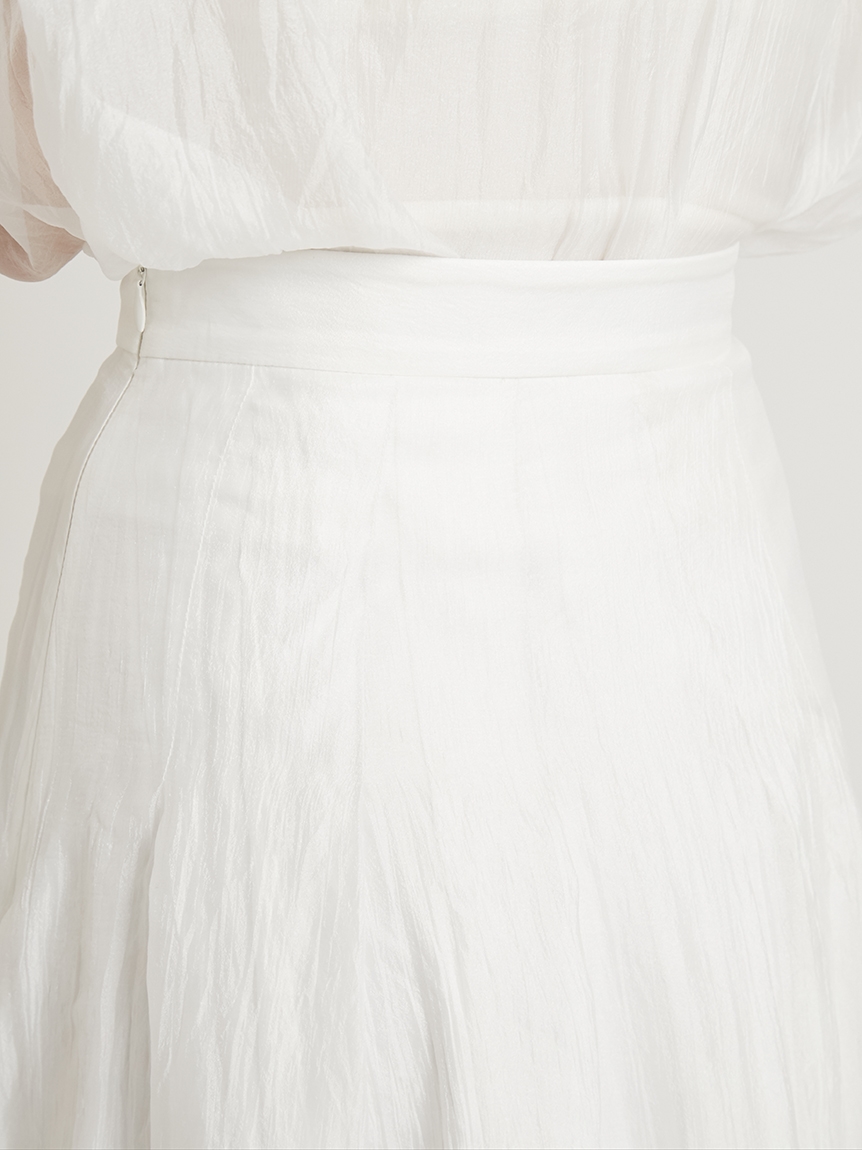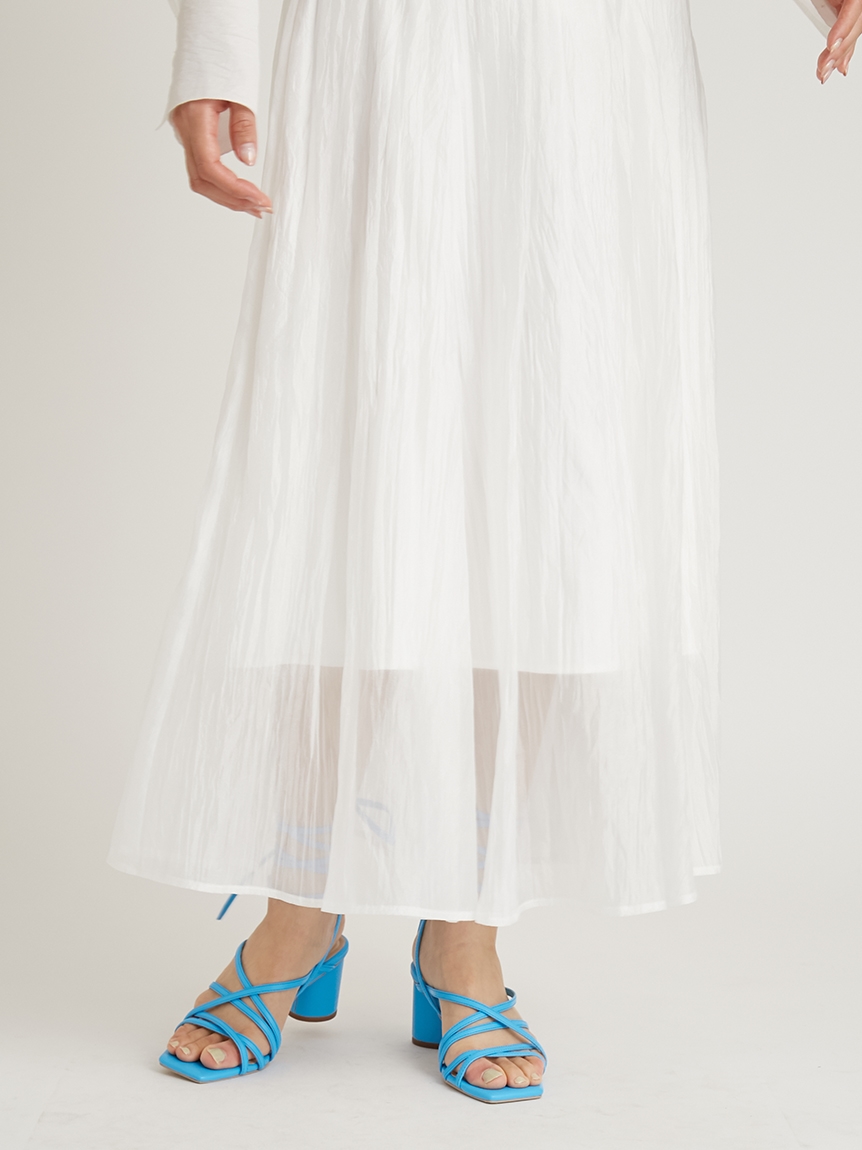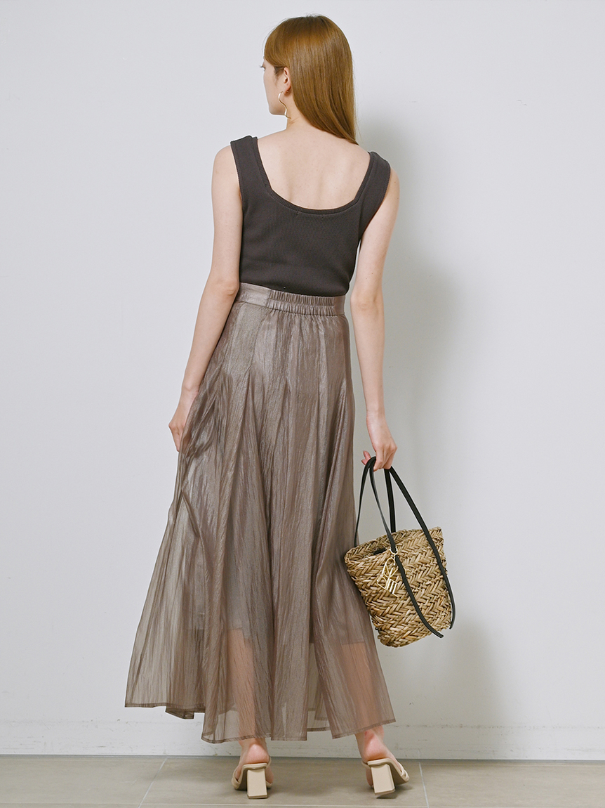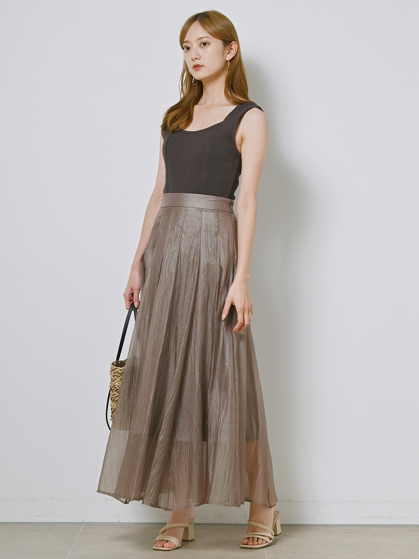 透け感のある軽やかな素材感がシーズンムードを高めるロングスカート。ウエストにたっぷりとタックを効かせたボリュームのあるフレアシルエットが、華やかな印象を与えてくれます。余計な装飾を抑えミニマルに仕上げているので着まわし力は抜群。女性らしいブラウスからカジュアルなTシャツまで幅広いアイテムと合わせやすく、同素材を用いたブラウス(SWFB222073)とセットアップで着こなすのもオススメです。