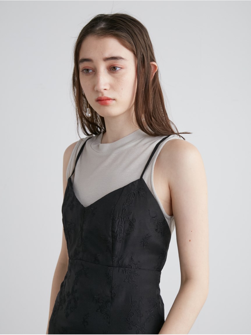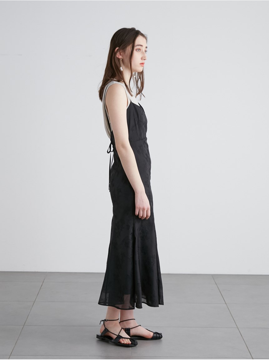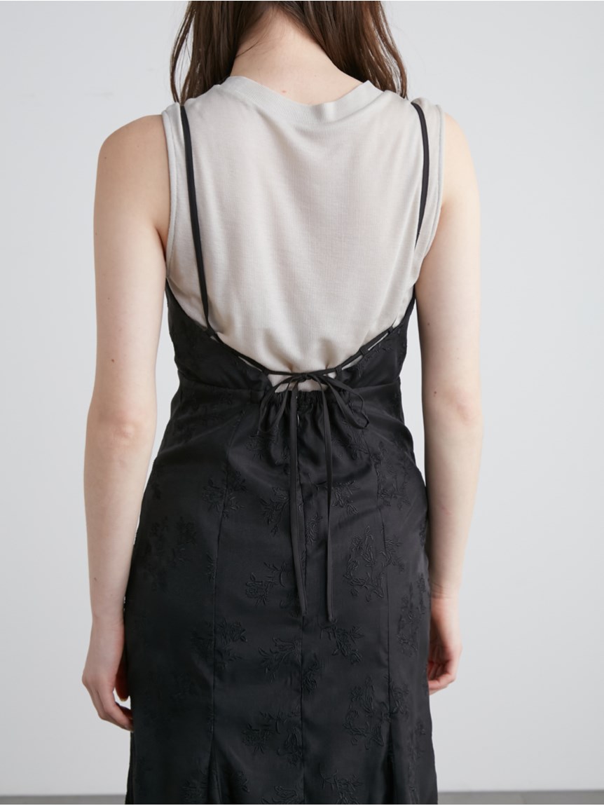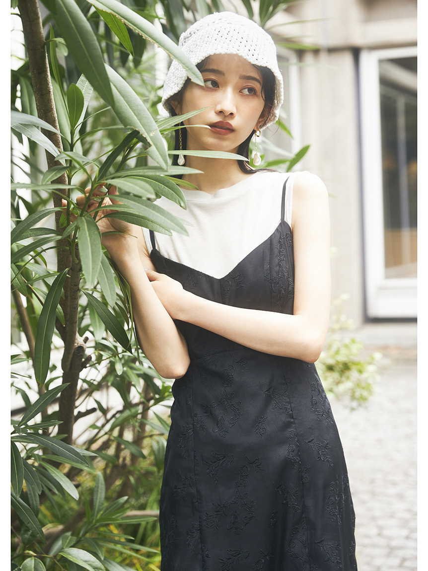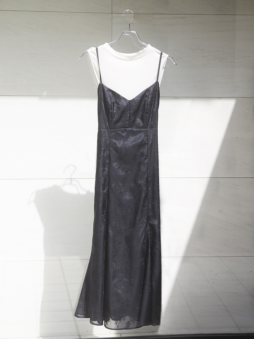 オリジナルフラワー刺繍の生地を使用したキャミワンピースとカットタンクのセットアイテム。ワンピースはマチを入れて裾にかけてボリュームを入れ、女性らしいマーメイドシルエットをメイク。大胆に開いた背中部分にリボンをあしらい、後ろ姿まで抜かりなく仕上げています。それぞれ別々でも活躍してくれるので、スタイリングの幅は一気に広がります。