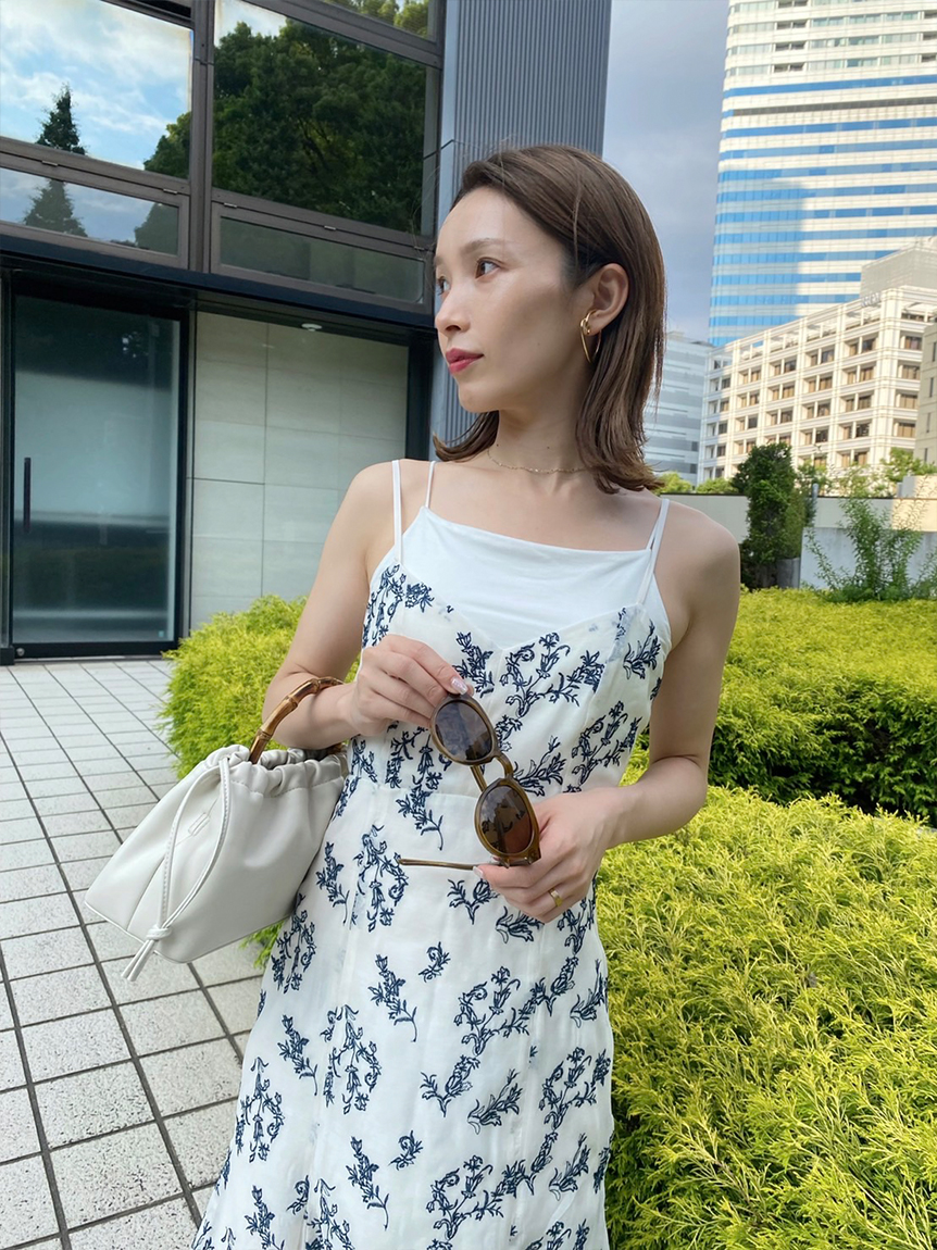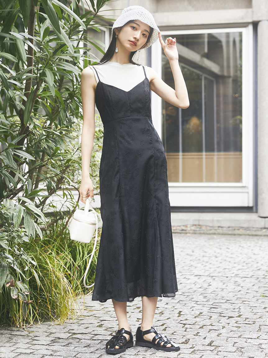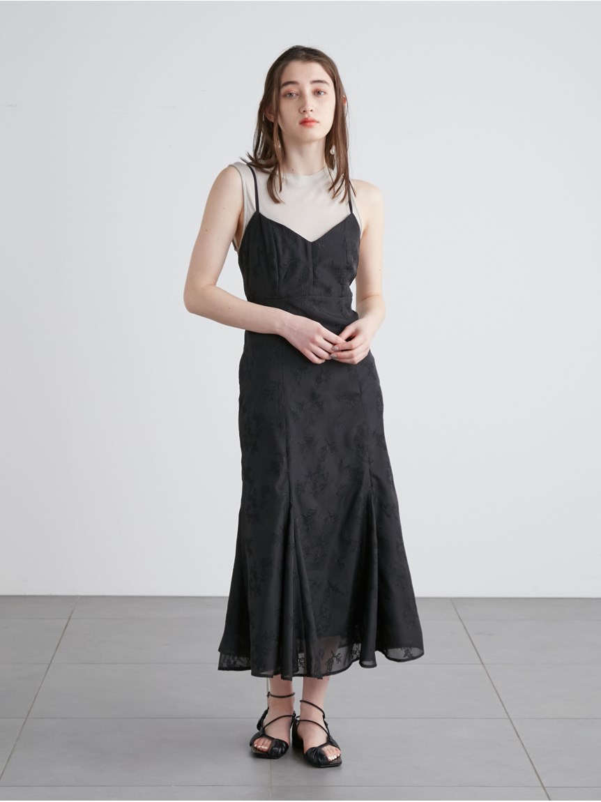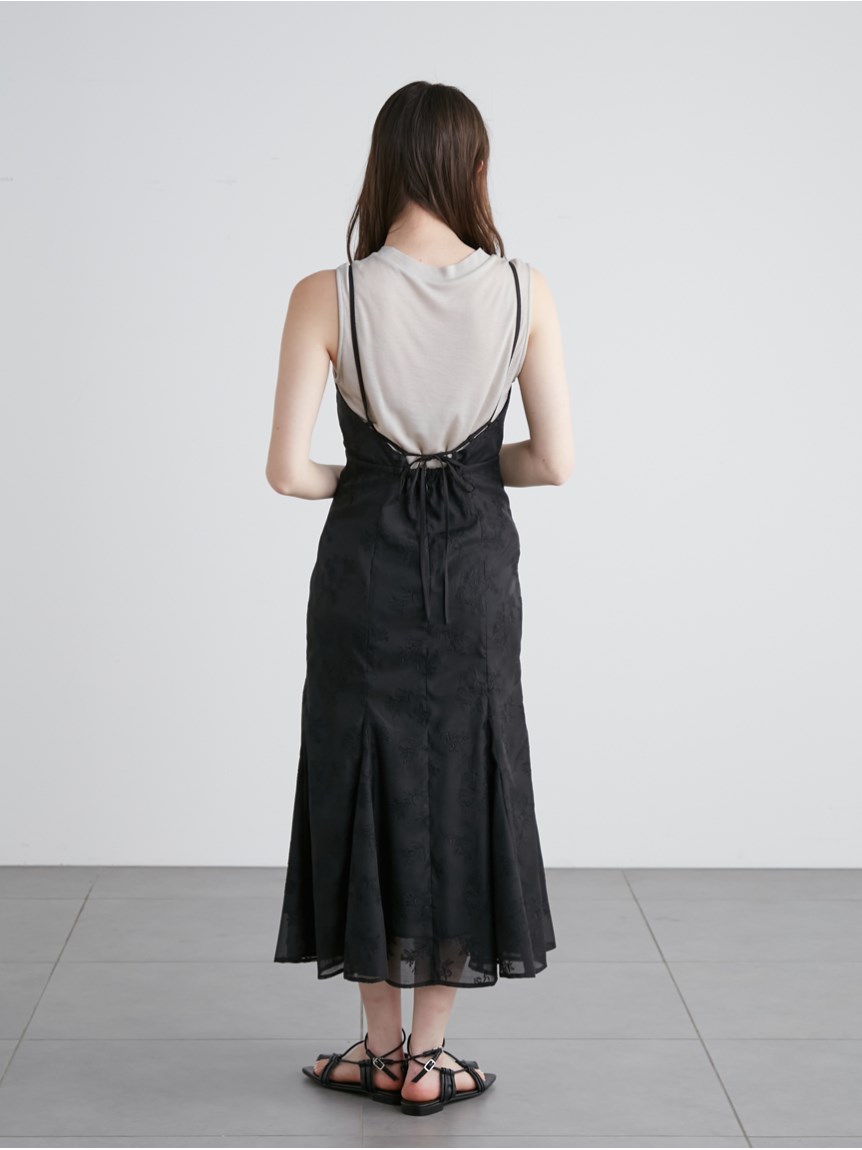 オリジナルフラワー刺繍の生地を使用したキャミワンピースとカットタンクのセットアイテム。ワンピースはマチを入れて裾にかけてボリュームを入れ、女性らしいマーメイドシルエットをメイク。大胆に開いた背中部分にリボンをあしらい、後ろ姿まで抜かりなく仕上げています。それぞれ別々でも活躍してくれるので、スタイリングの幅は一気に広がります。