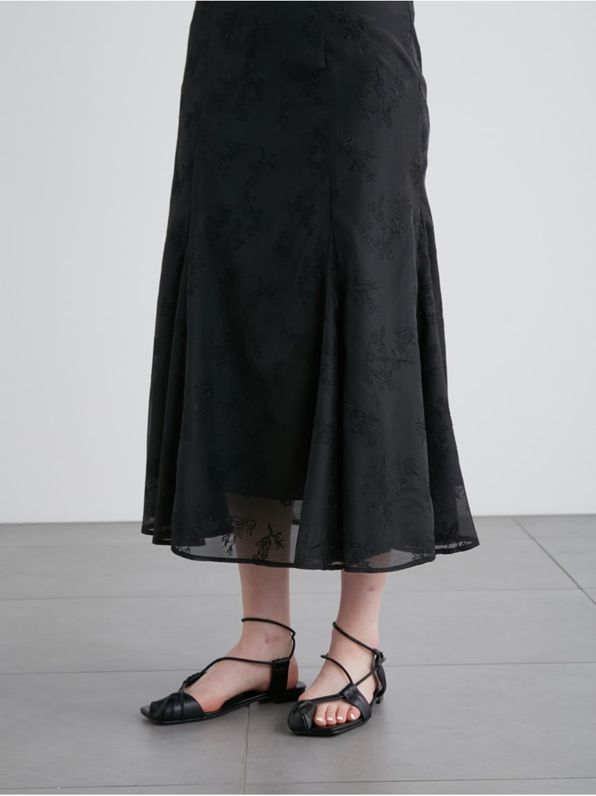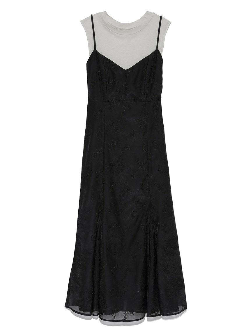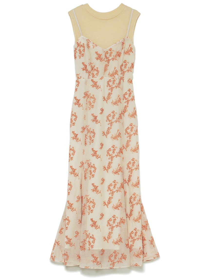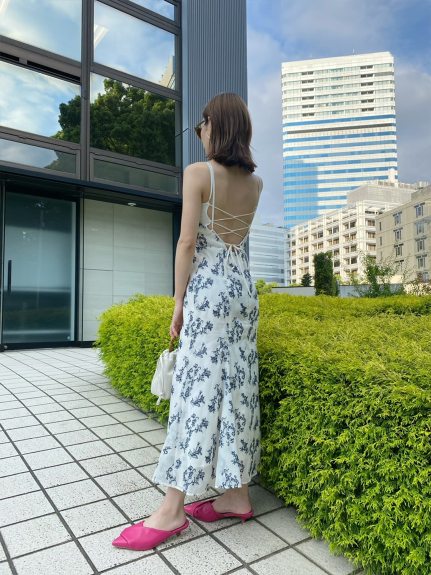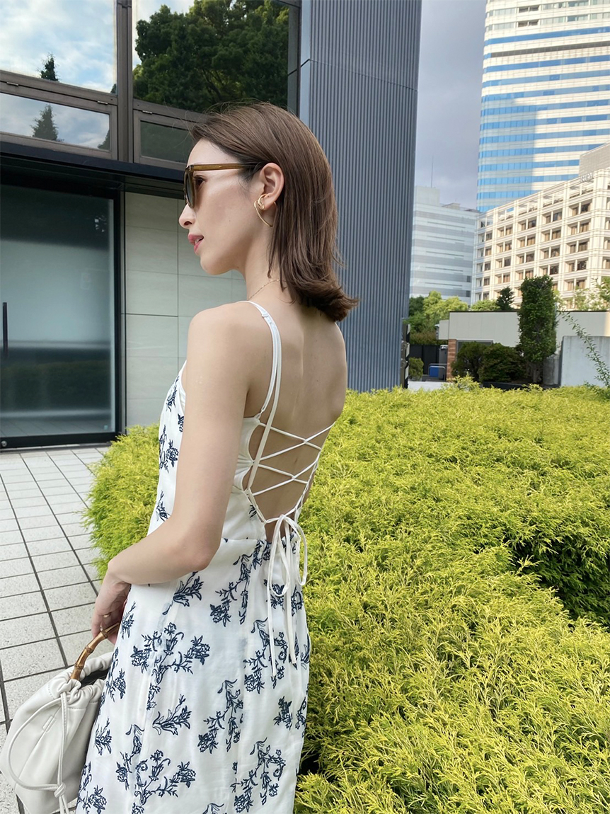 オリジナルフラワー刺繍の生地を使用したキャミワンピースとカットタンクのセットアイテム。ワンピースはマチを入れて裾にかけてボリュームを入れ、女性らしいマーメイドシルエットをメイク。大胆に開いた背中部分にリボンをあしらい、後ろ姿まで抜かりなく仕上げています。それぞれ別々でも活躍してくれるので、スタイリングの幅は一気に広がります。