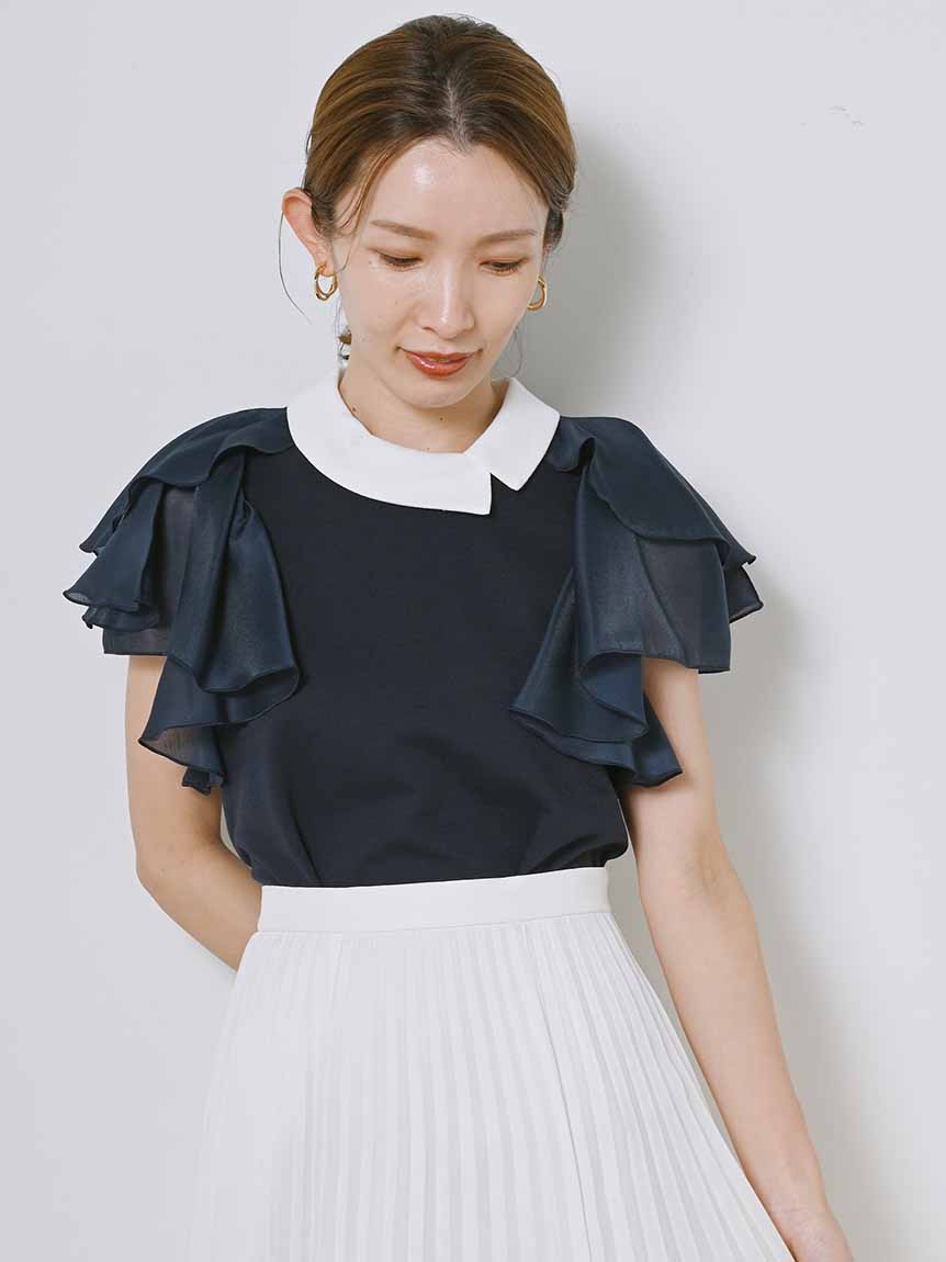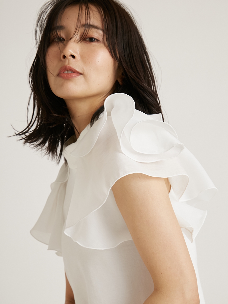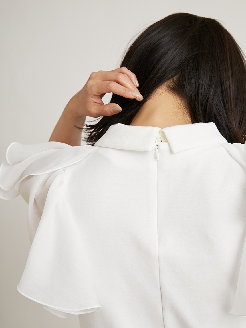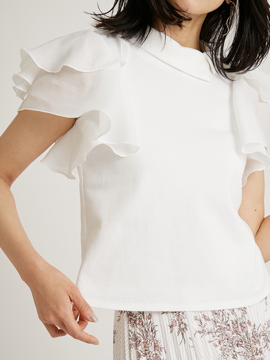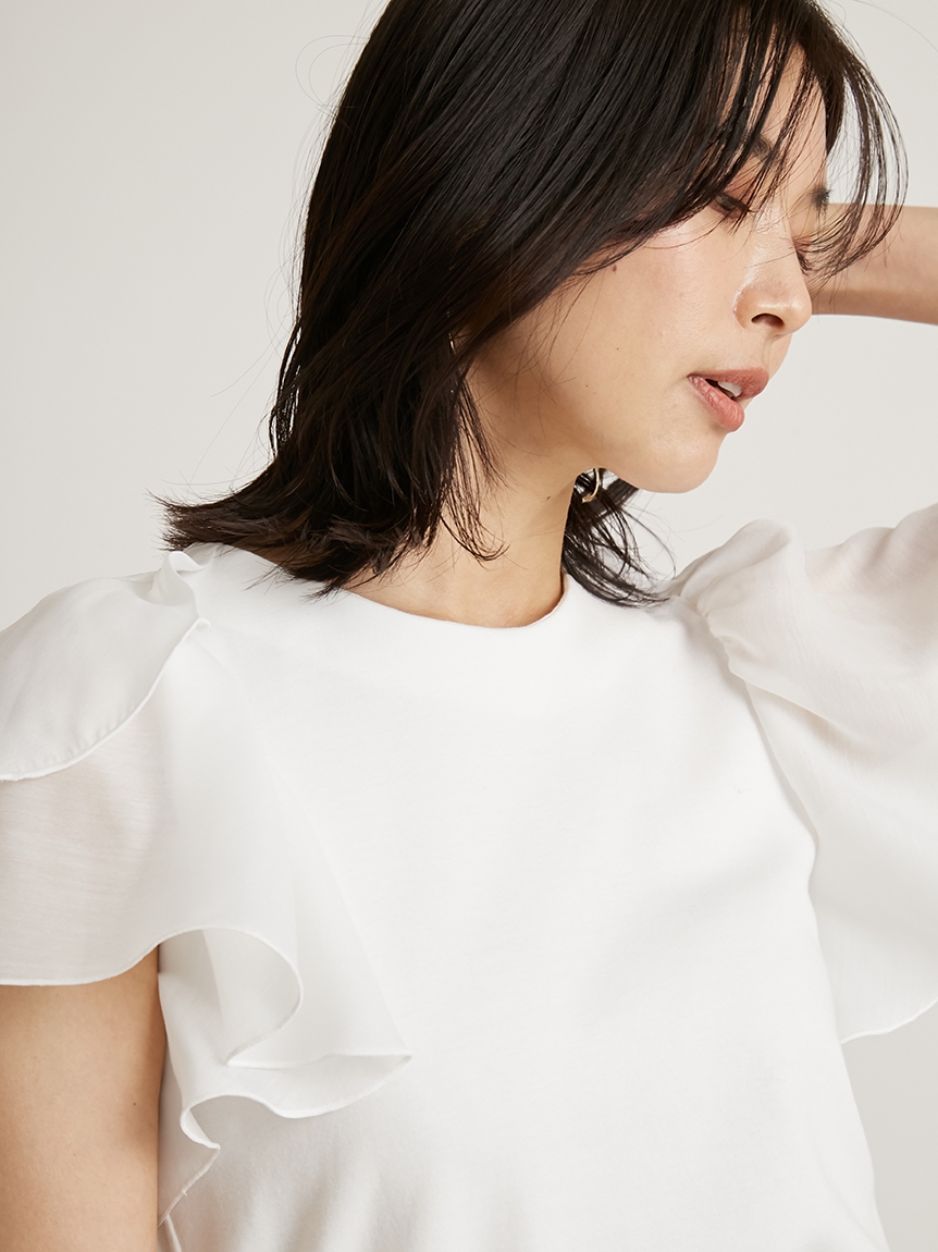 ひらひらと波打つフリリーな袖が印象的なカットトップス。軽やかなシアー素材を用いることで、女性らしい柔らかな表情に仕上げました。クラシカルなロールカラーは取り外しができ、シンプルな丸襟にアレンジ可能。ボディラインに沿うすっきりとしたシルエットなのでパンツともスカートとも合わせやすく、幅広いコーディネートに活躍してくれます。