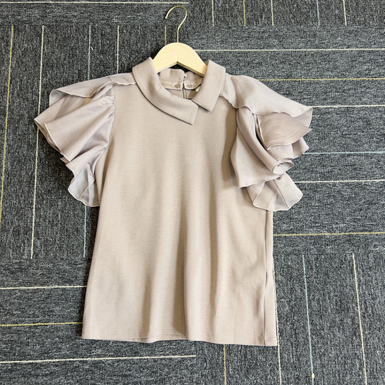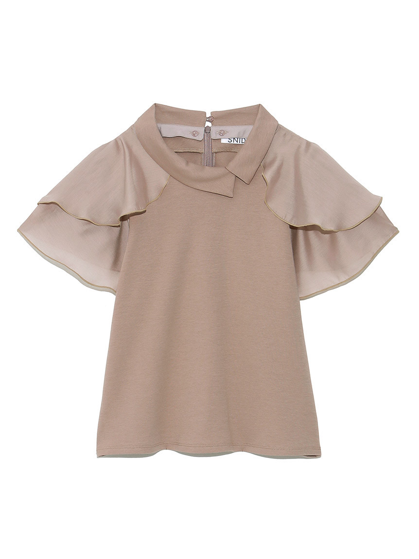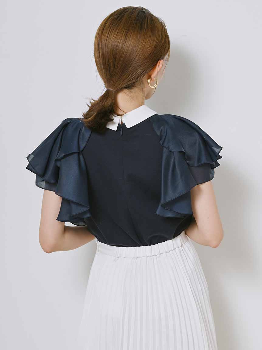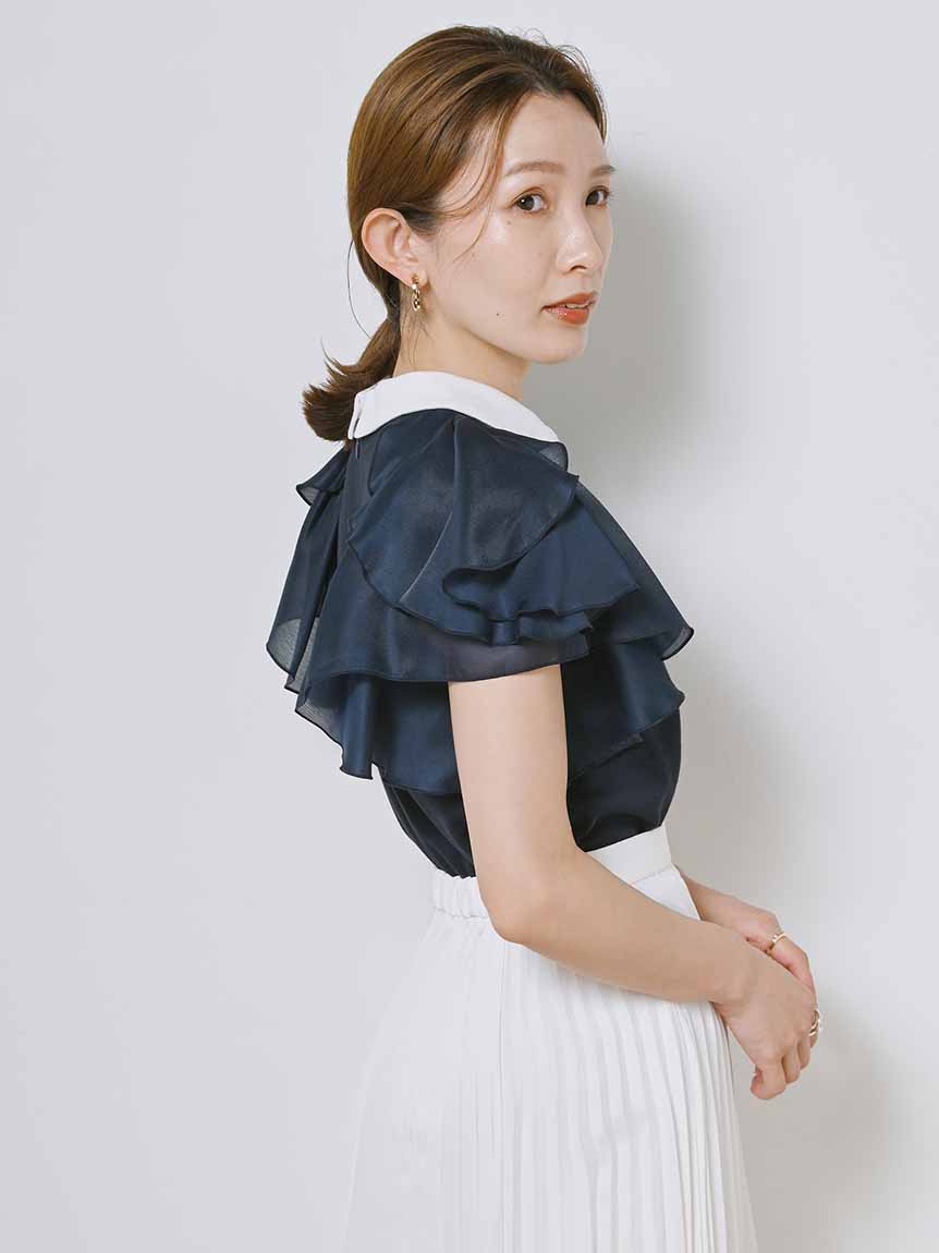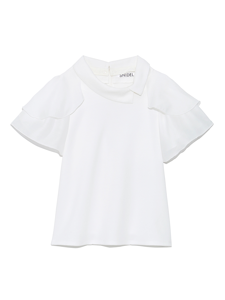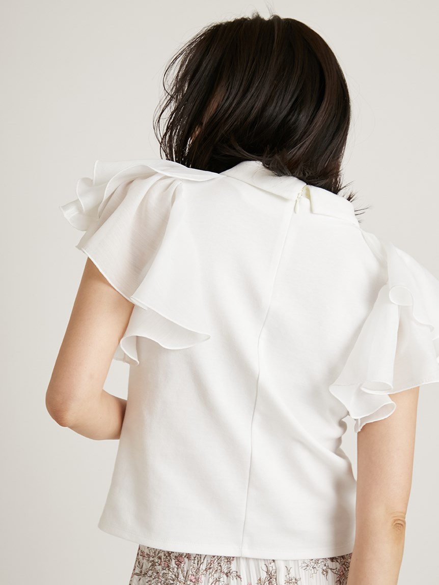 ひらひらと波打つフリリーな袖が印象的なカットトップス。軽やかなシアー素材を用いることで、女性らしい柔らかな表情に仕上げました。クラシカルなロールカラーは取り外しができ、シンプルな丸襟にアレンジ可能。ボディラインに沿うすっきりとしたシルエットなのでパンツともスカートとも合わせやすく、幅広いコーディネートに活躍してくれます。