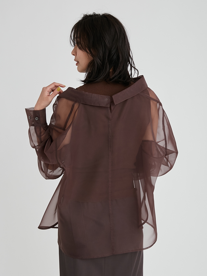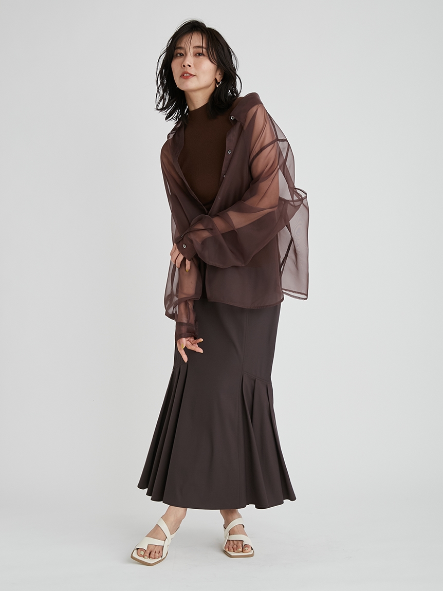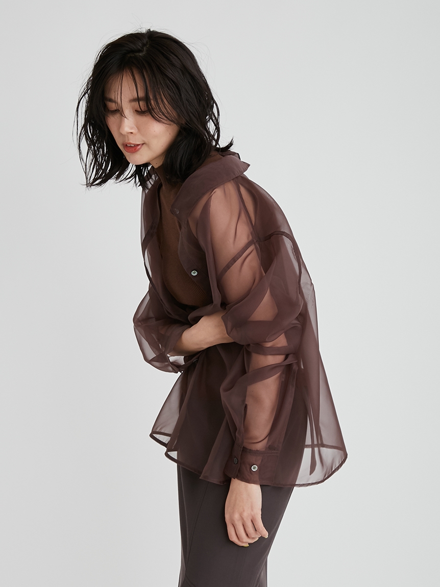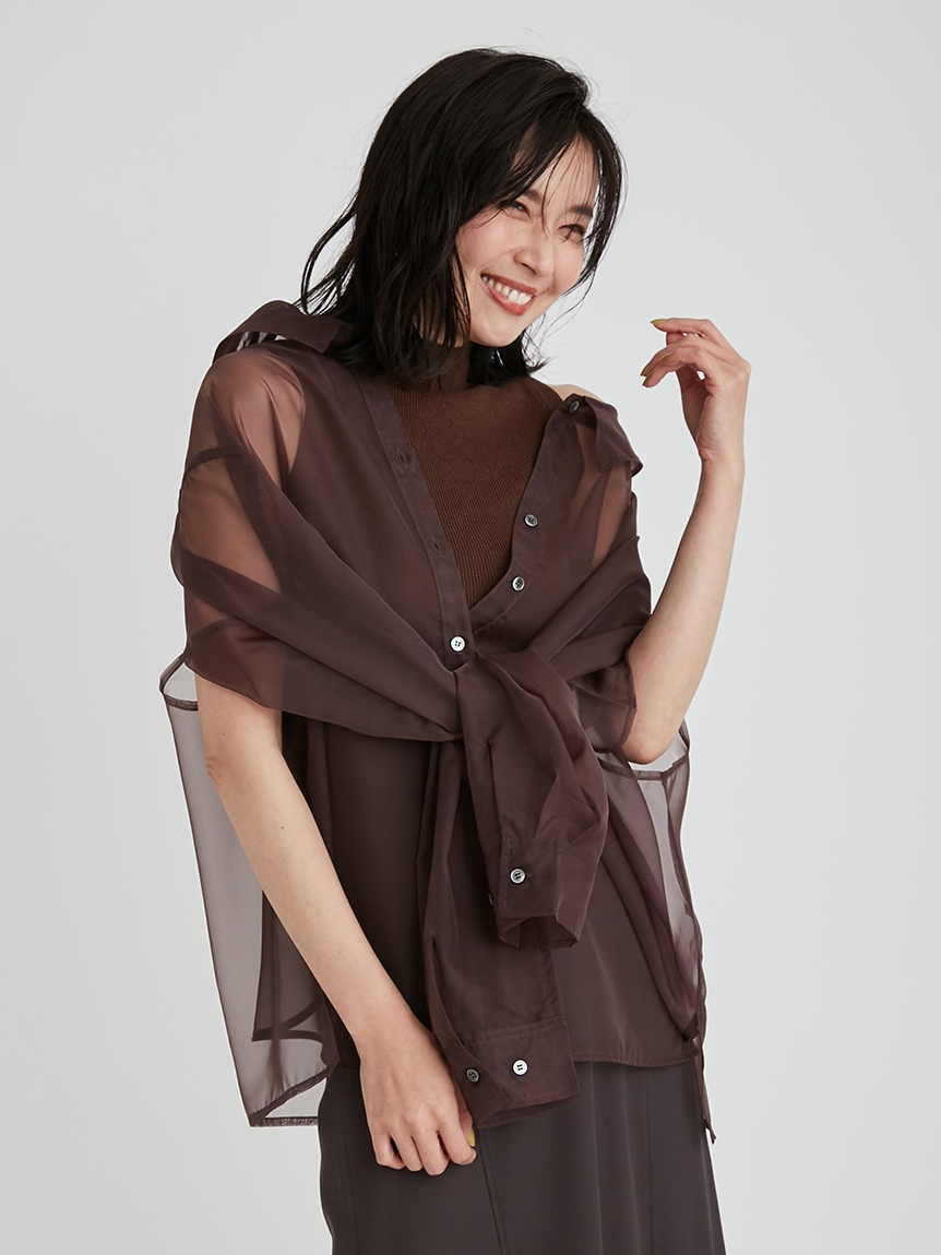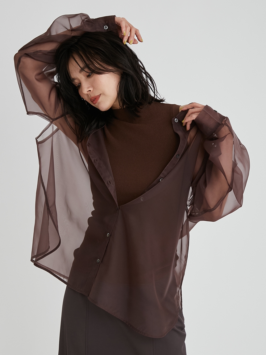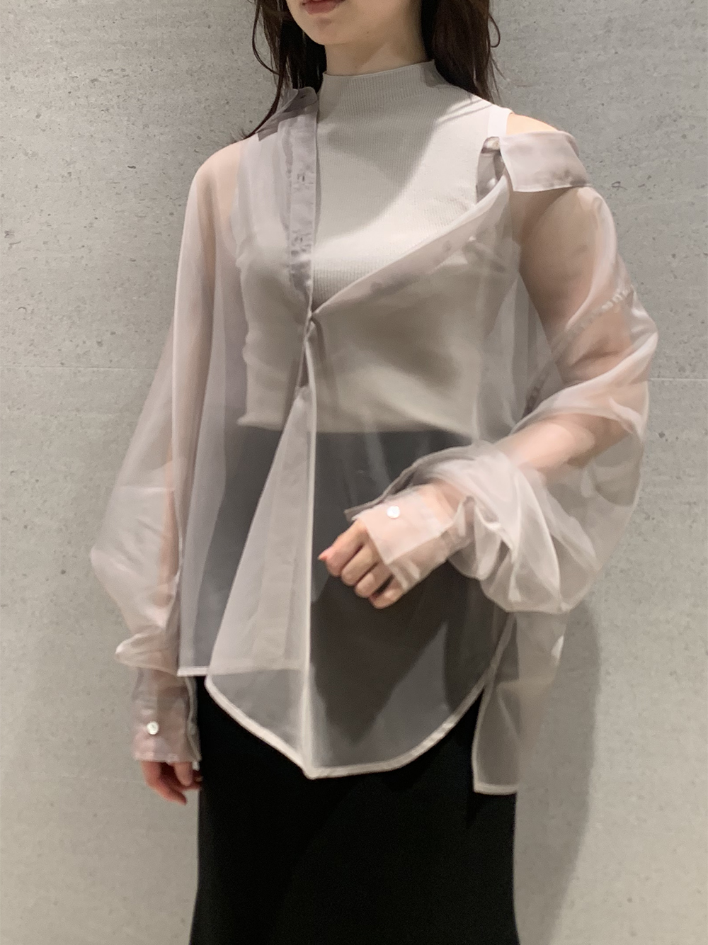 顔まわりがすっきり見えるモックネックニットと透け感のあるオーバーサイズのシースルーシャツをワントーンで揃えた異素材のレイヤード仕様で、肩まわりの抜け感を程よくキープしたデザインです。