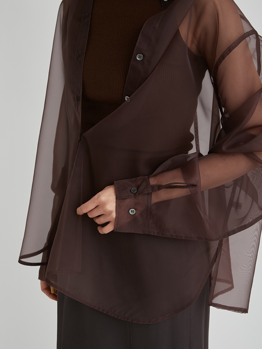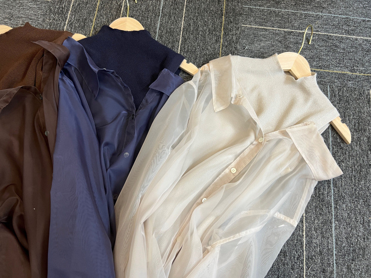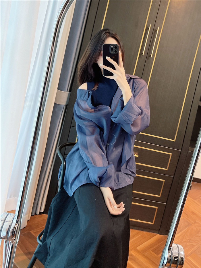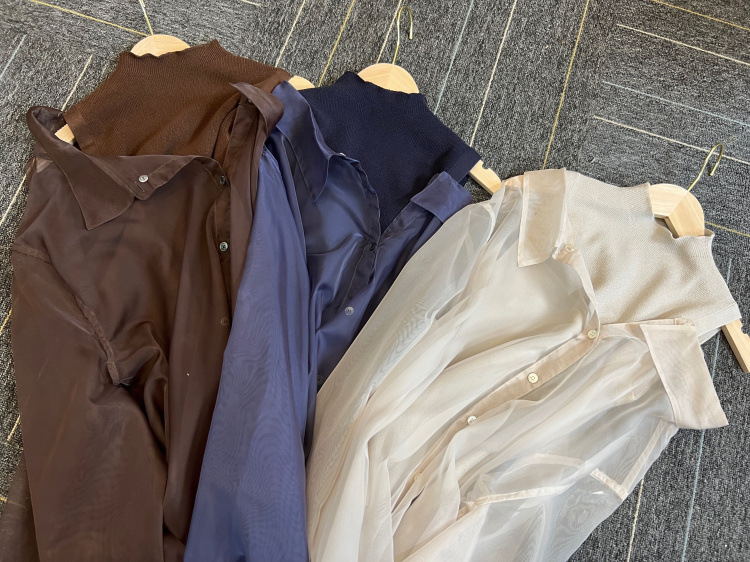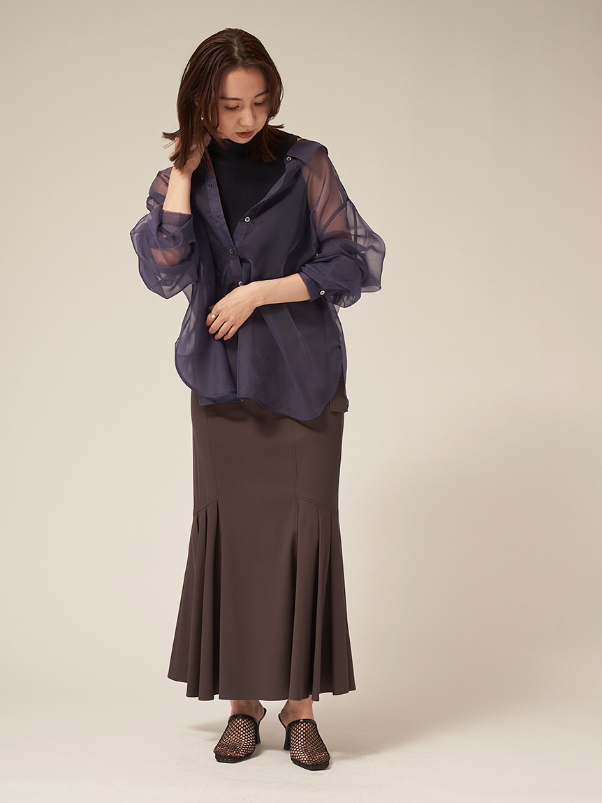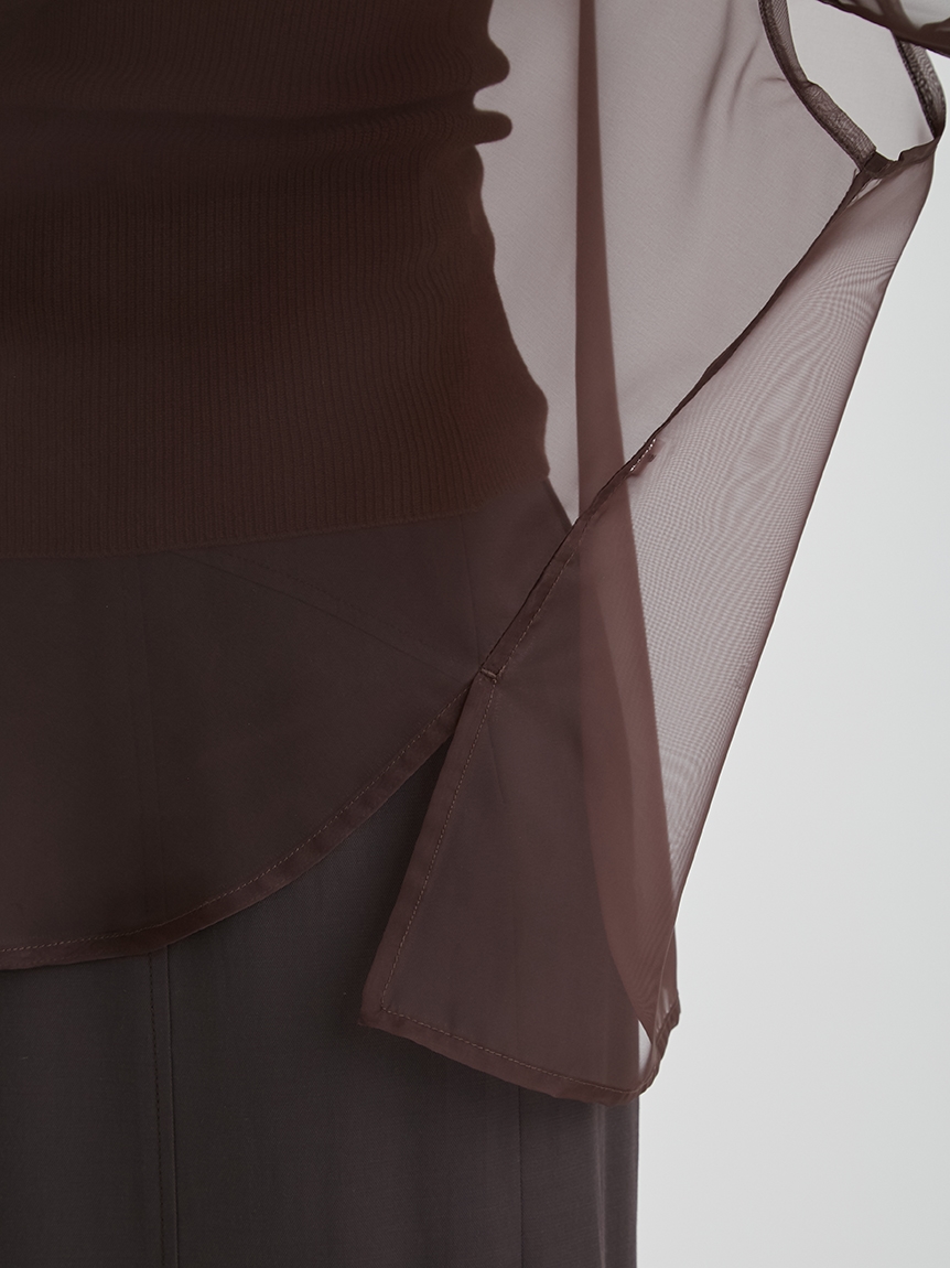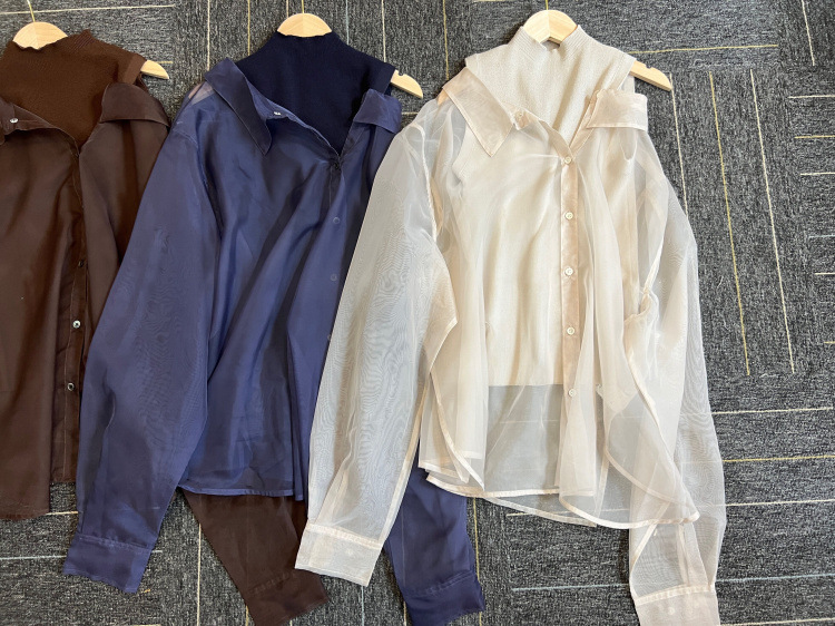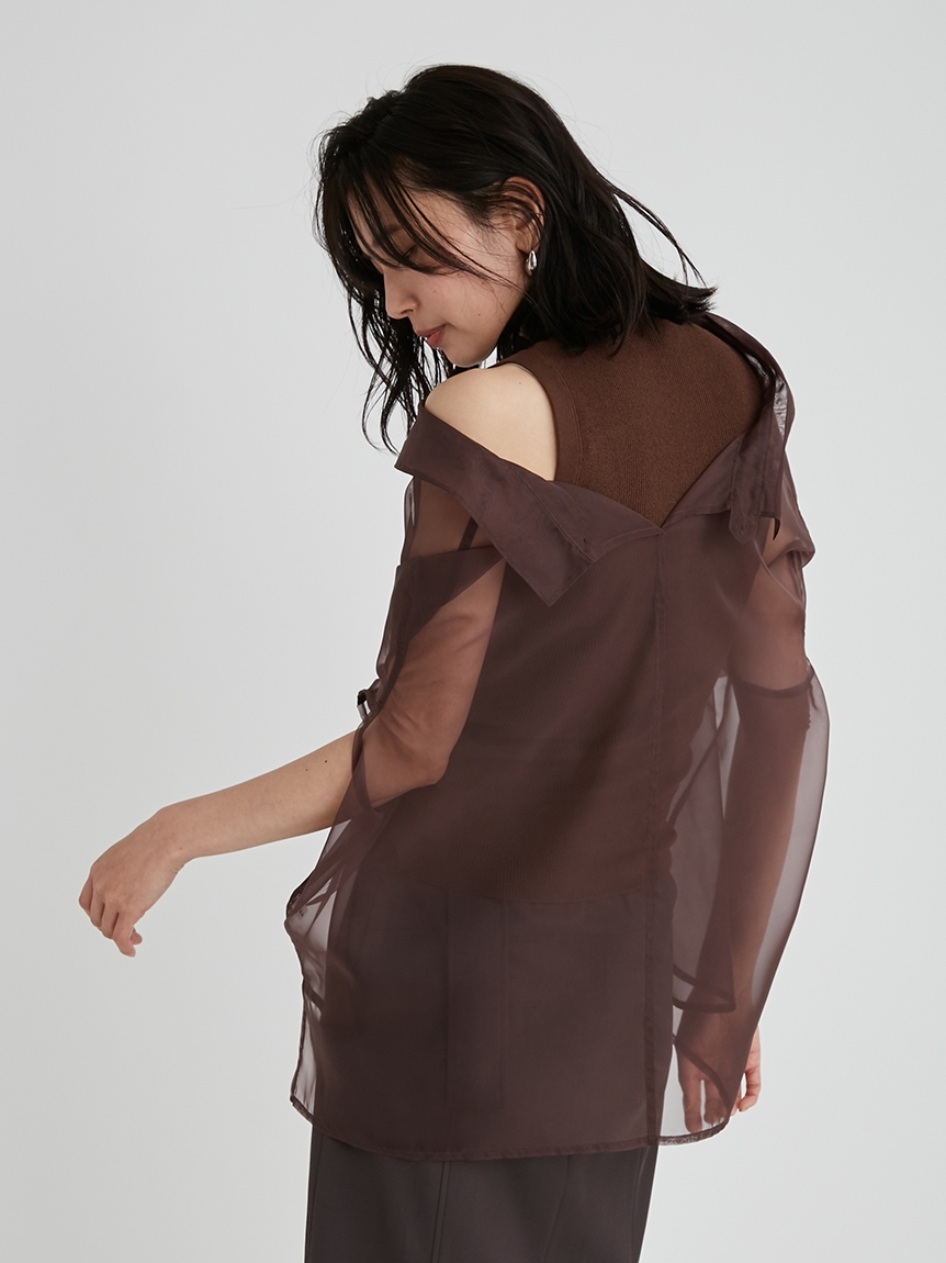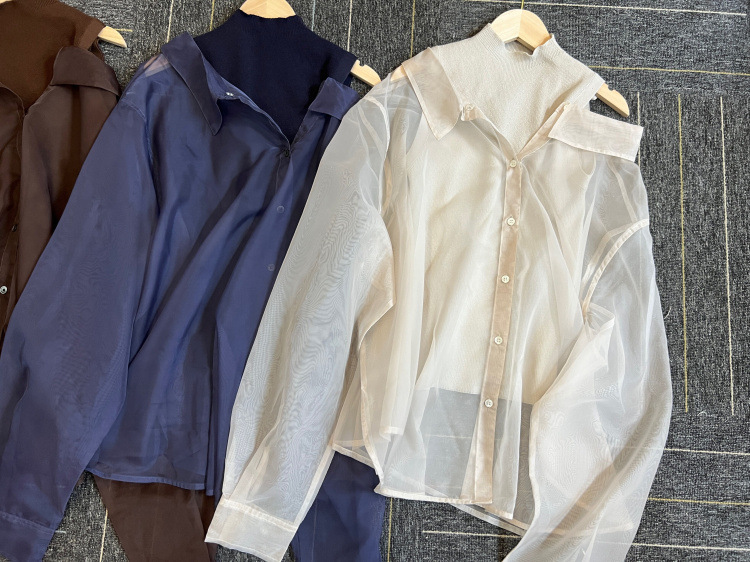 顔まわりがすっきり見えるモックネックニットと透け感のあるオーバーサイズのシースルーシャツをワントーンで揃えた異素材のレイヤード仕様で、肩まわりの抜け感を程よくキープしたデザインです。