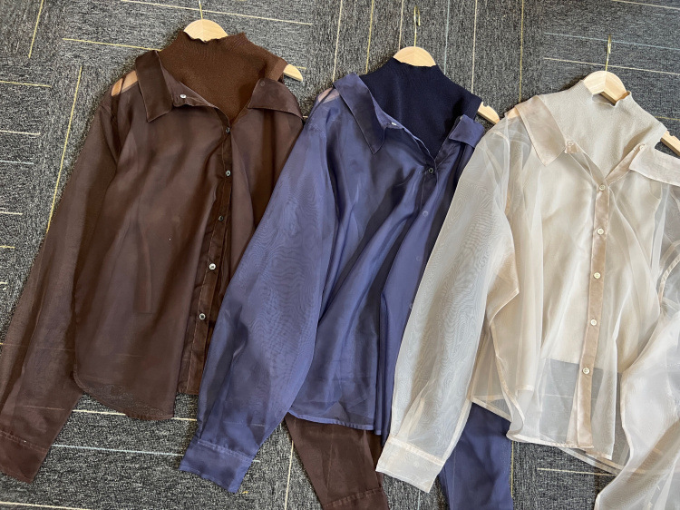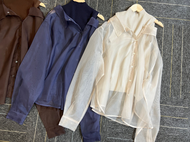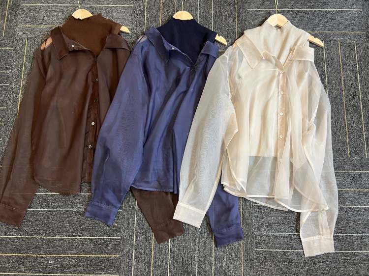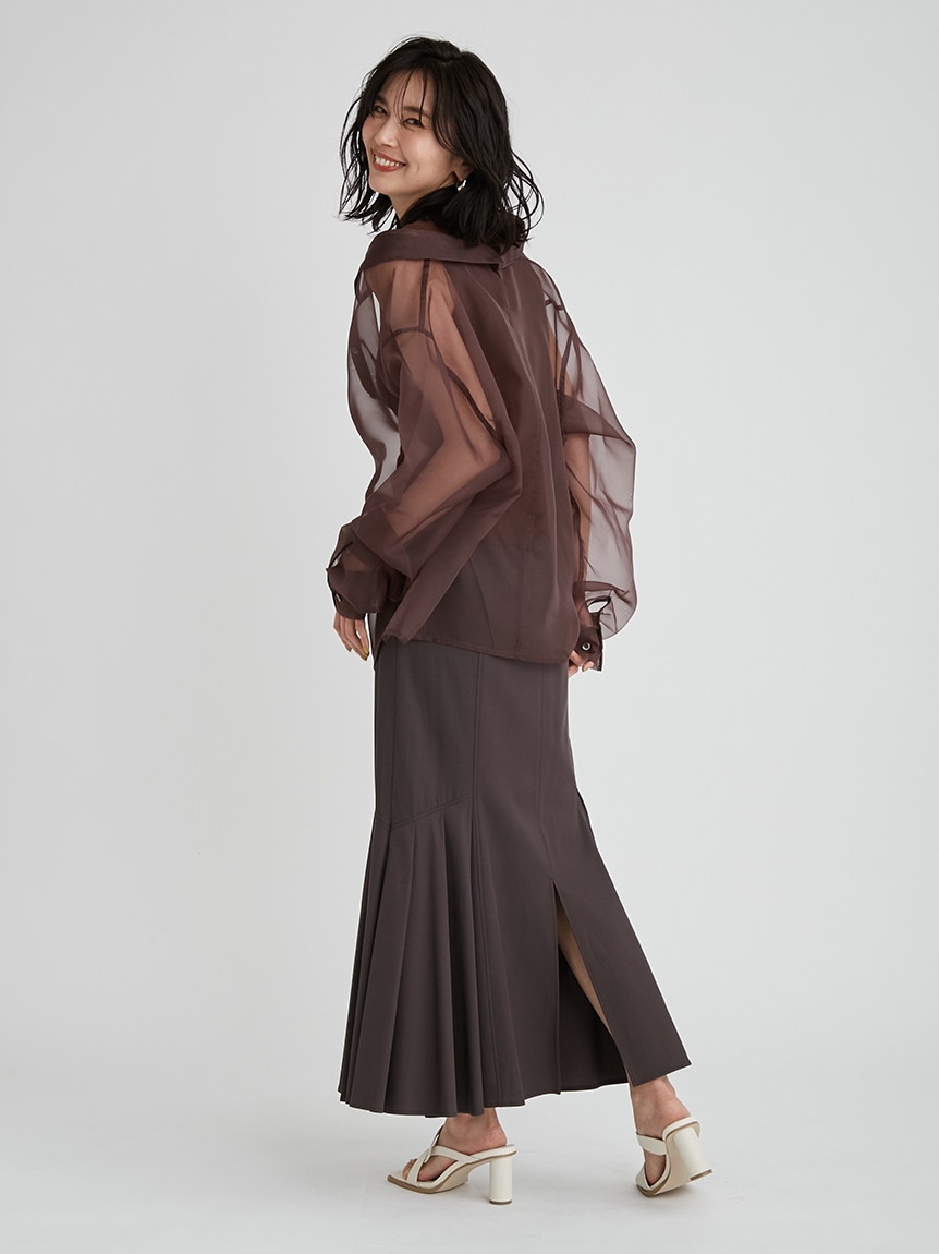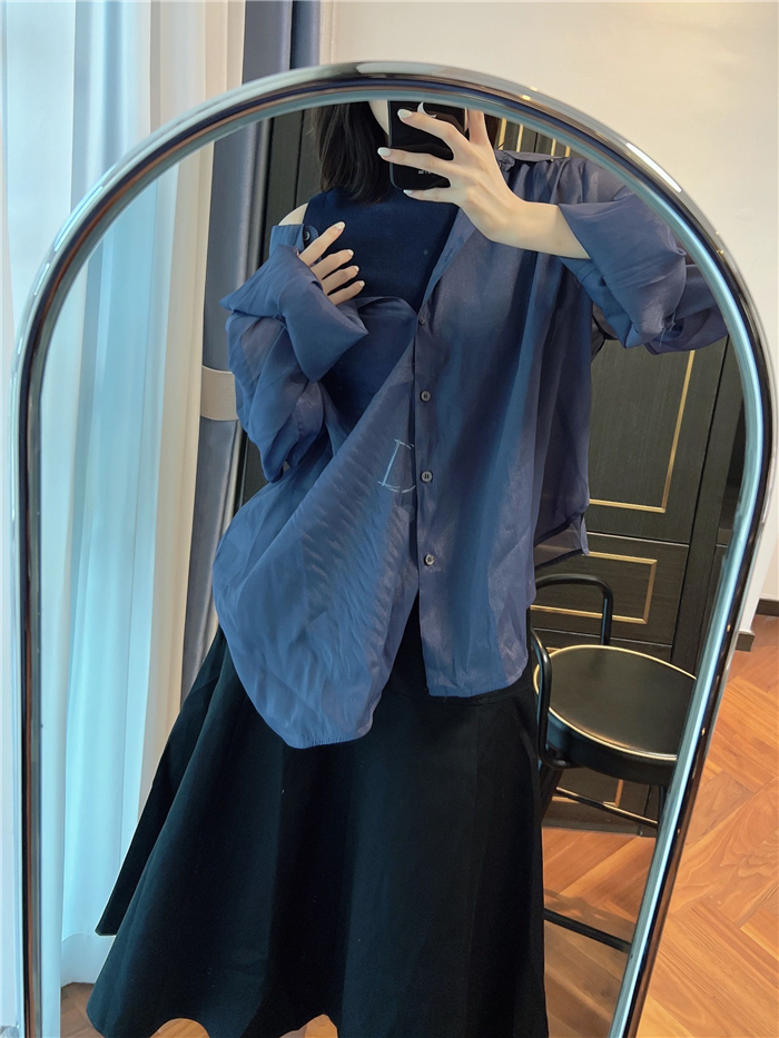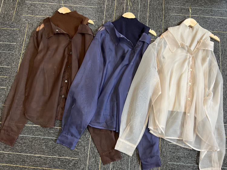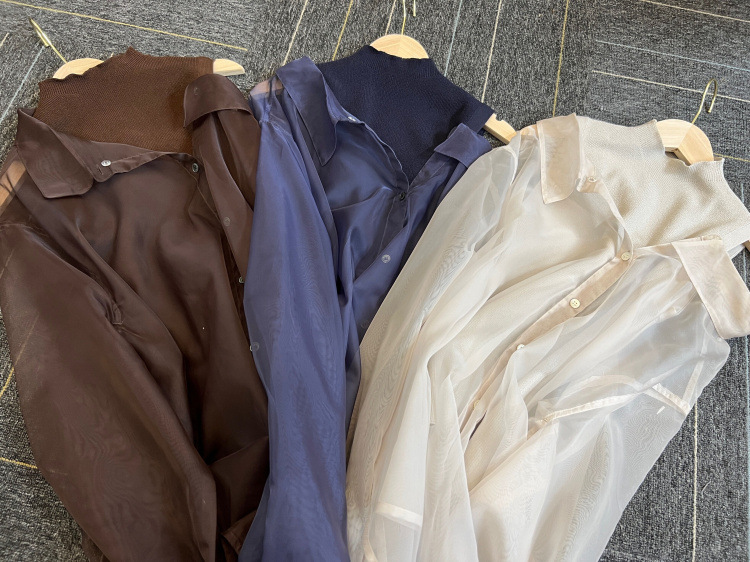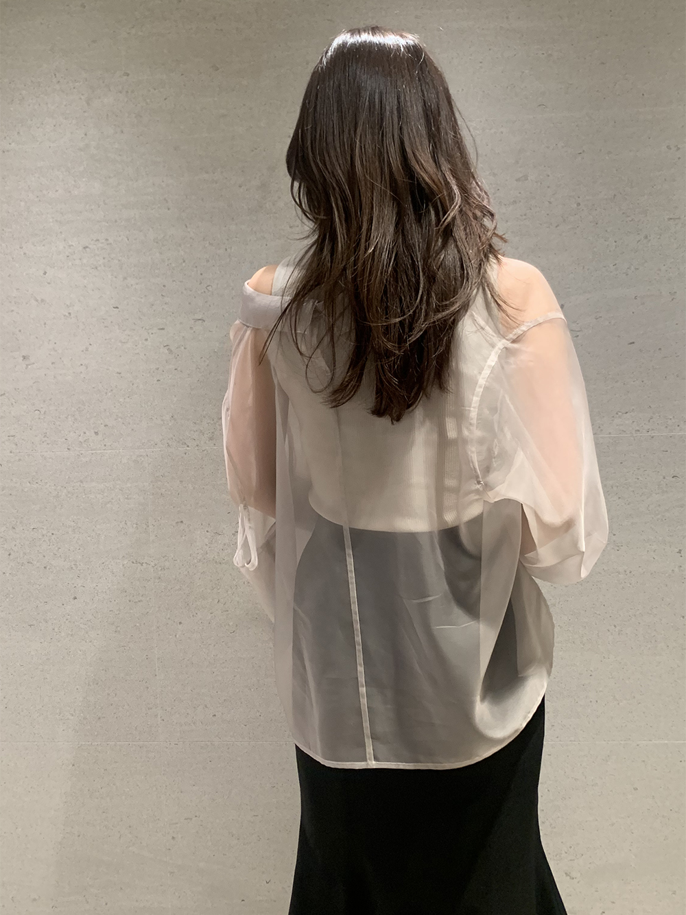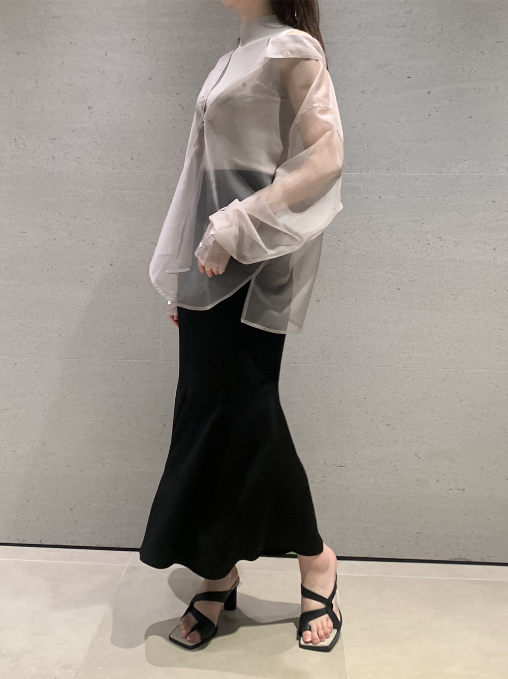 顔まわりがすっきり見えるモックネックニットと透け感のあるオーバーサイズのシースルーシャツをワントーンで揃えた異素材のレイヤード仕様で、肩まわりの抜け感を程よくキープしたデザインです。