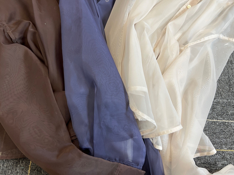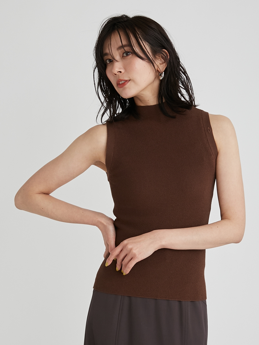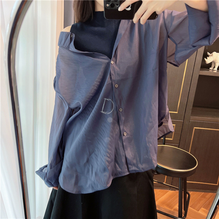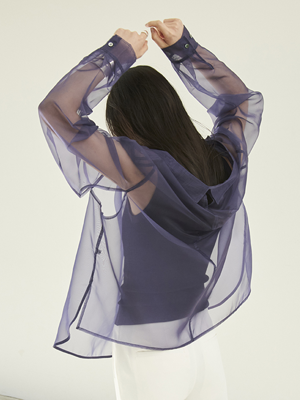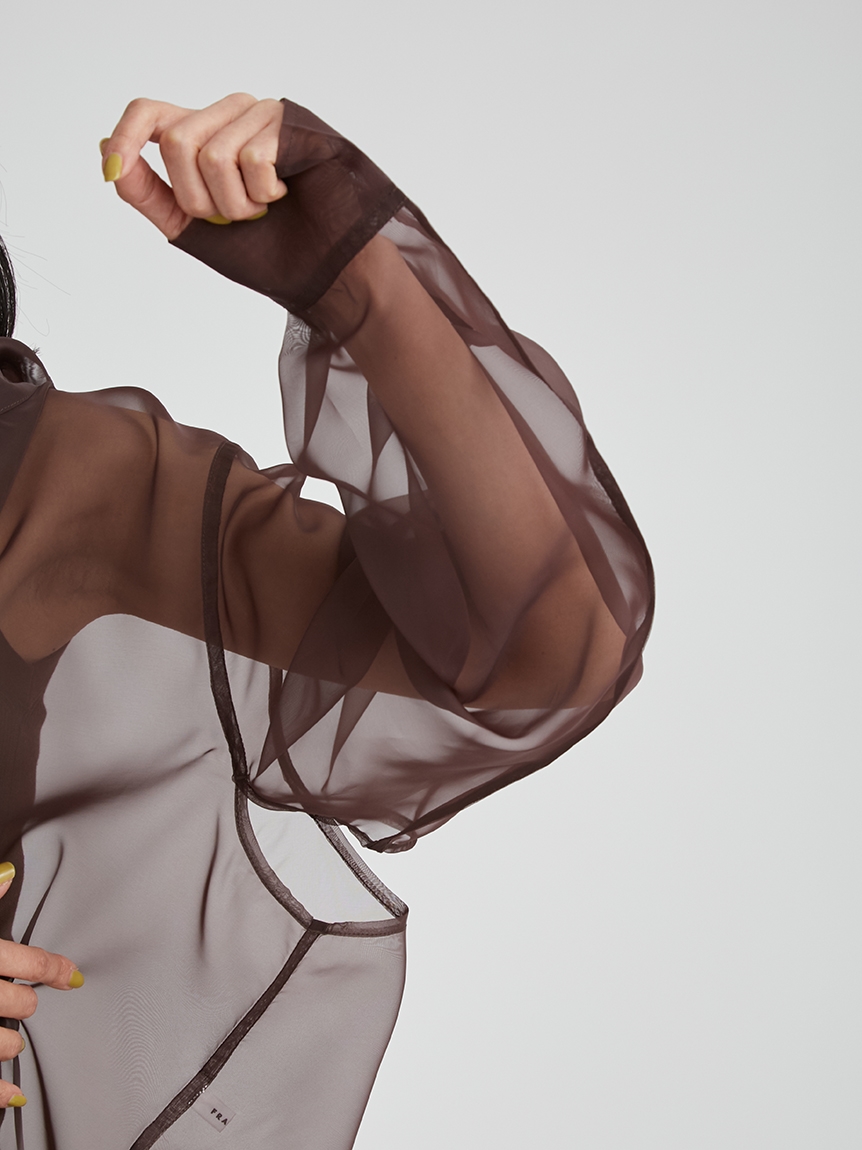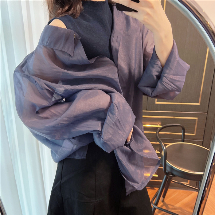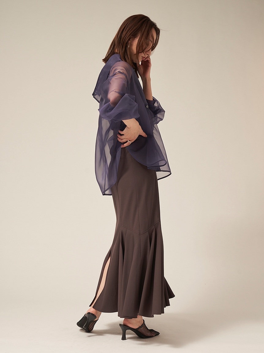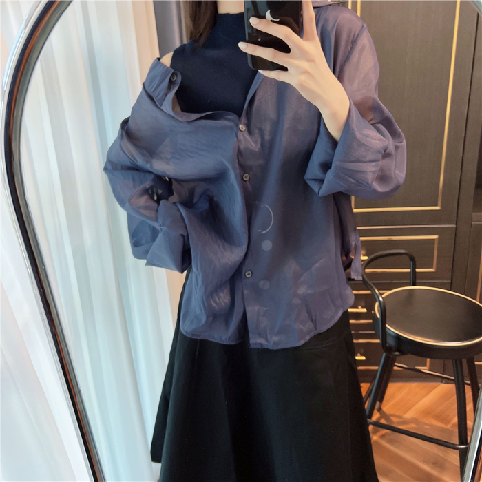 顔まわりがすっきり見えるモックネックニットと透け感のあるオーバーサイズのシースルーシャツをワントーンで揃えた異素材のレイヤード仕様で、肩まわりの抜け感を程よくキープしたデザインです。