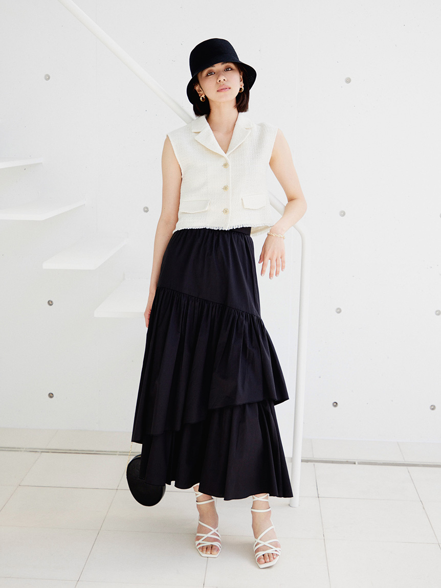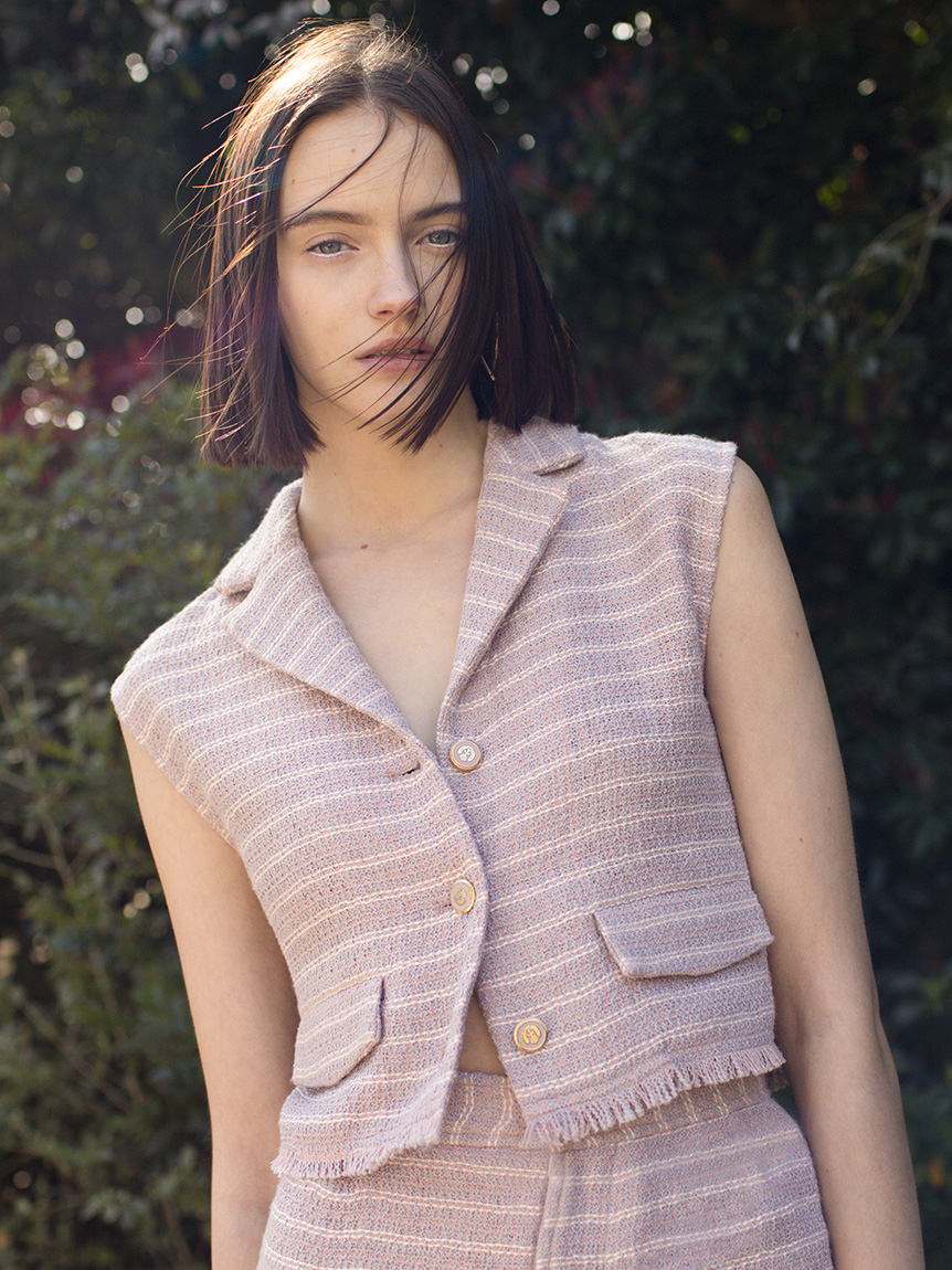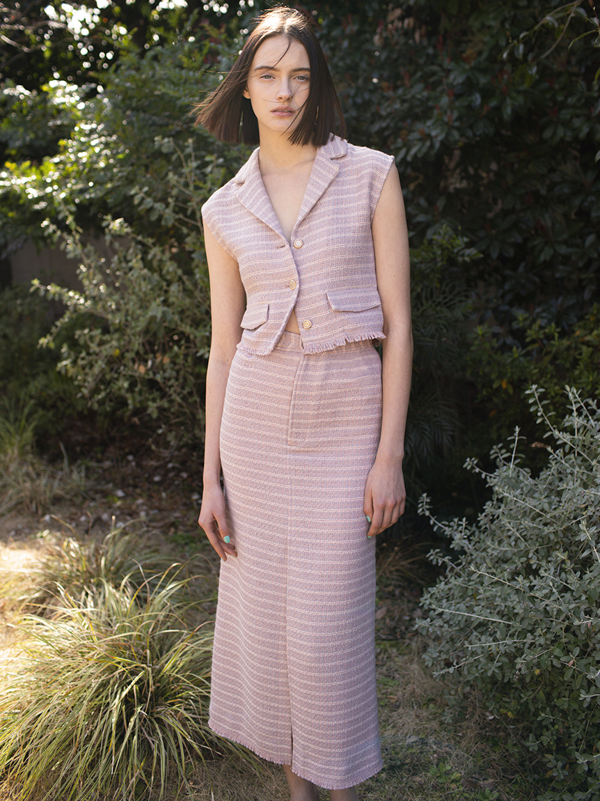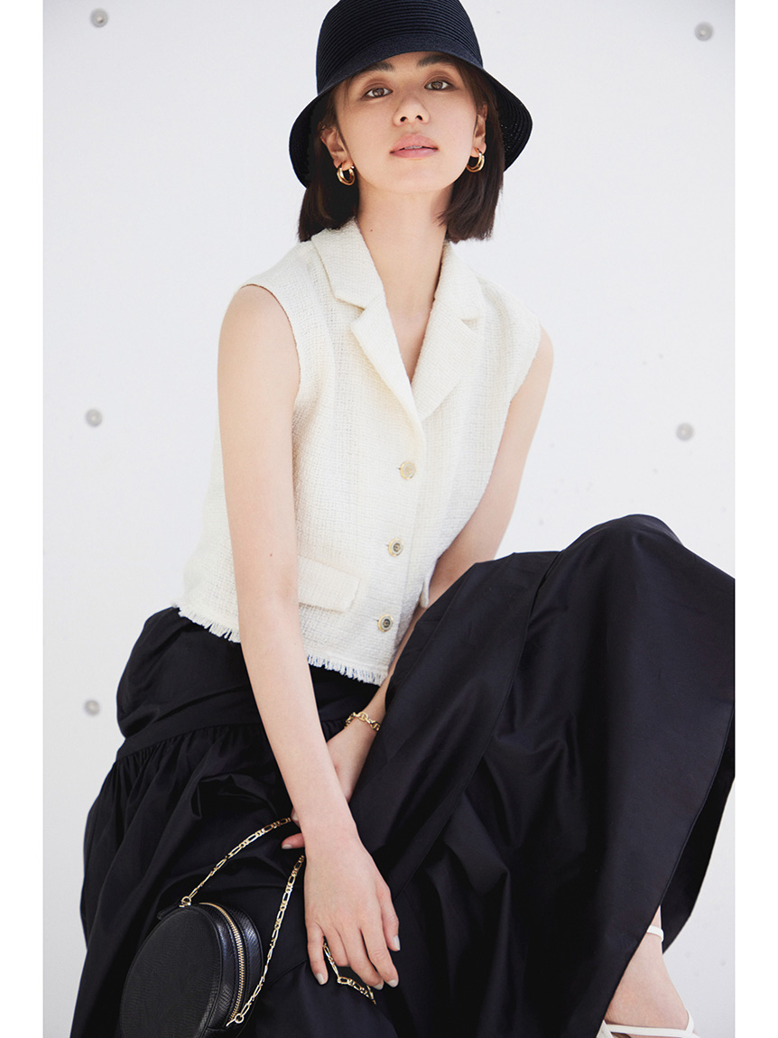 フロントボタンやフラップなど、ヴィンテージムード溢れるディテールでトレンド感たっぷりに仕上げたツイードベストトップス。すっきりとしたコンパクトなシルエットが女性らしさを感じさせる秘訣。デニムやハイウエストパンツと相性が良く、同素材を用いたスカート(SWFS222103)とセットアップでスタイリングするのもおすすめです。