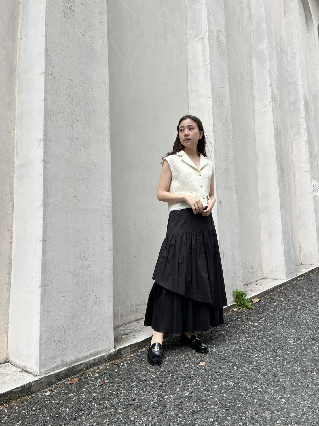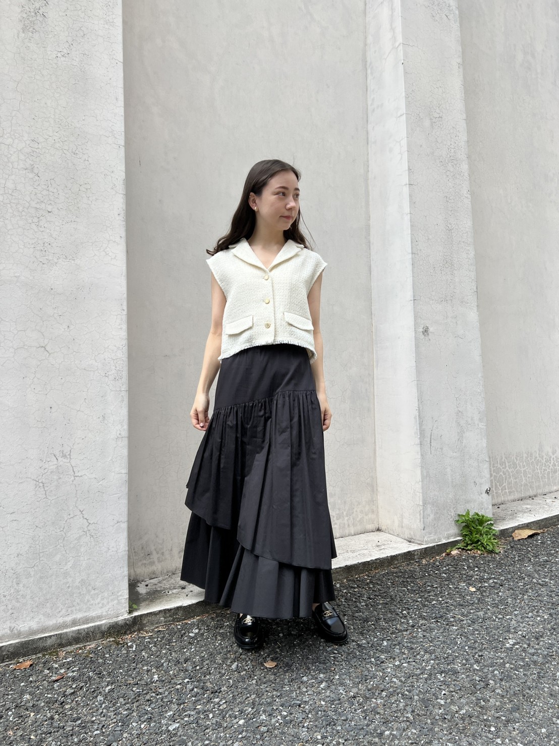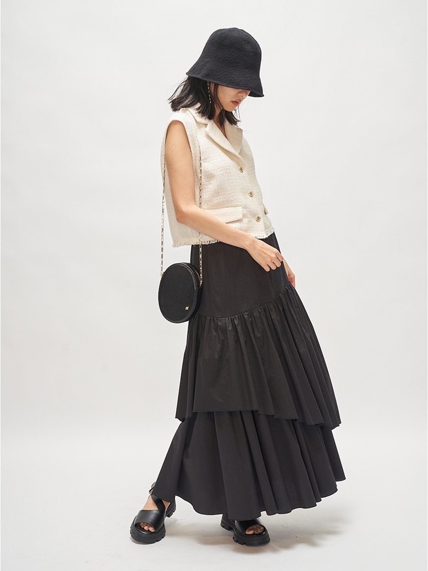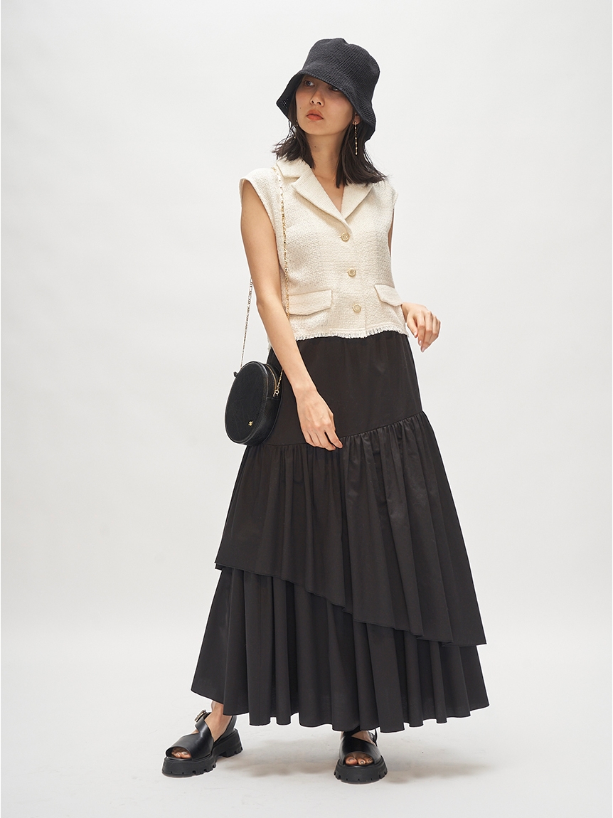 フロントボタンやフラップなど、ヴィンテージムード溢れるディテールでトレンド感たっぷりに仕上げたツイードベストトップス。すっきりとしたコンパクトなシルエットが女性らしさを感じさせる秘訣。デニムやハイウエストパンツと相性が良く、同素材を用いたスカート(SWFS222103)とセットアップでスタイリングするのもおすすめです。