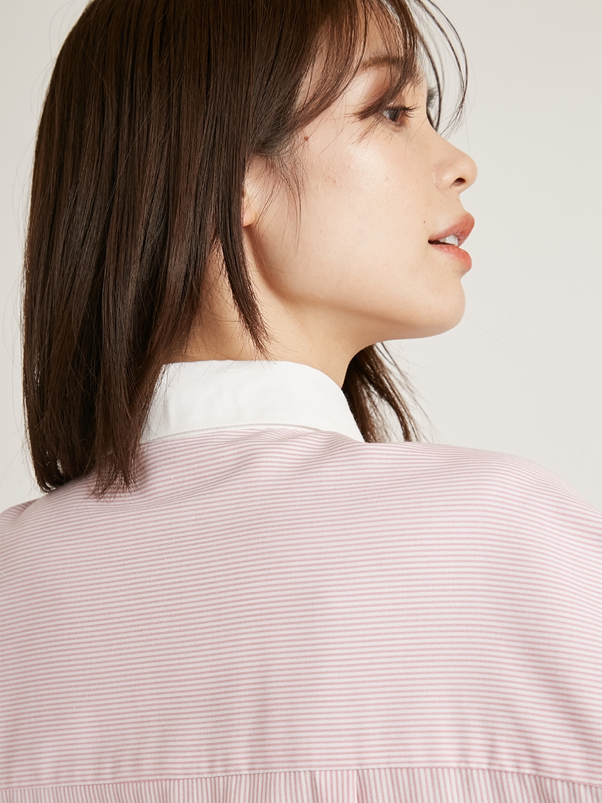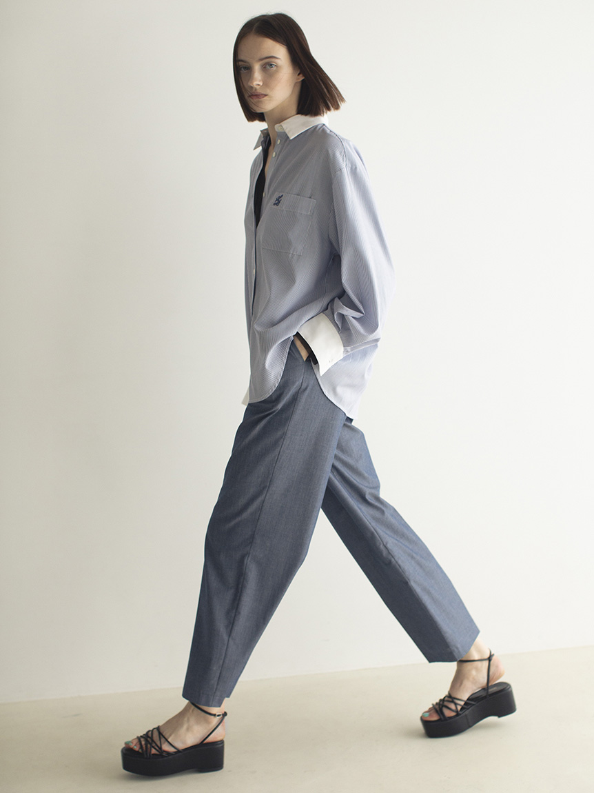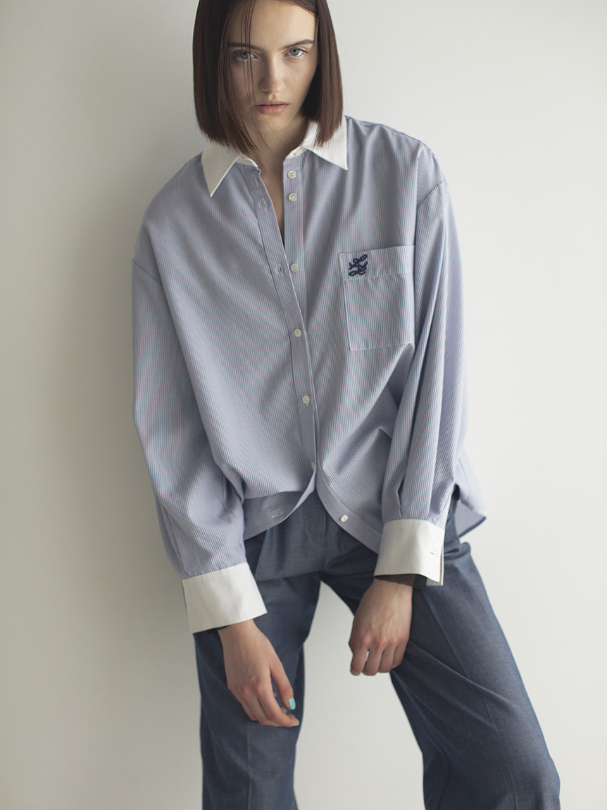 ドロップショルダーのオーバーサイズシルエットが特徴的な、スタイリングに抜け感を与えるロングスリーブシャツ。落ち感のある生地を使用することで、メンズライクなシルエットでも女性らしく仕上げています。シャツはカジュアルで着づらいと感じていた方にも着ていただけるようにと素材選びにこだわった、大人の女性におすすめの1着です。裾はインでもアウトでもバランス良く決まるようにと計算されたデザイン。パンツともスカートとも合わせやすく、幅広いコーディネートに活躍してくれます。