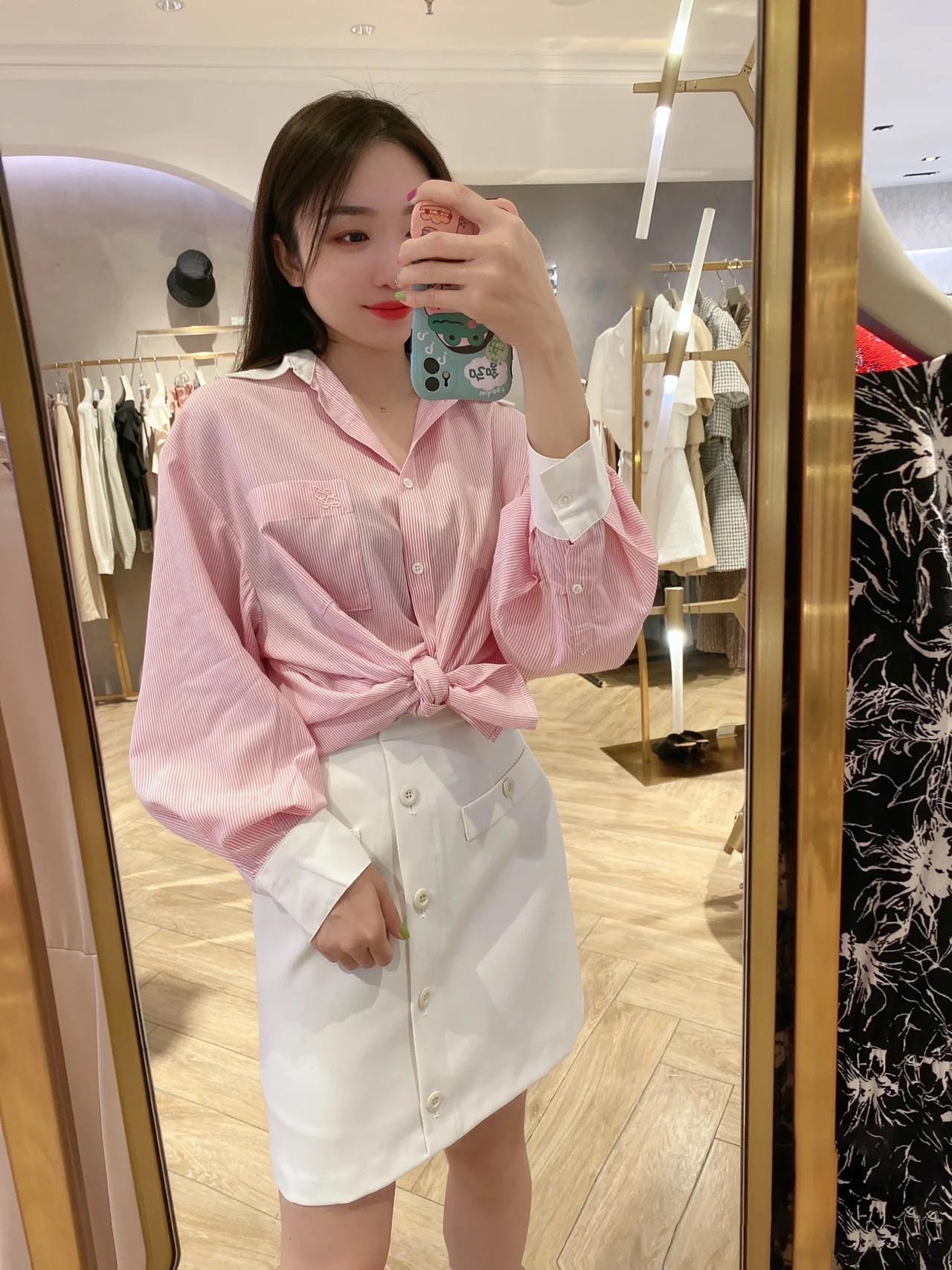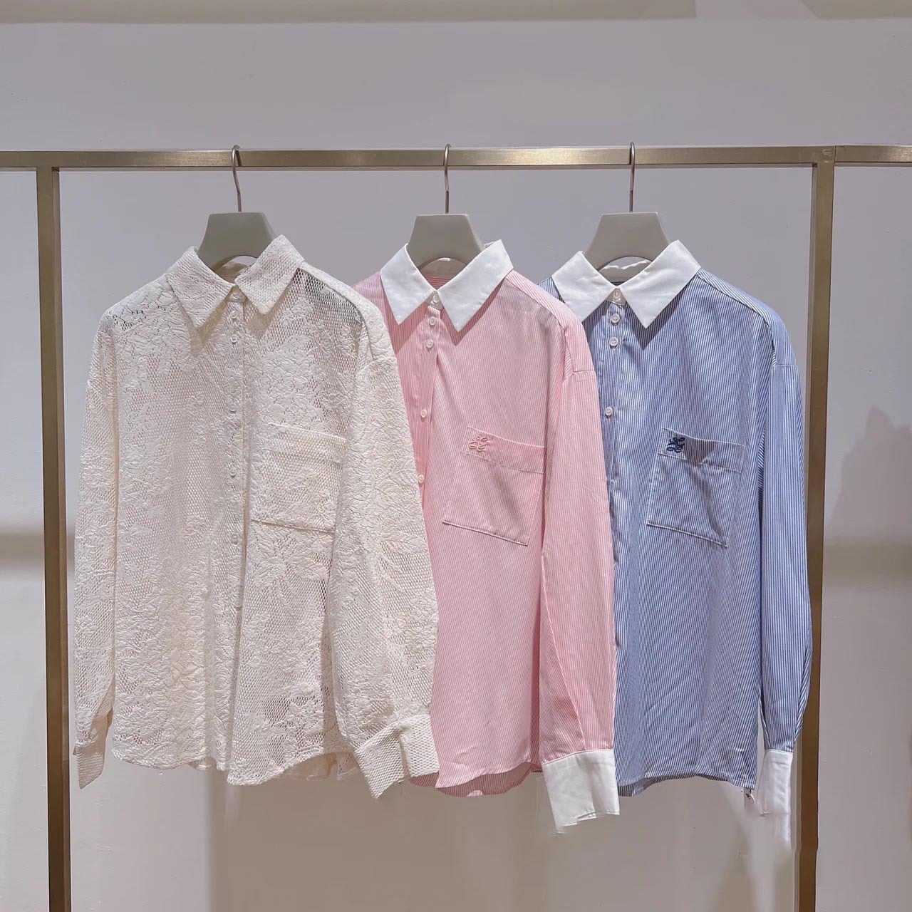 落ち感のある柔らかな生地を使用。レース素材を用いたアイボリー、定番のストライプ柄を浮かべたピンク、ブルーの3色展開です。