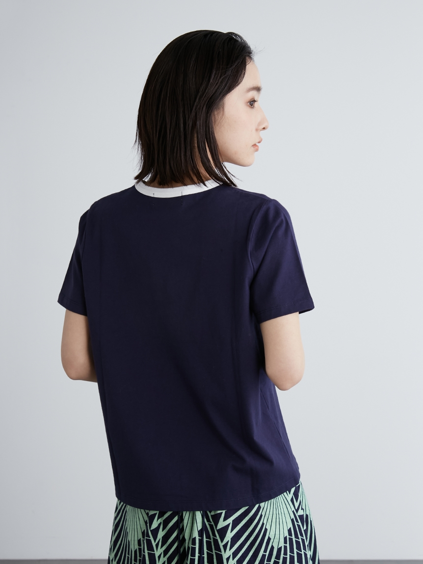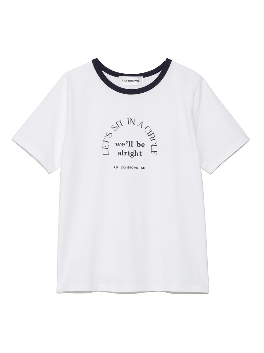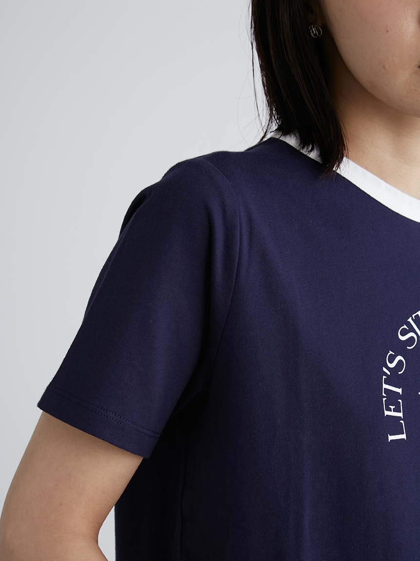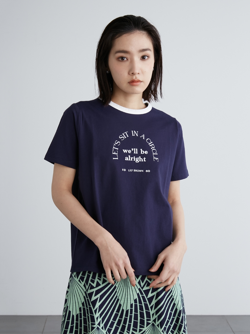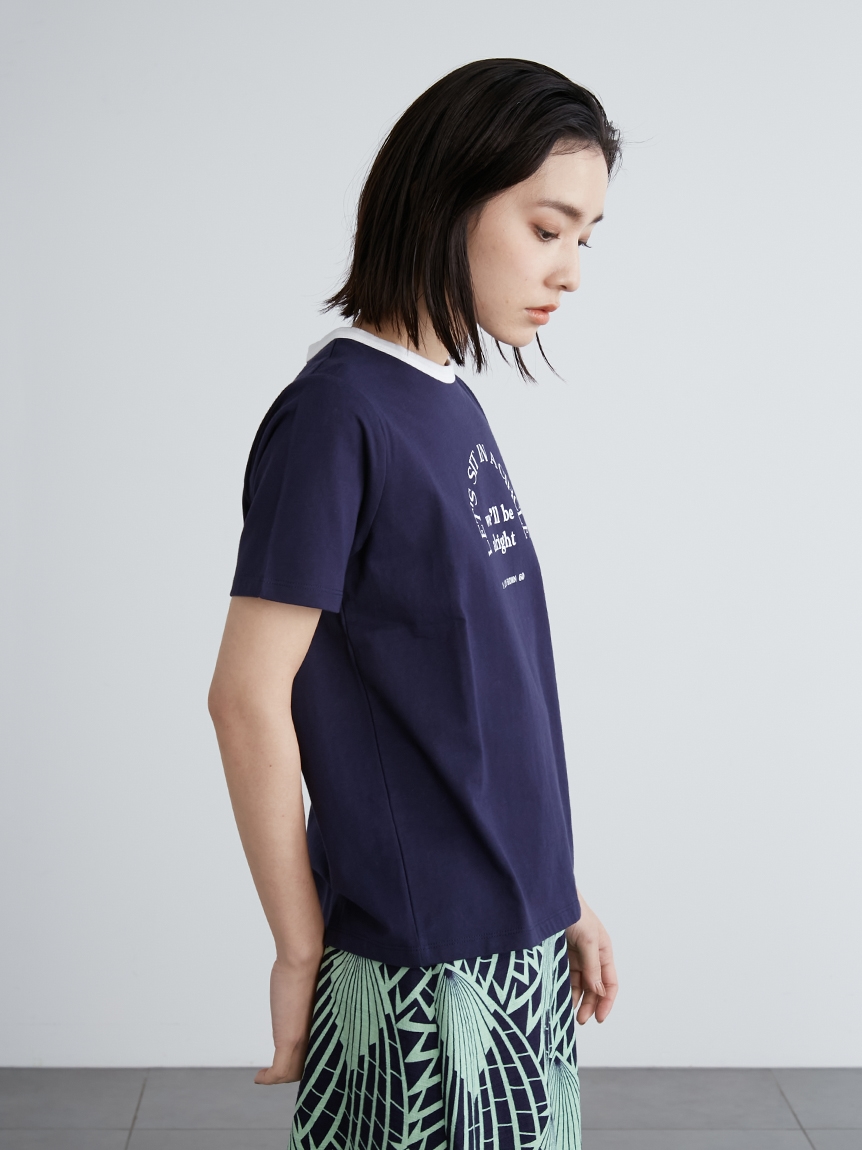 ネック部分の配色ラインが印象的な、ヴィンテージムード薫るリンガーTシャツ。フロントにメッセージロゴをプリントし、大人カジュアルなルックスに仕上げています。すっきりとしたシンプルなシルエットが女性らしさを感じさせる秘訣。様々なボトムと合わせやすく、存在感のある柄物のスカートと合わせれば一気に夏らしいコーディネートが完成します。