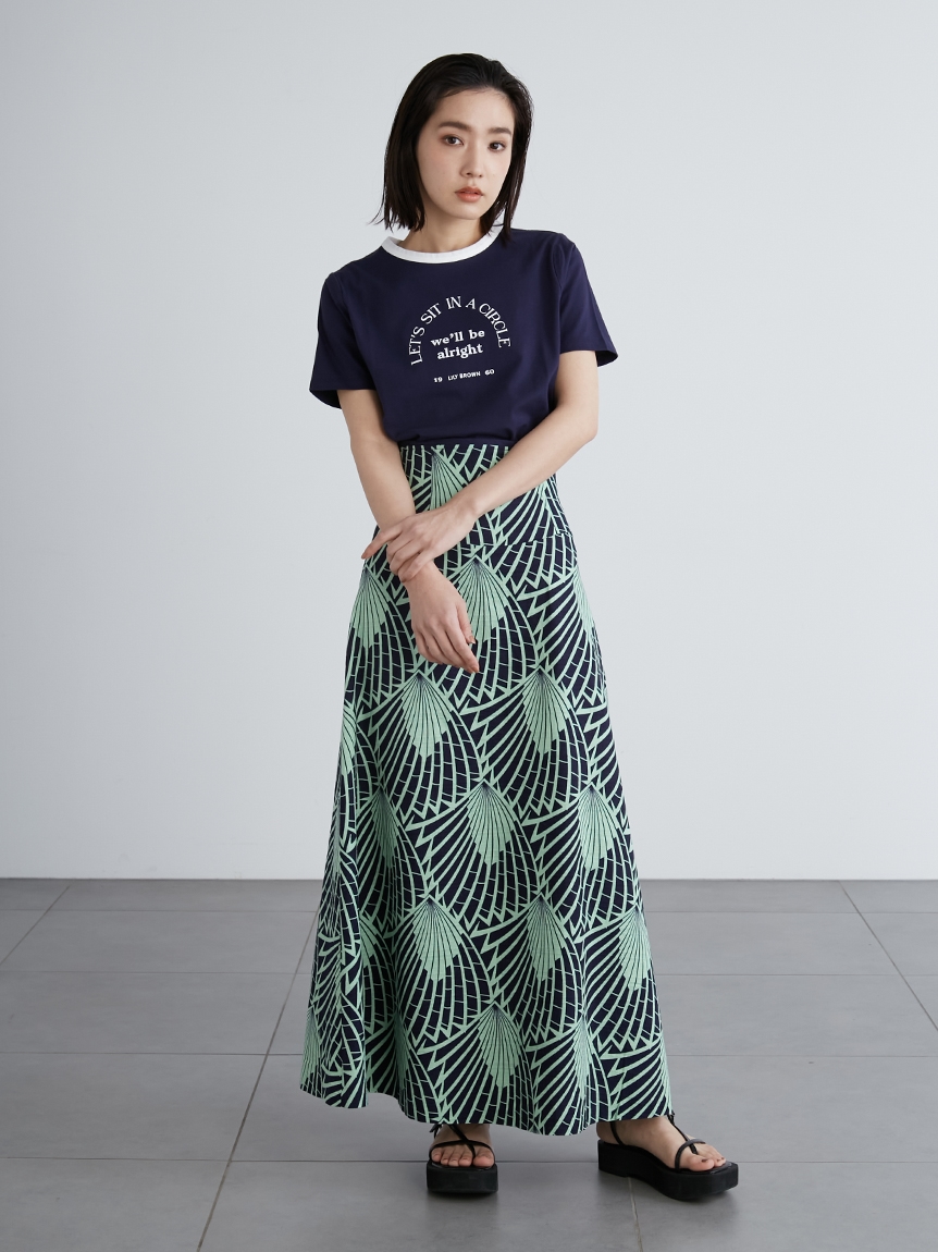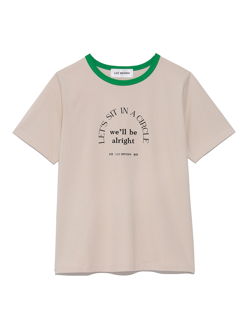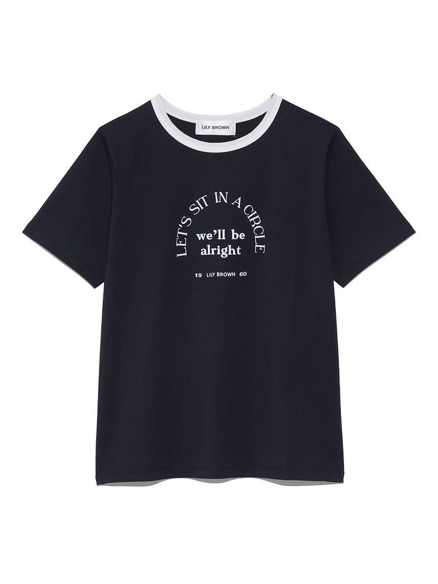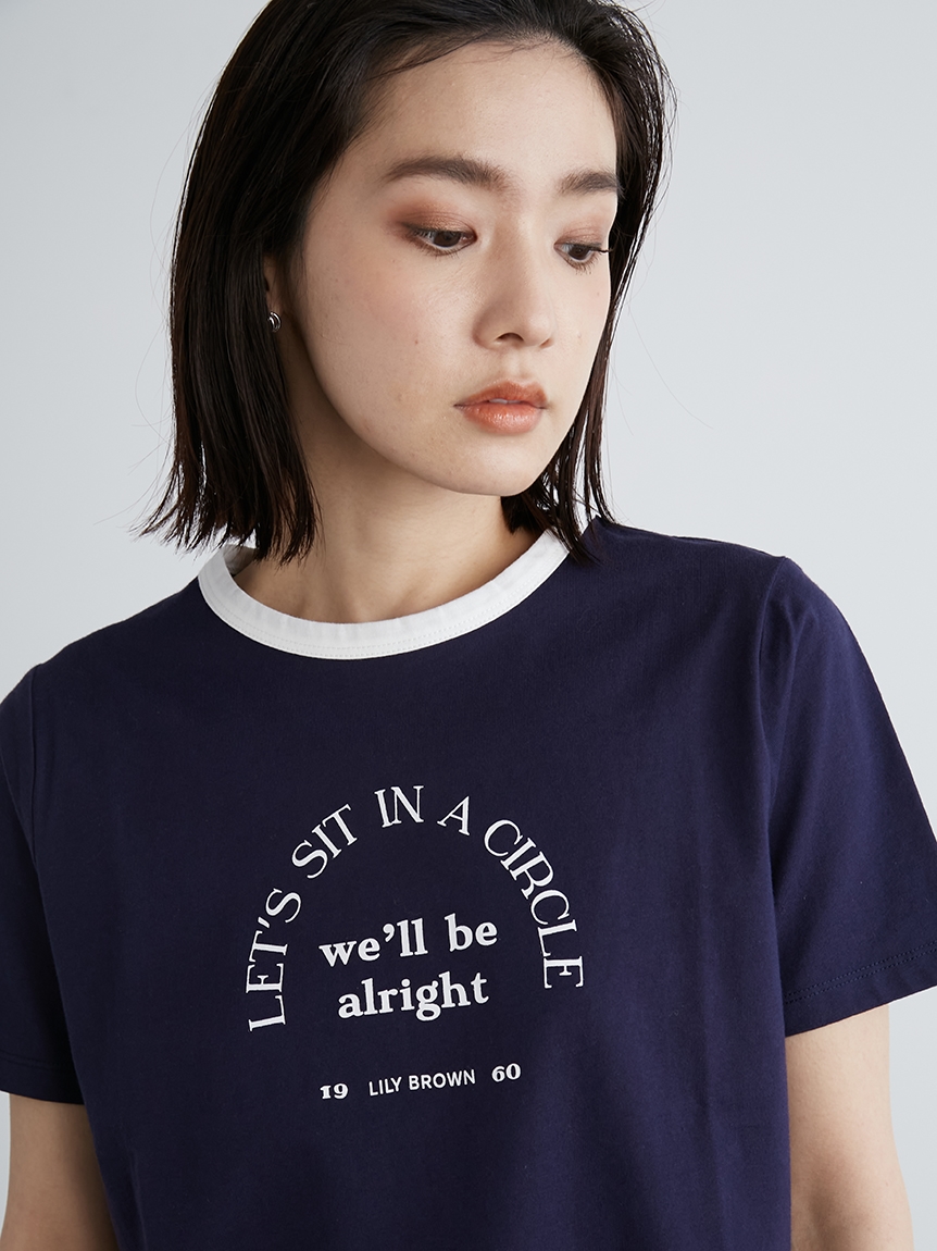 ネック部分の配色ラインが印象的な、ヴィンテージムード薫るリンガーTシャツ。フロントにメッセージロゴをプリントし、大人カジュアルなルックスに仕上げています。すっきりとしたシンプルなシルエットが女性らしさを感じさせる秘訣。様々なボトムと合わせやすく、存在感のある柄物のスカートと合わせれば一気に夏らしいコーディネートが完成します。