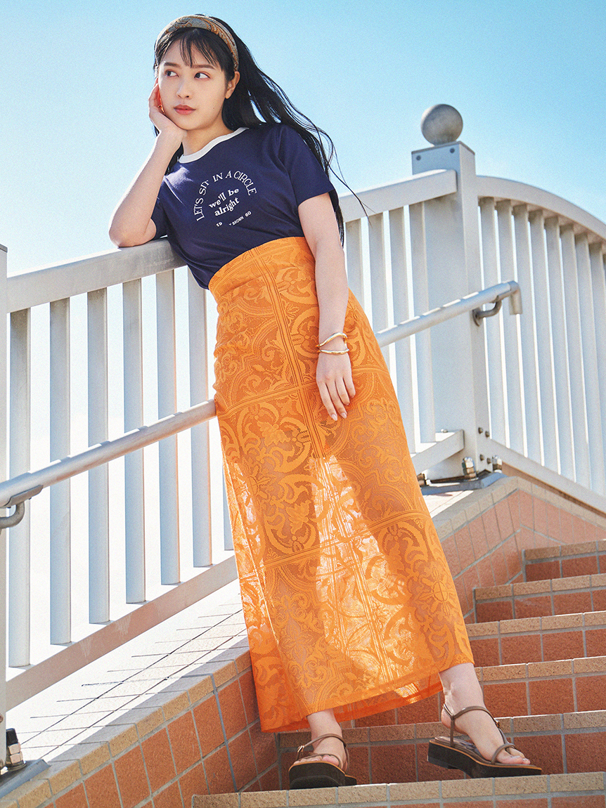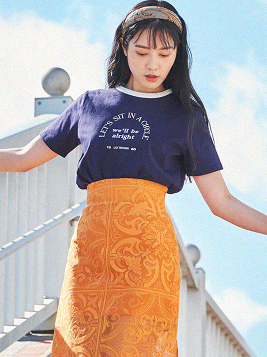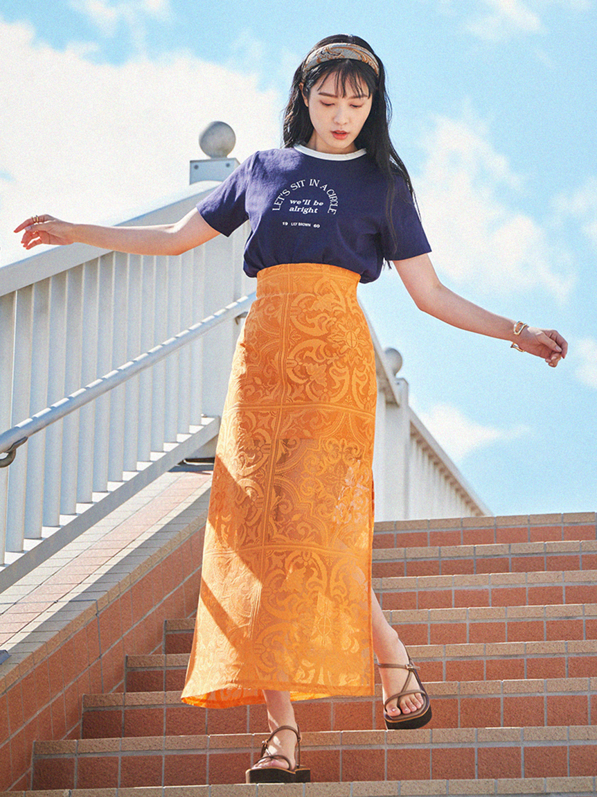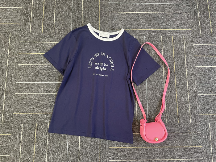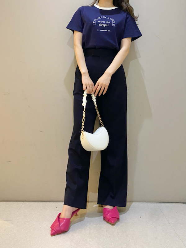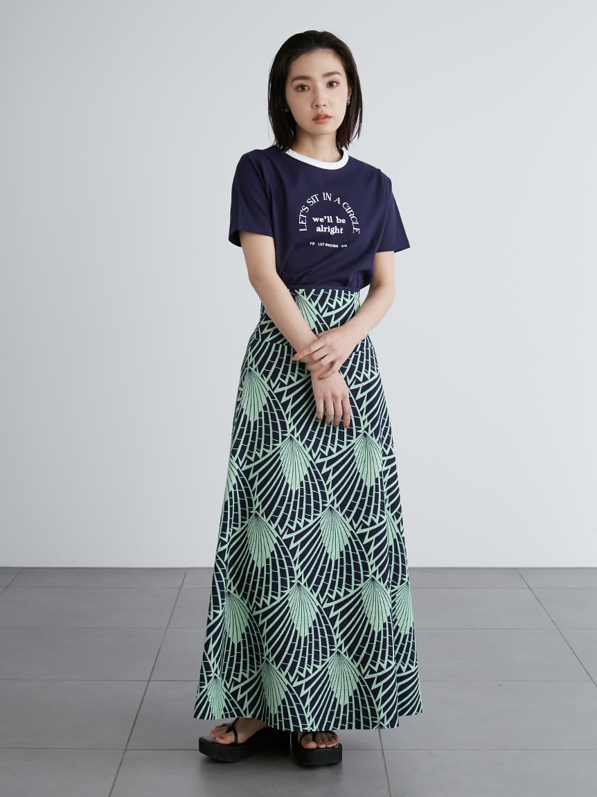 ネック部分の配色ラインが印象的な、ヴィンテージムード薫るリンガーTシャツ。フロントにメッセージロゴをプリントし、大人カジュアルなルックスに仕上げています。すっきりとしたシンプルなシルエットが女性らしさを感じさせる秘訣。様々なボトムと合わせやすく、存在感のある柄物のスカートと合わせれば一気に夏らしいコーディネートが完成します。