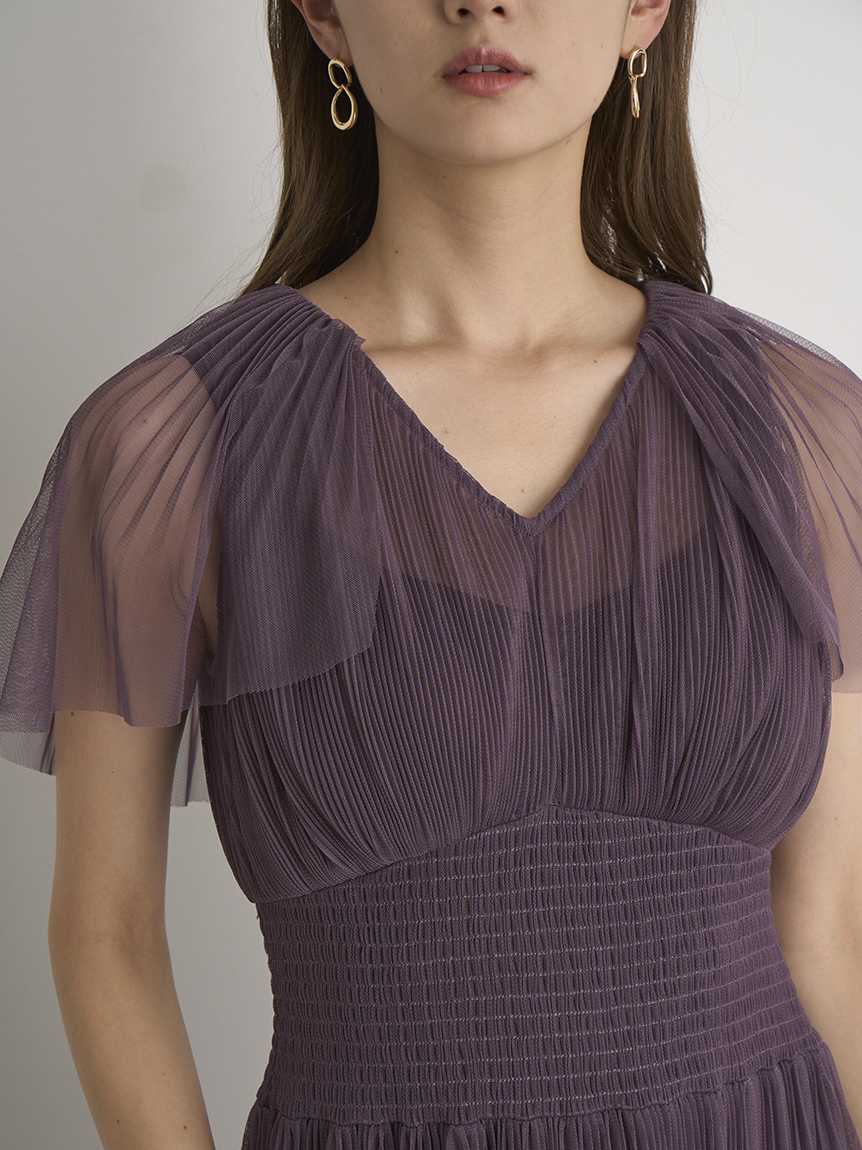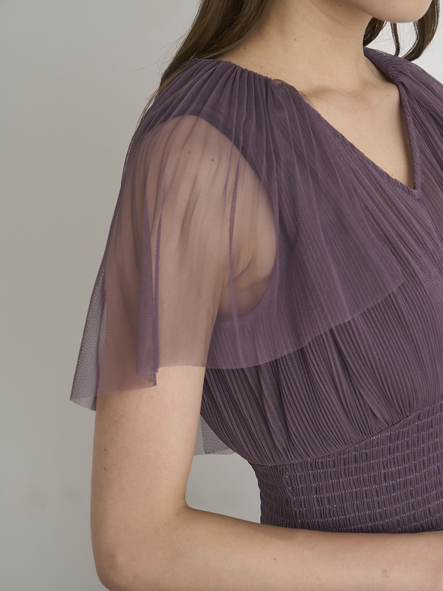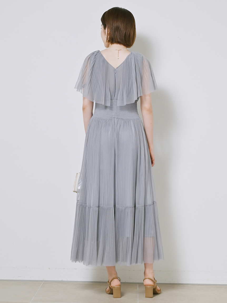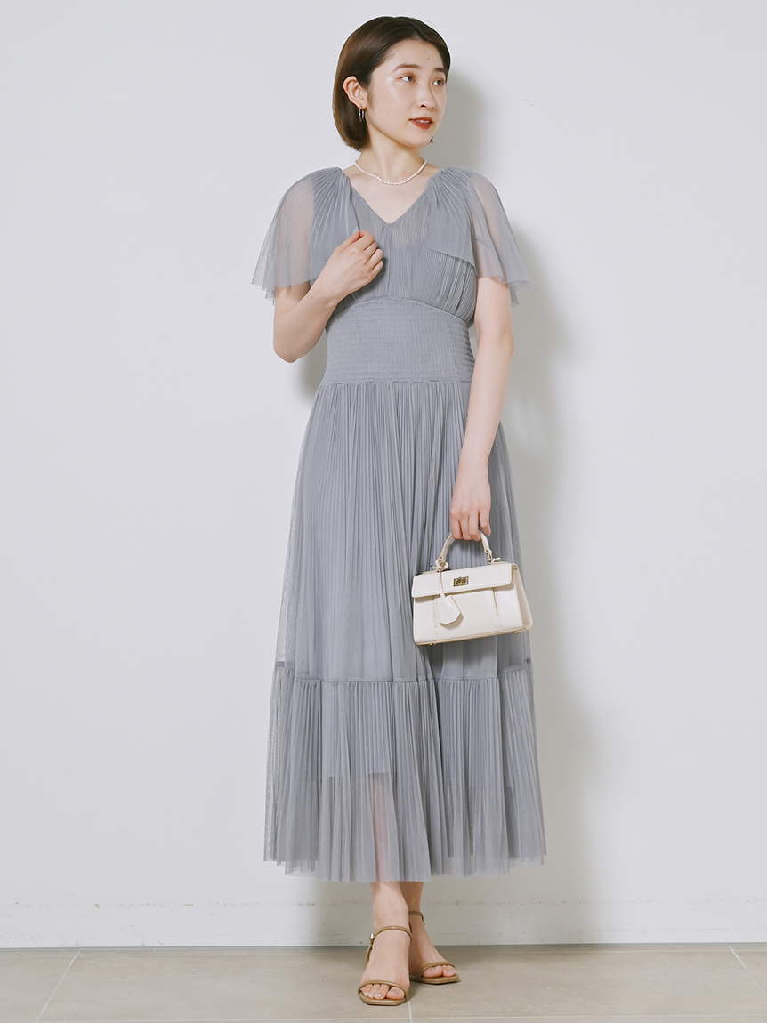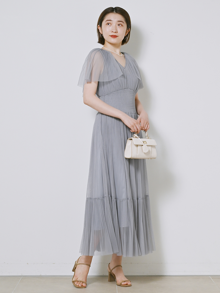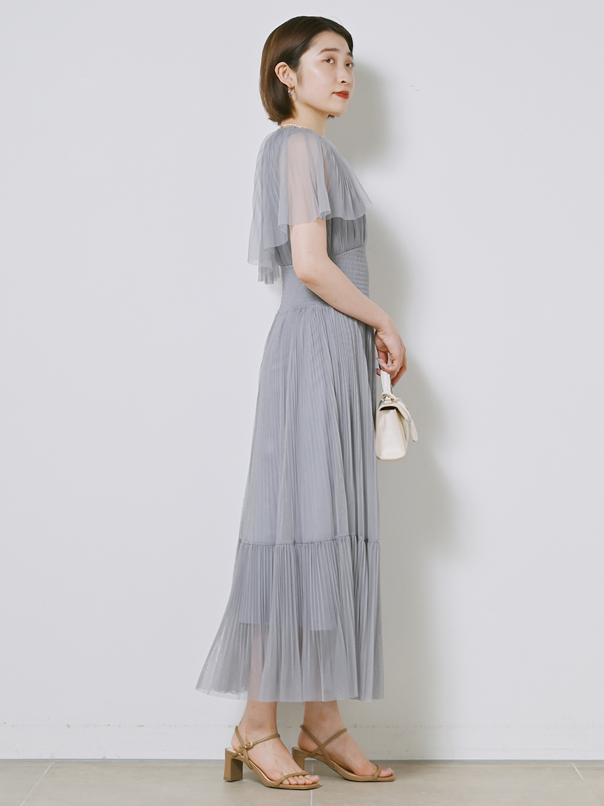 贅沢に細やかなプリーツを効かせた、エレガントで華やかなチュールドレス。ひらりと広がるケープ風の袖でトレンド感も押さえています。ウエスト部分はシャーリングでキュッと締めることでメリハリのあるシルエットをメイク。スタイルアップ効果を存分に期待できます。合わせるアイテム次第でオケージョンシーンからデイリーまで幅広く活躍してくれる万能な1着です。
