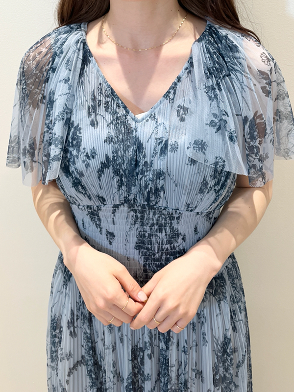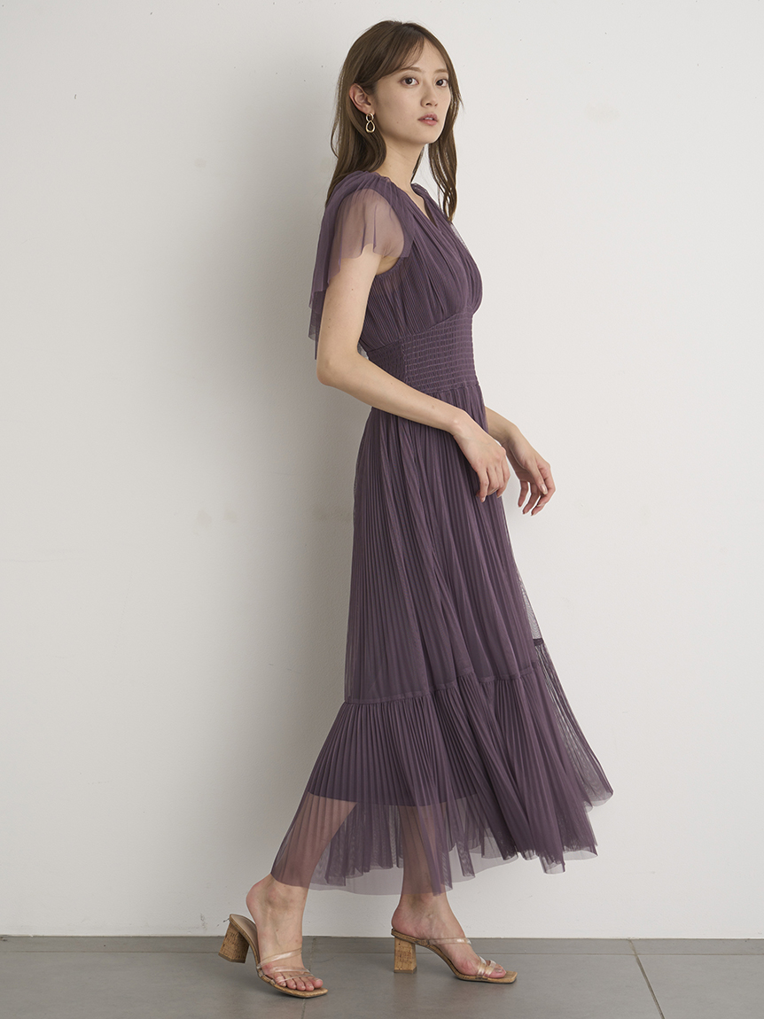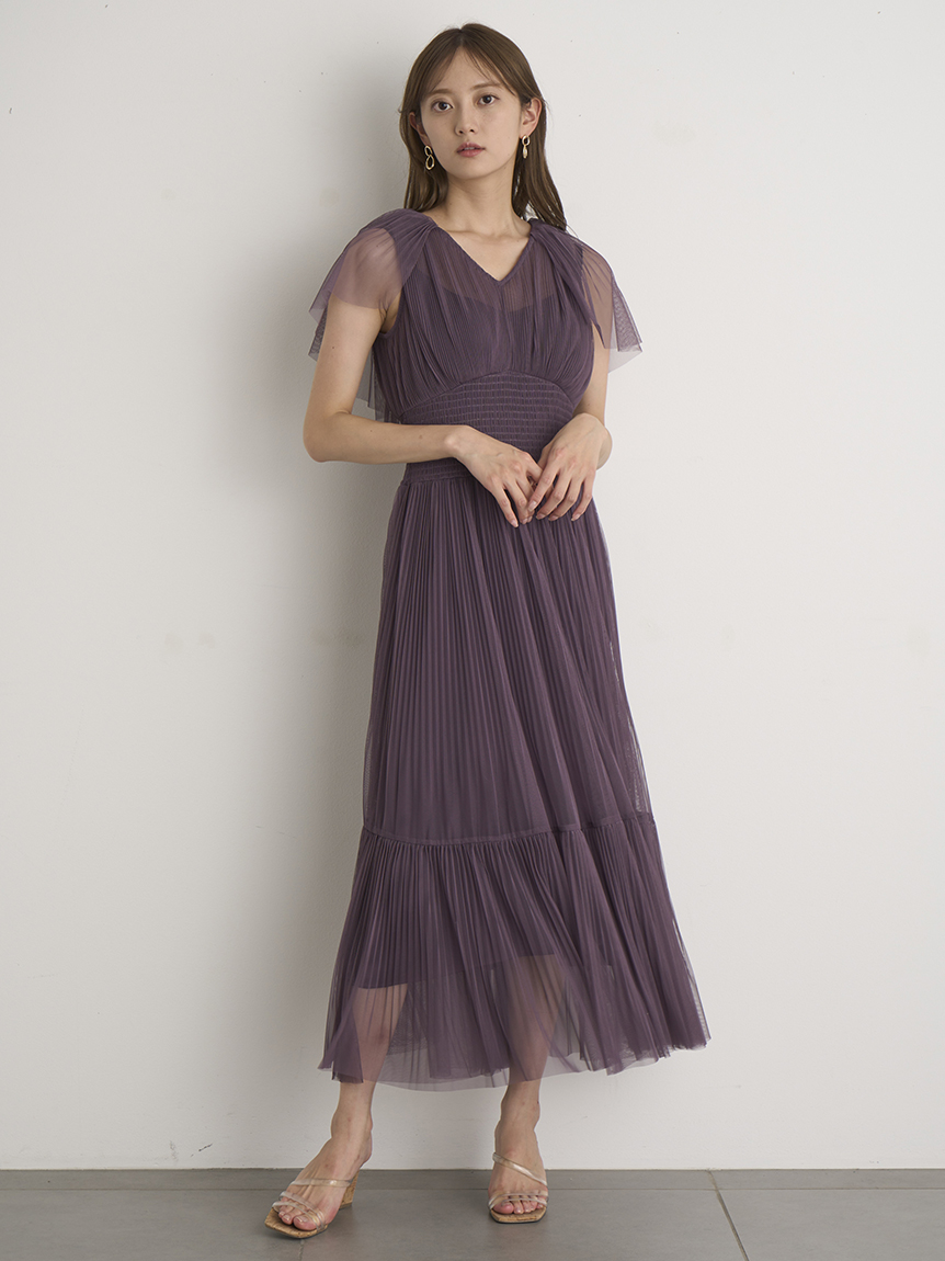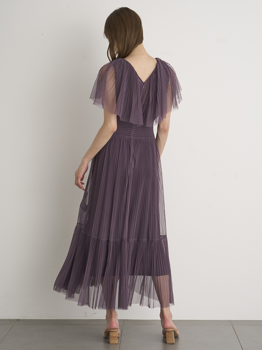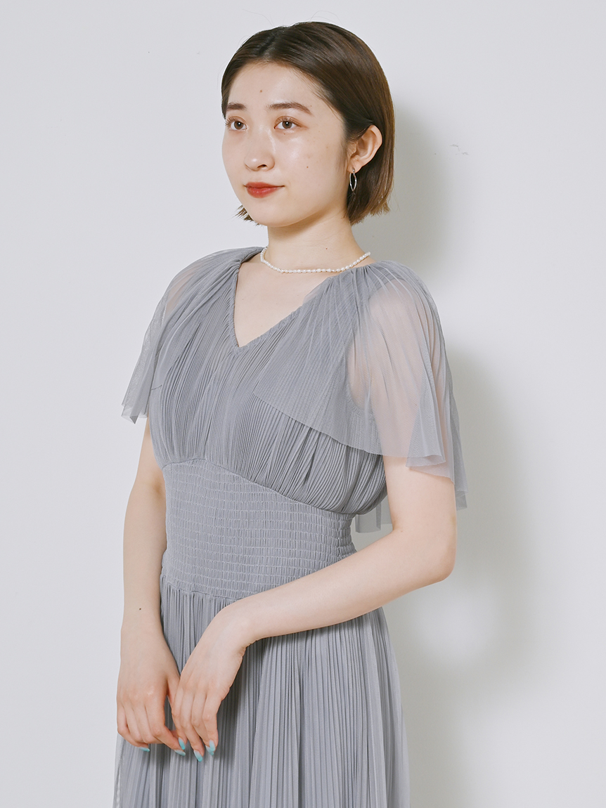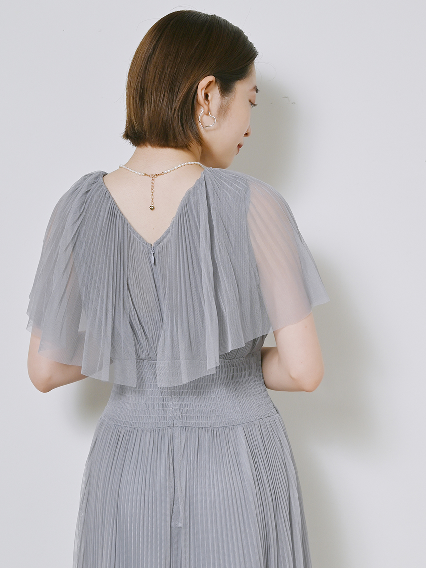 贅沢に細やかなプリーツを効かせた、エレガントで華やかなチュールドレス。ひらりと広がるケープ風の袖でトレンド感も押さえています。ウエスト部分はシャーリングでキュッと締めることでメリハリのあるシルエットをメイク。スタイルアップ効果を存分に期待できます。合わせるアイテム次第でオケージョンシーンからデイリーまで幅広く活躍してくれる万能な1着です。